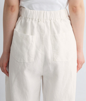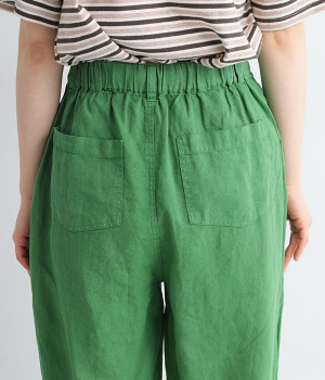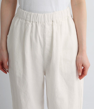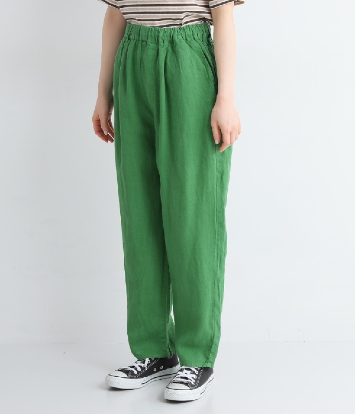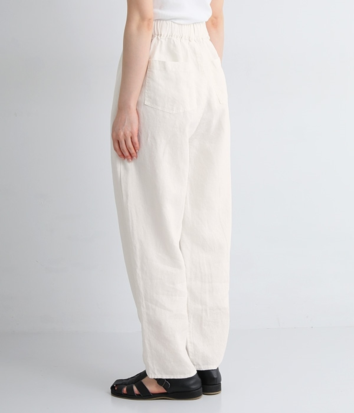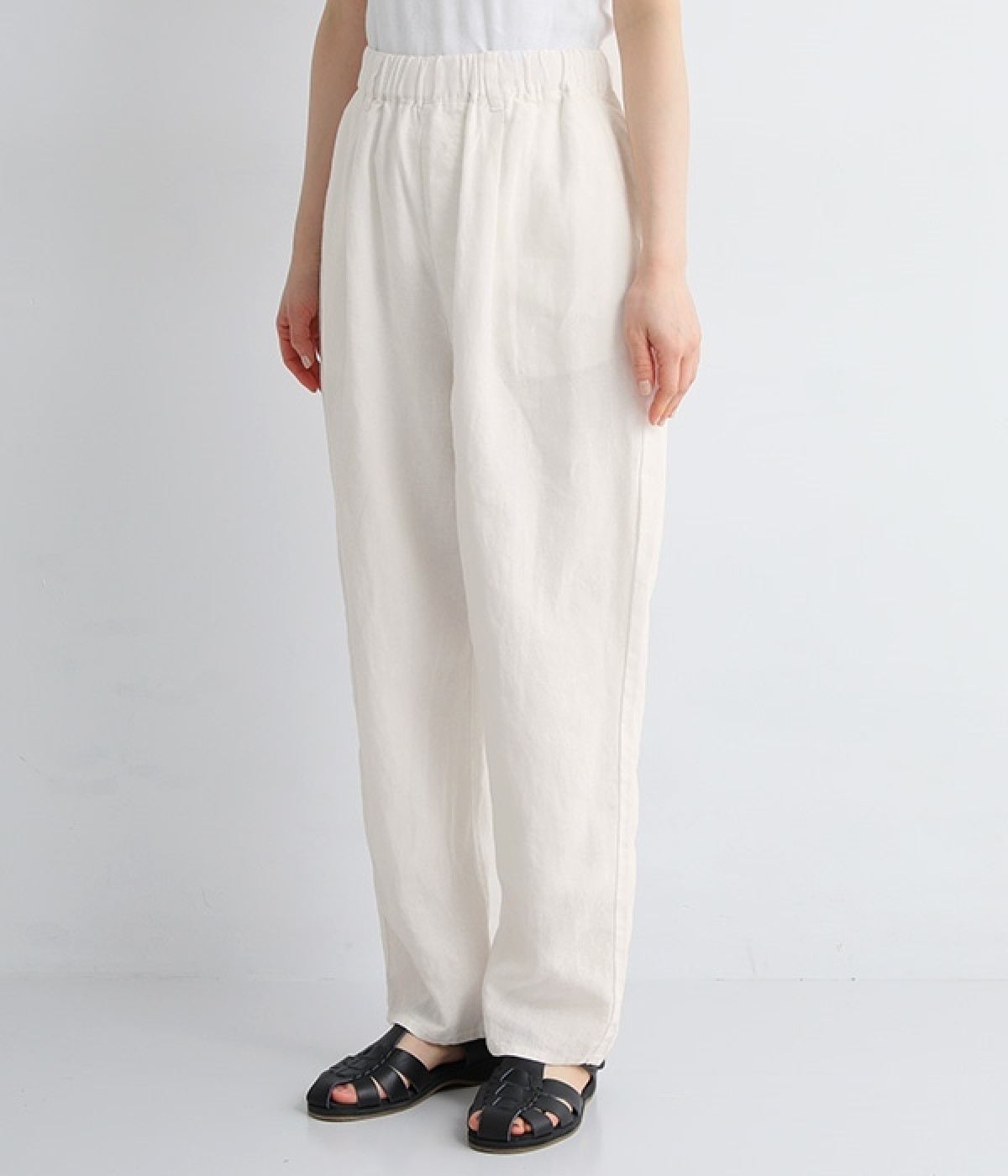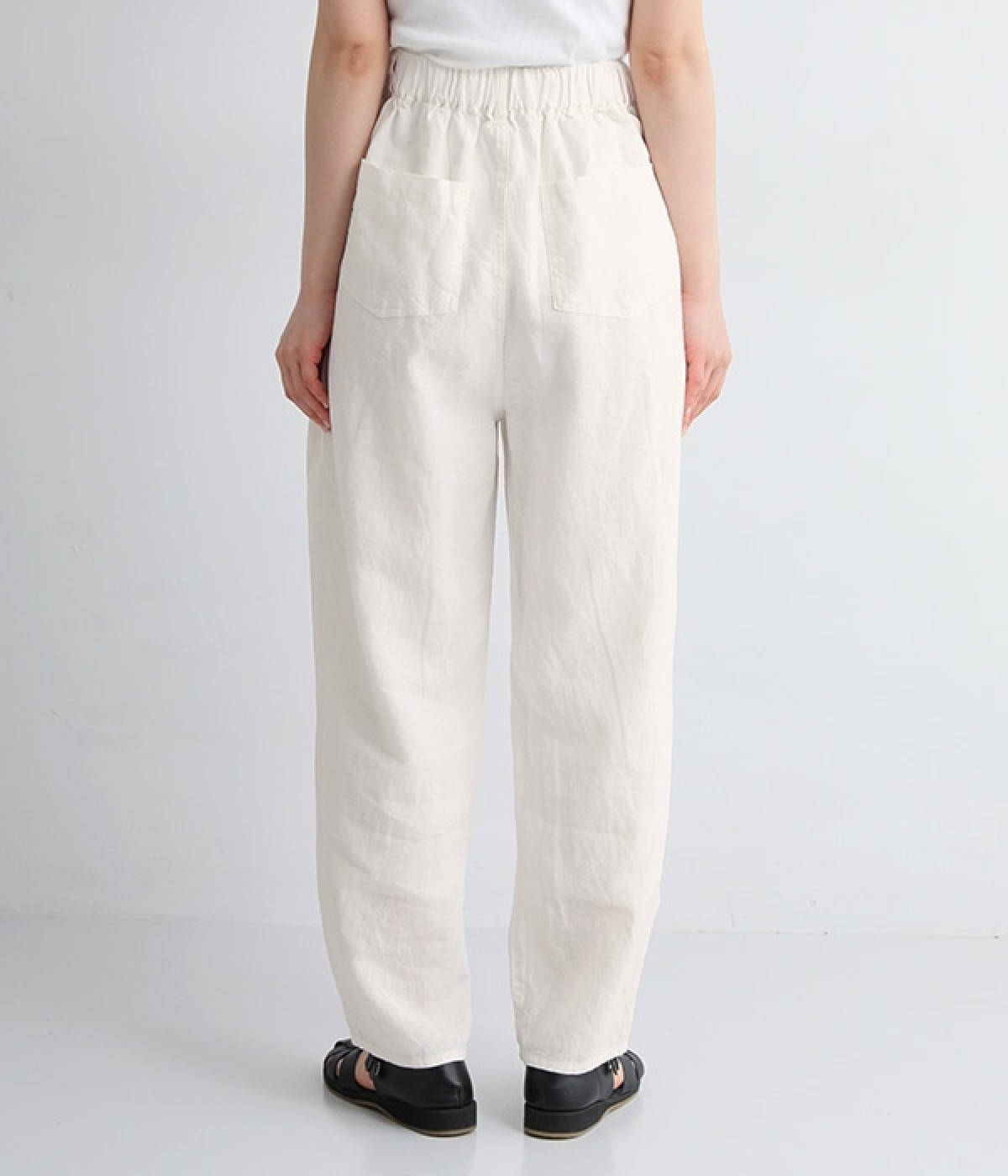 製品染め&バイオ加工をほどこして、はきなれたようなやわらかな風合いに仕上げたパンツ。リネン特有のざらつきがおさえられ、肌にさらっと心地良いのが魅力です。裾にかけてシェイプしたテーパード型で、フルレングスでも足元はすっきりと。ウエストにしっかりと密着し、腰まわりのふくらみをおさえてくれる平らなゴムを腰に通しています。単体使いだけにとどまらず、ワンピースのインナー使いにもおすすめ。