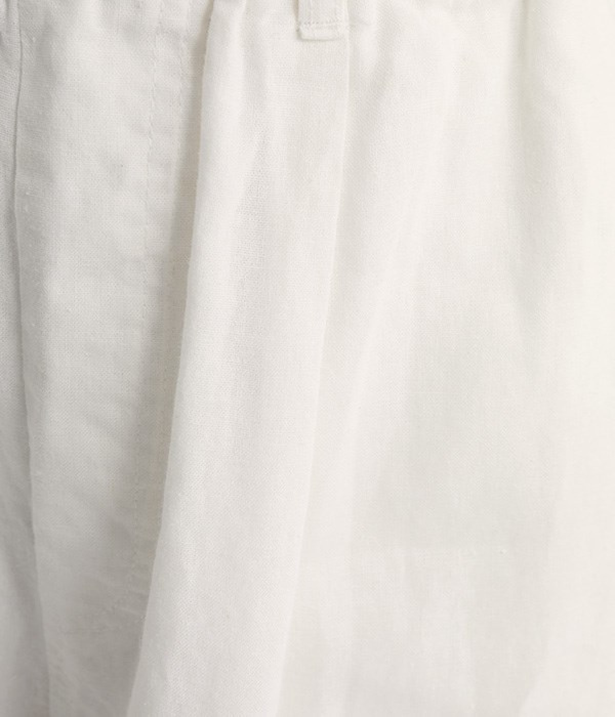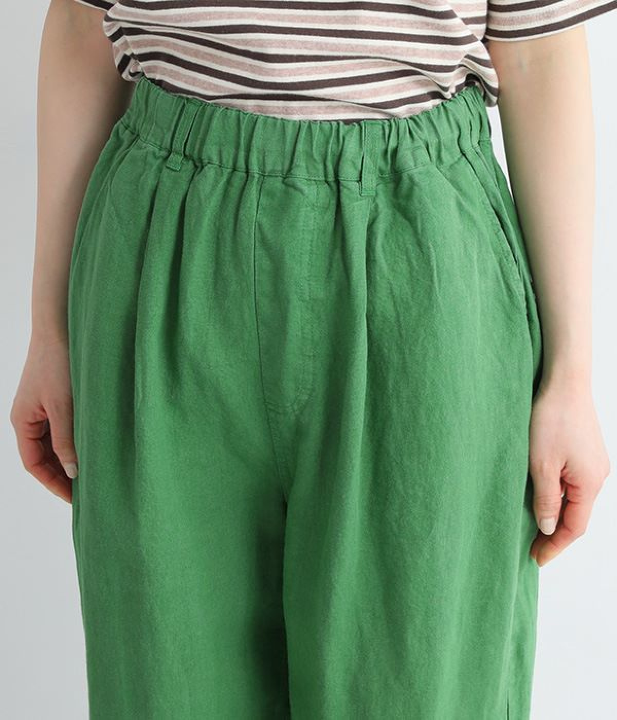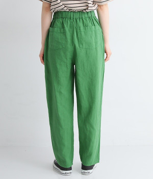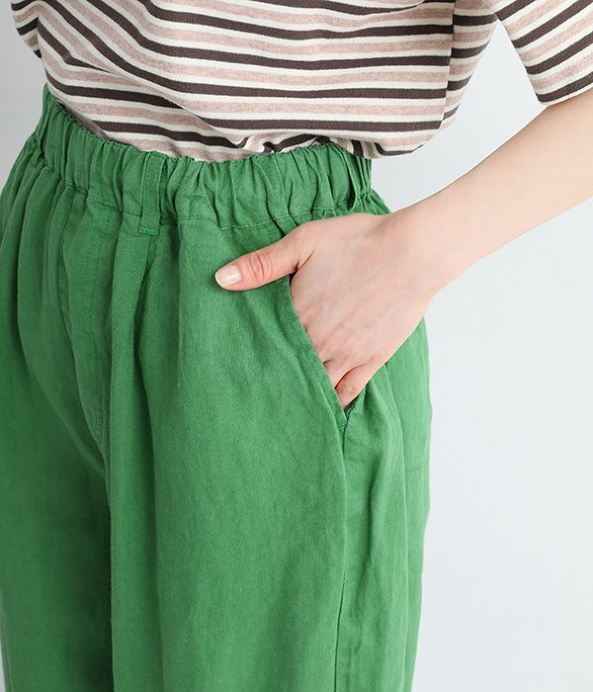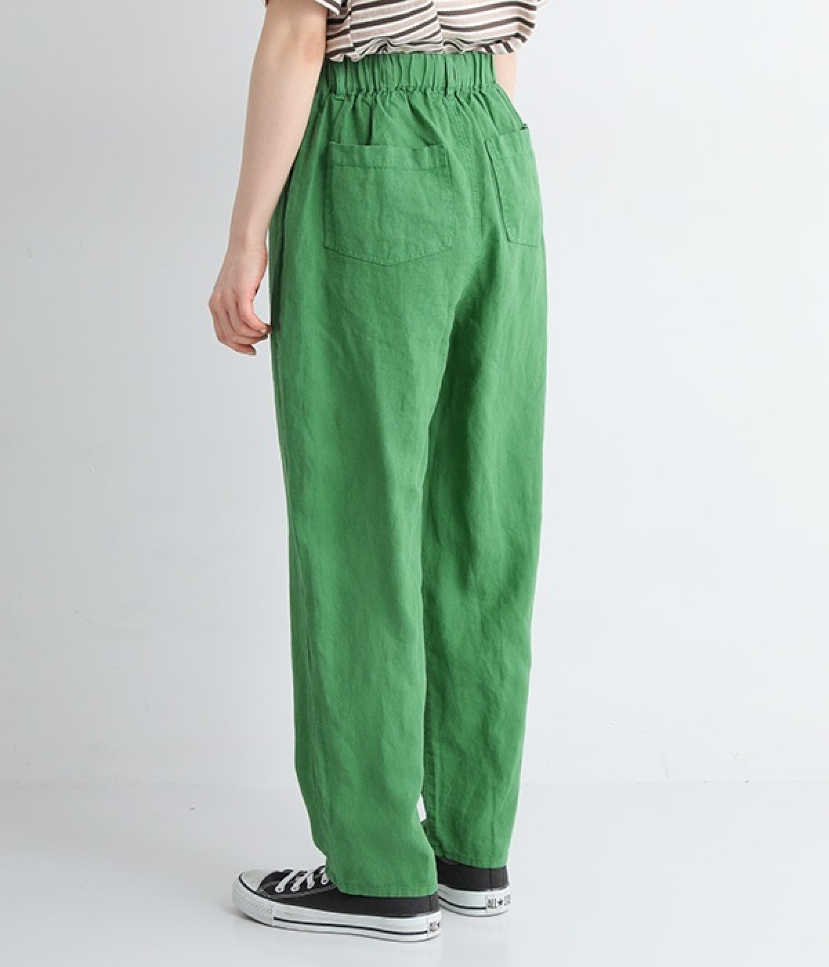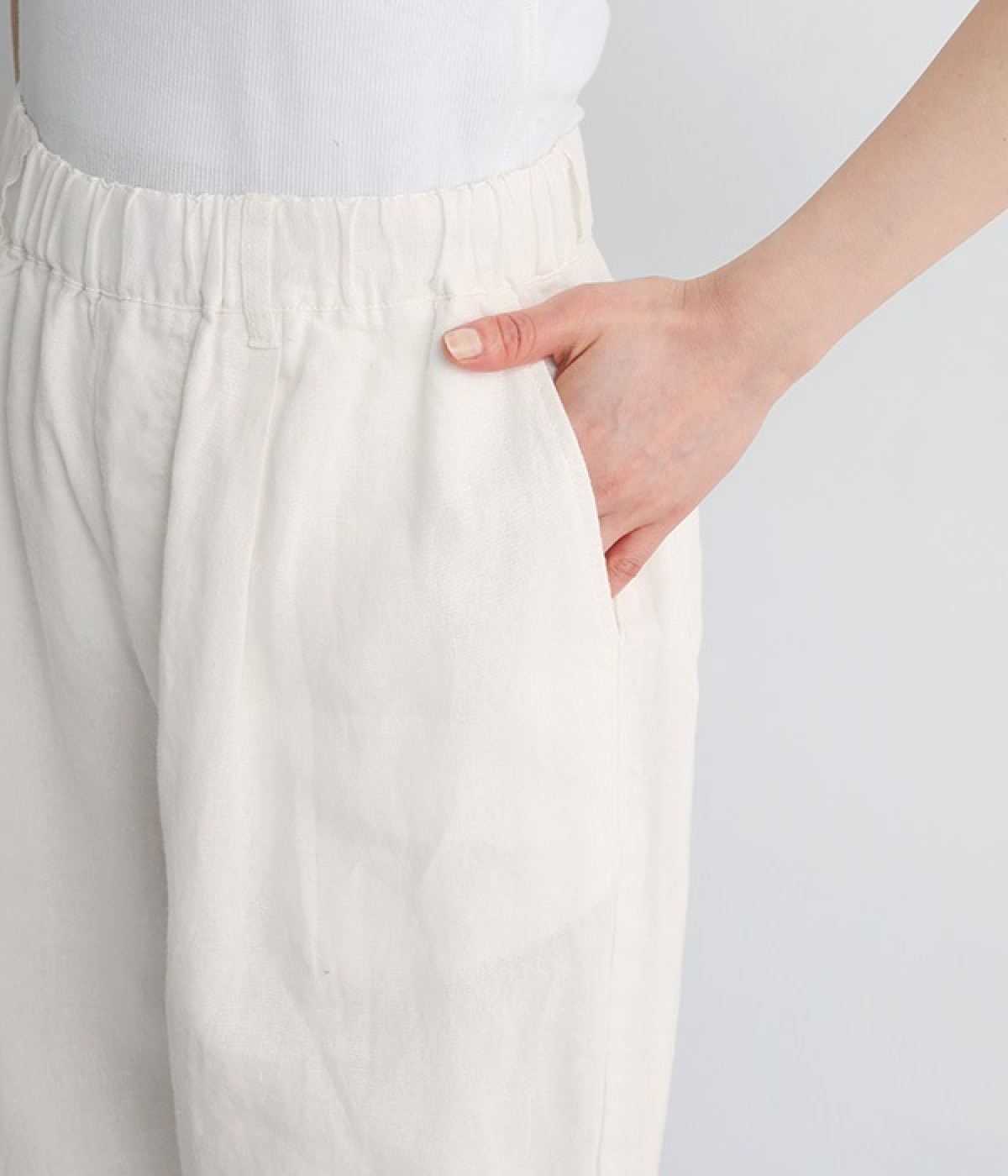 製品染め&バイオ加工をほどこして、はきなれたようなやわらかな風合いに仕上げたパンツ。リネン特有のざらつきがおさえられ、肌にさらっと心地良いのが魅力です。裾にかけてシェイプしたテーパード型で、フルレングスでも足元はすっきりと。ウエストにしっかりと密着し、腰まわりのふくらみをおさえてくれる平らなゴムを腰に通しています。単体使いだけにとどまらず、ワンピースのインナー使いにもおすすめ。