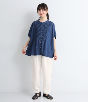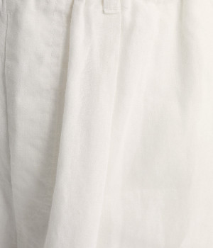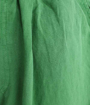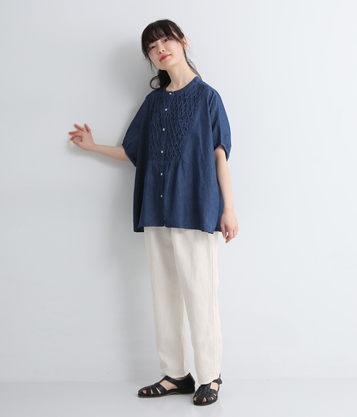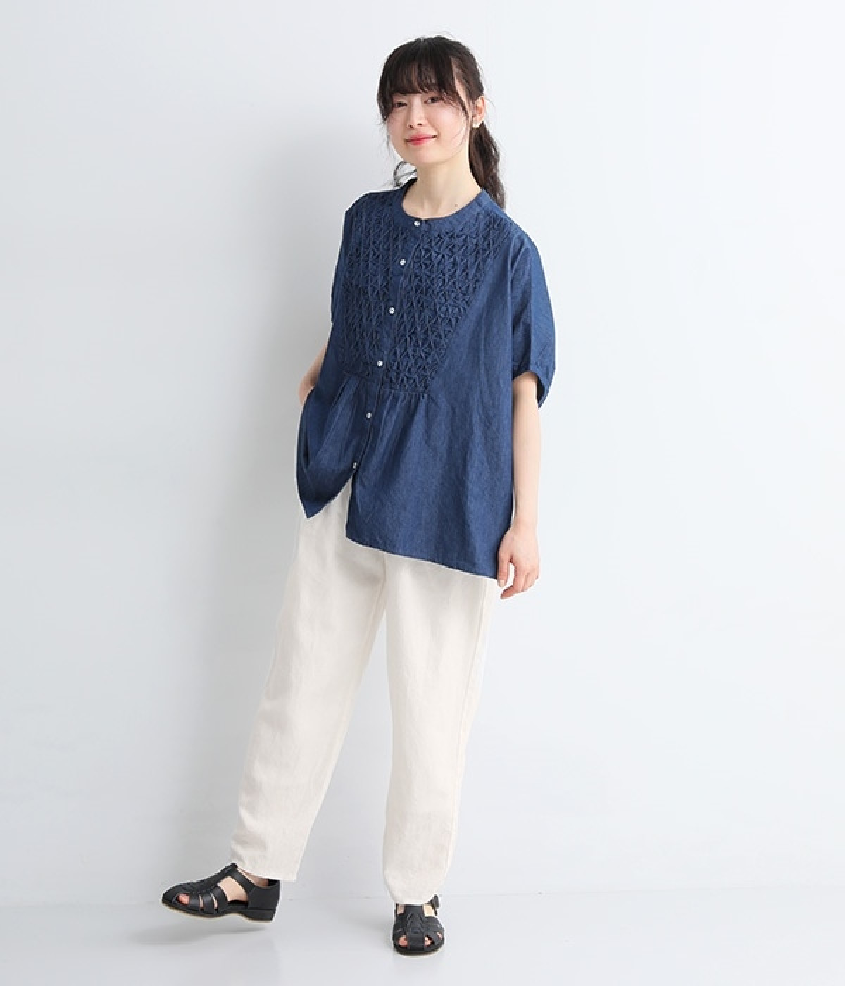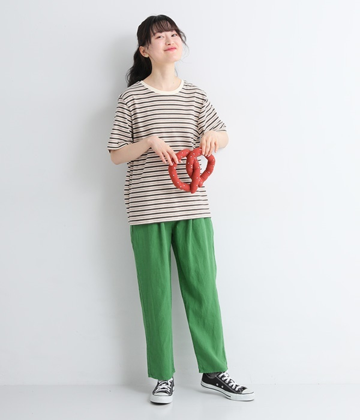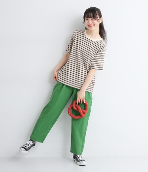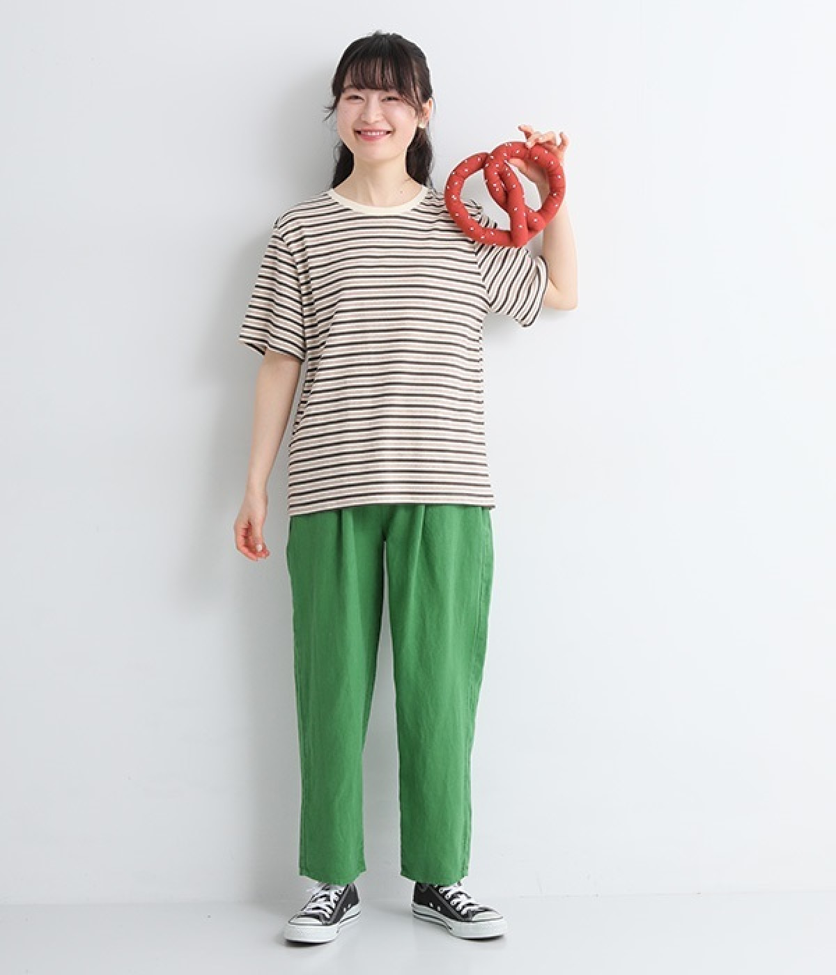 製品染め&バイオ加工をほどこして、はきなれたようなやわらかな風合いに仕上げたパンツ。リネン特有のざらつきがおさえられ、肌にさらっと心地良いのが魅力です。裾にかけてシェイプしたテーパード型で、フルレングスでも足元はすっきりと。ウエストにしっかりと密着し、腰まわりのふくらみをおさえてくれる平らなゴムを腰に通しています。単体使いだけにとどまらず、ワンピースのインナー使いにもおすすめ。