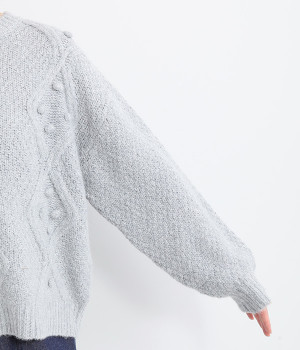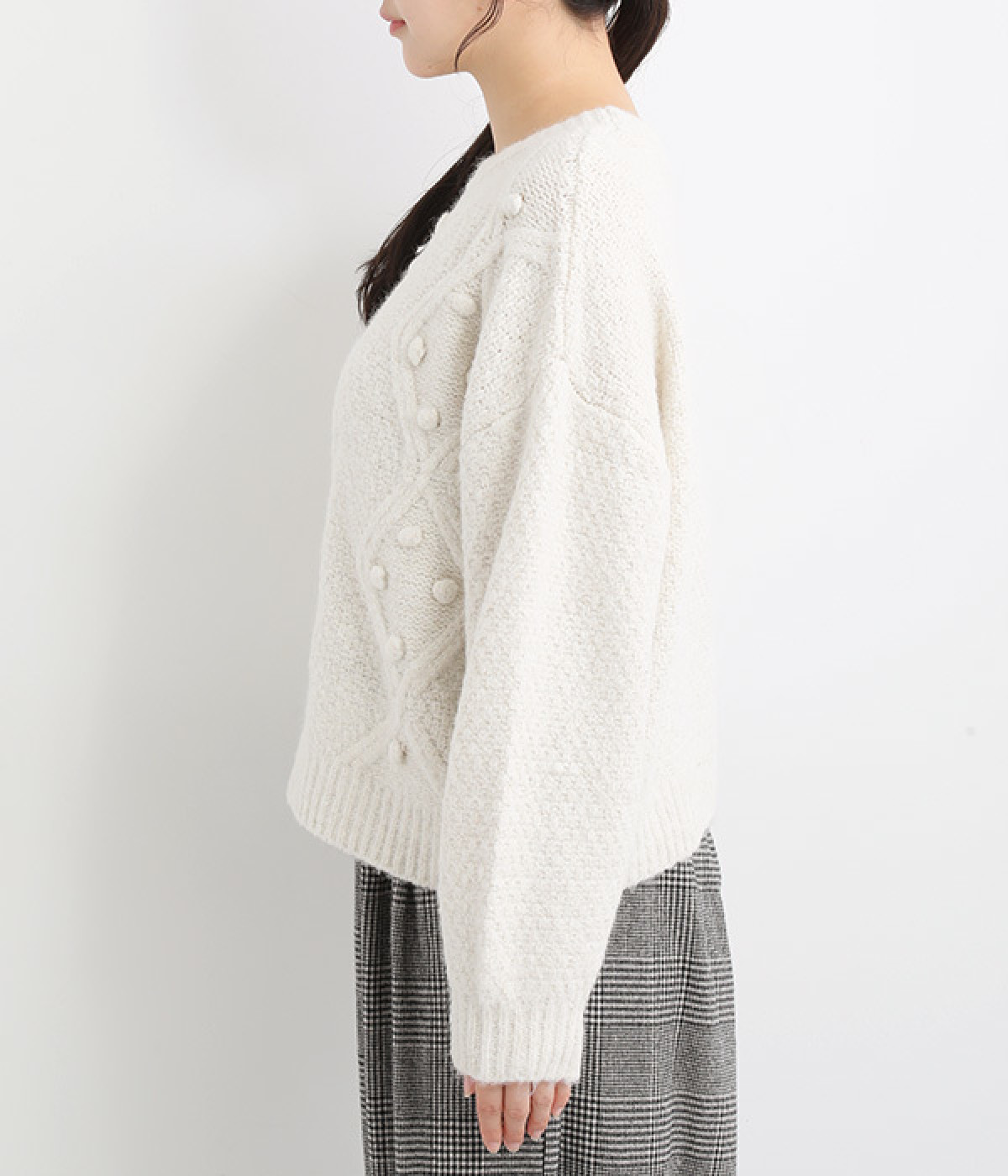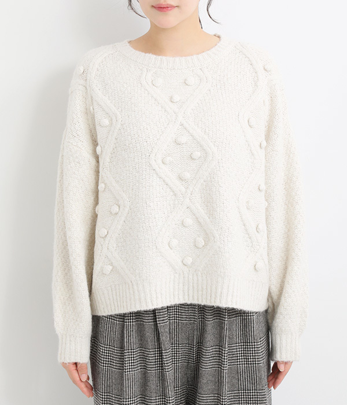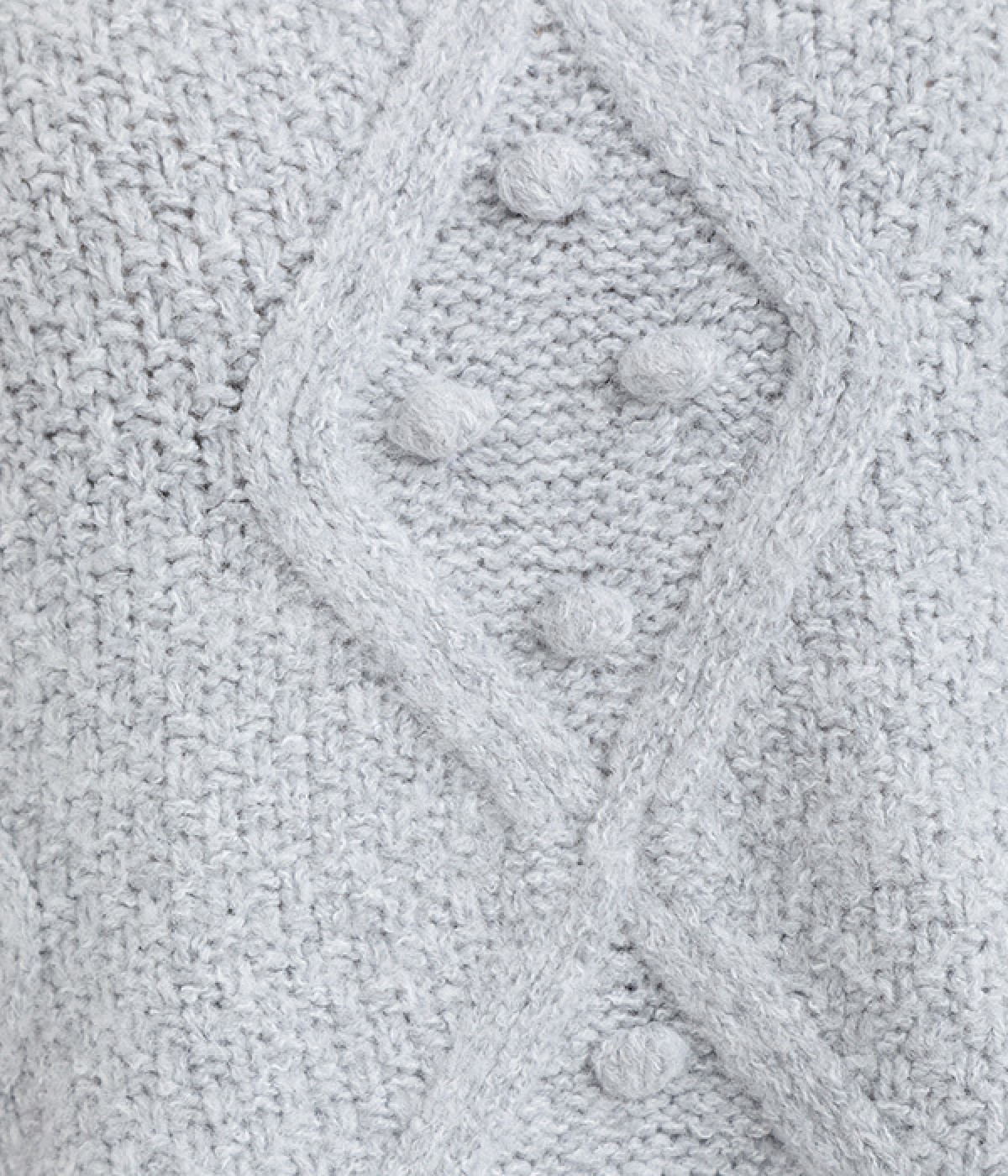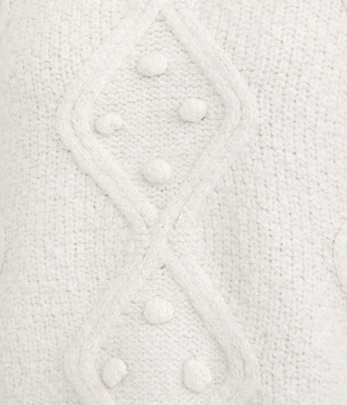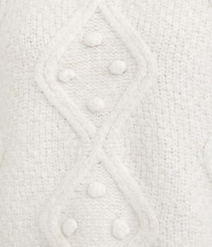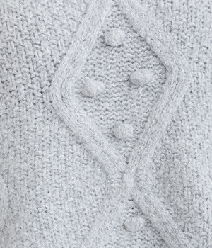 ダイヤ編みの内側にあしらったポンポンがポイント