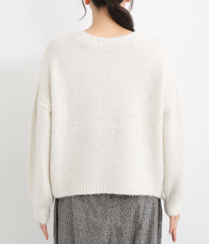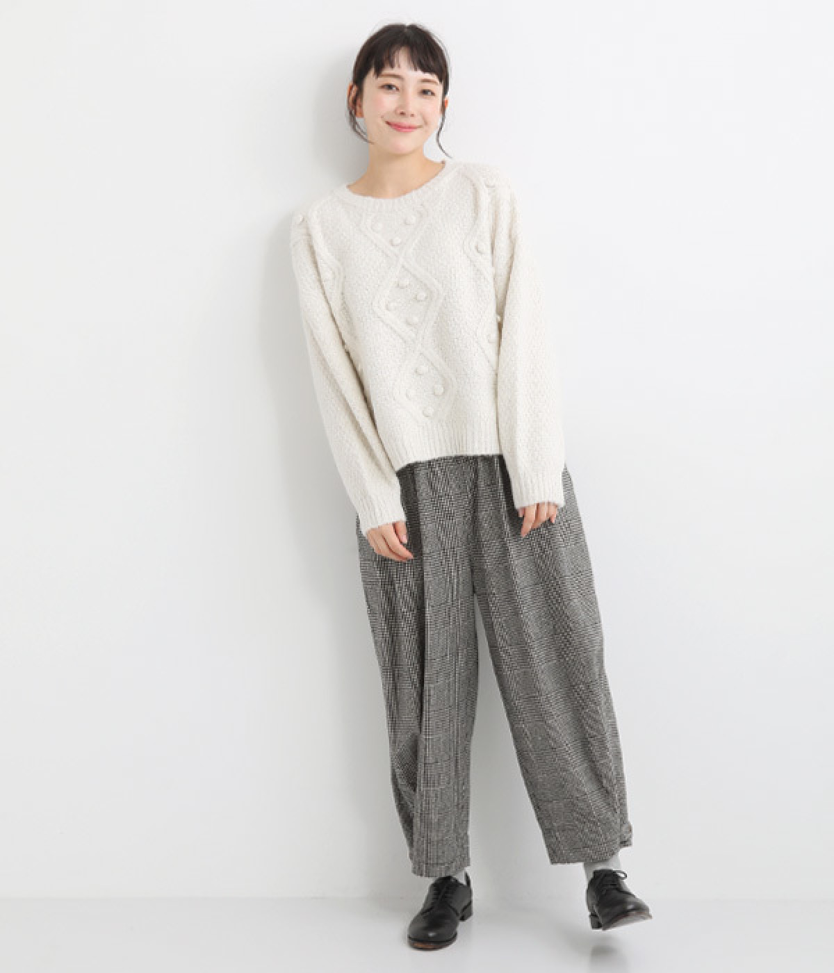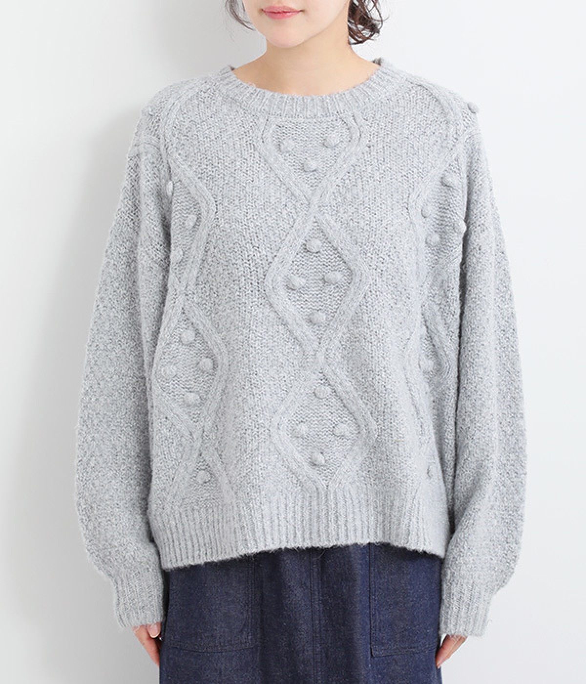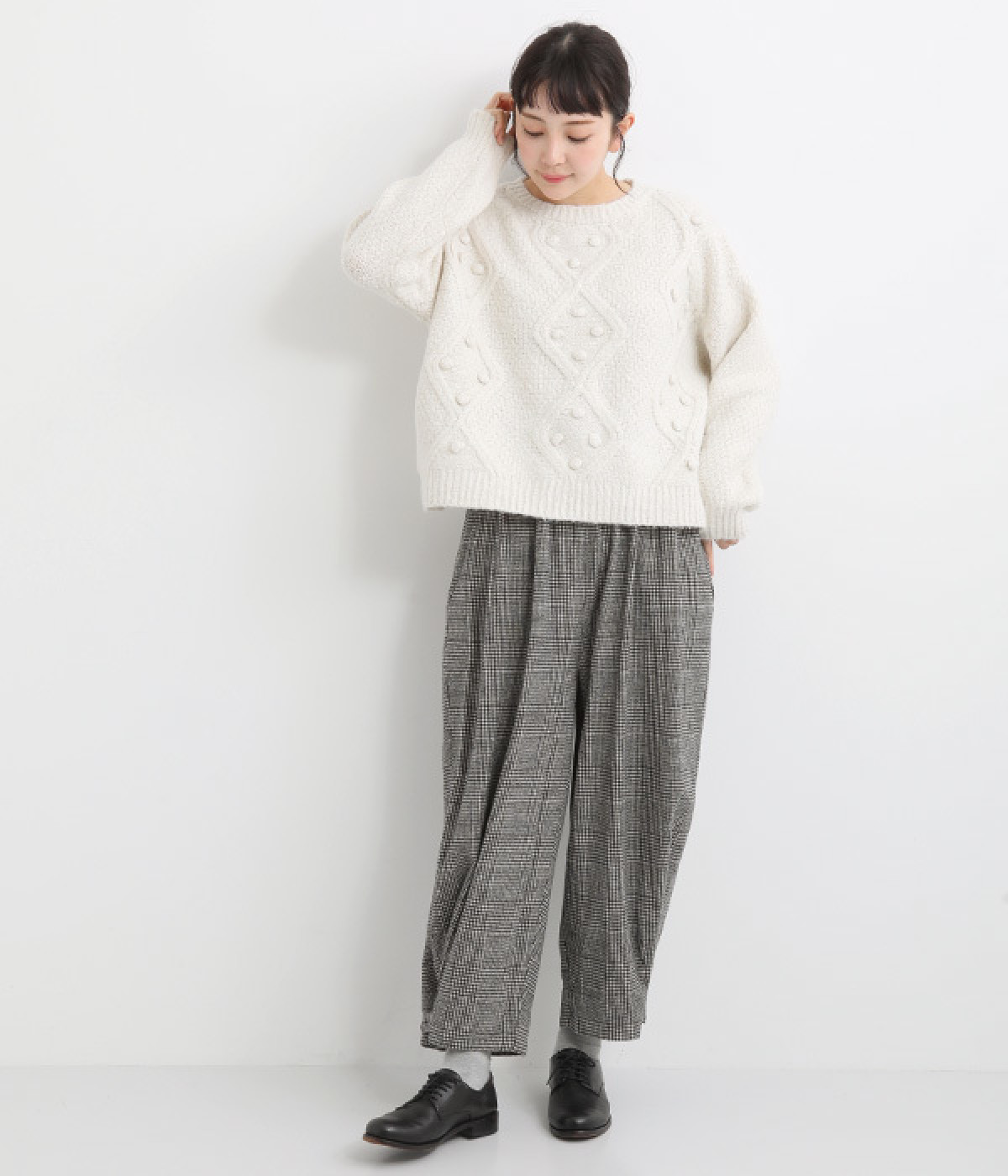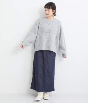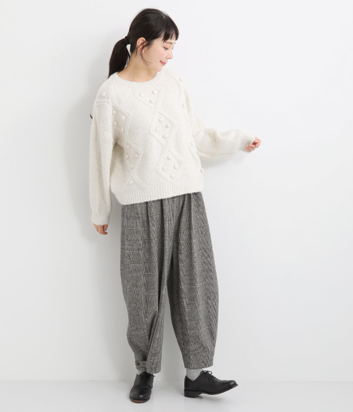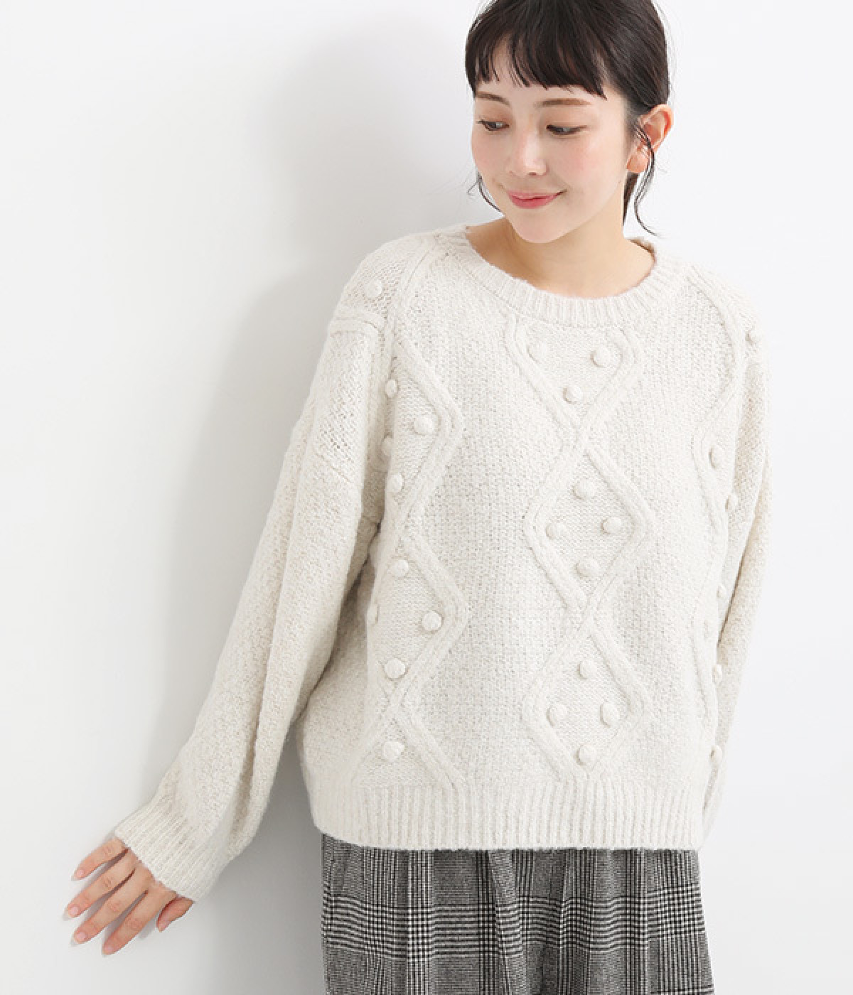 ダイヤ編みの内側にあしらったポンポンがポイント