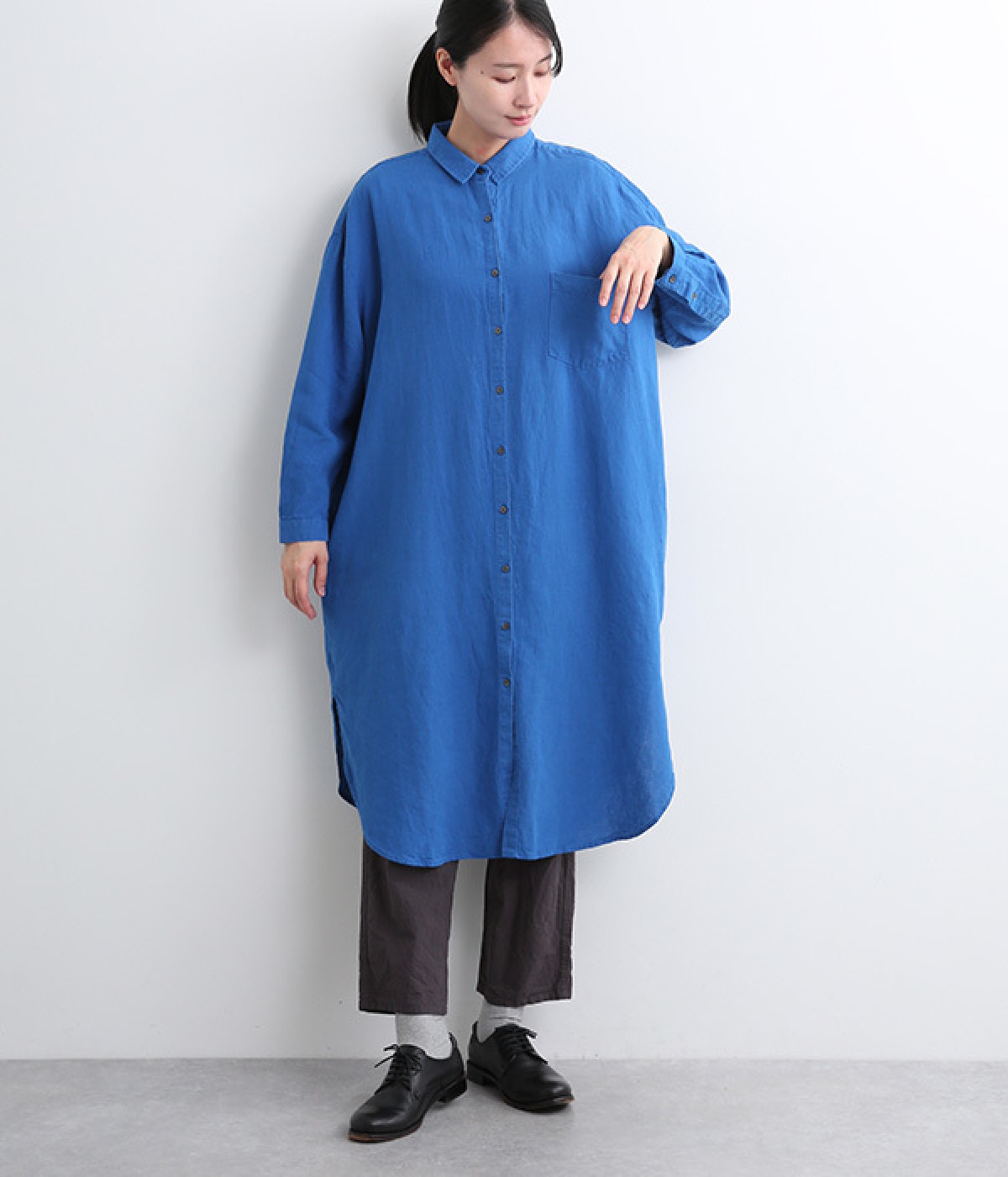 やわらかくもほどよいコシと落ち感が特徴の麻素材。洗いざらしのようなナチュラルな風合いが魅力で、ロングシーズン着まわせます。