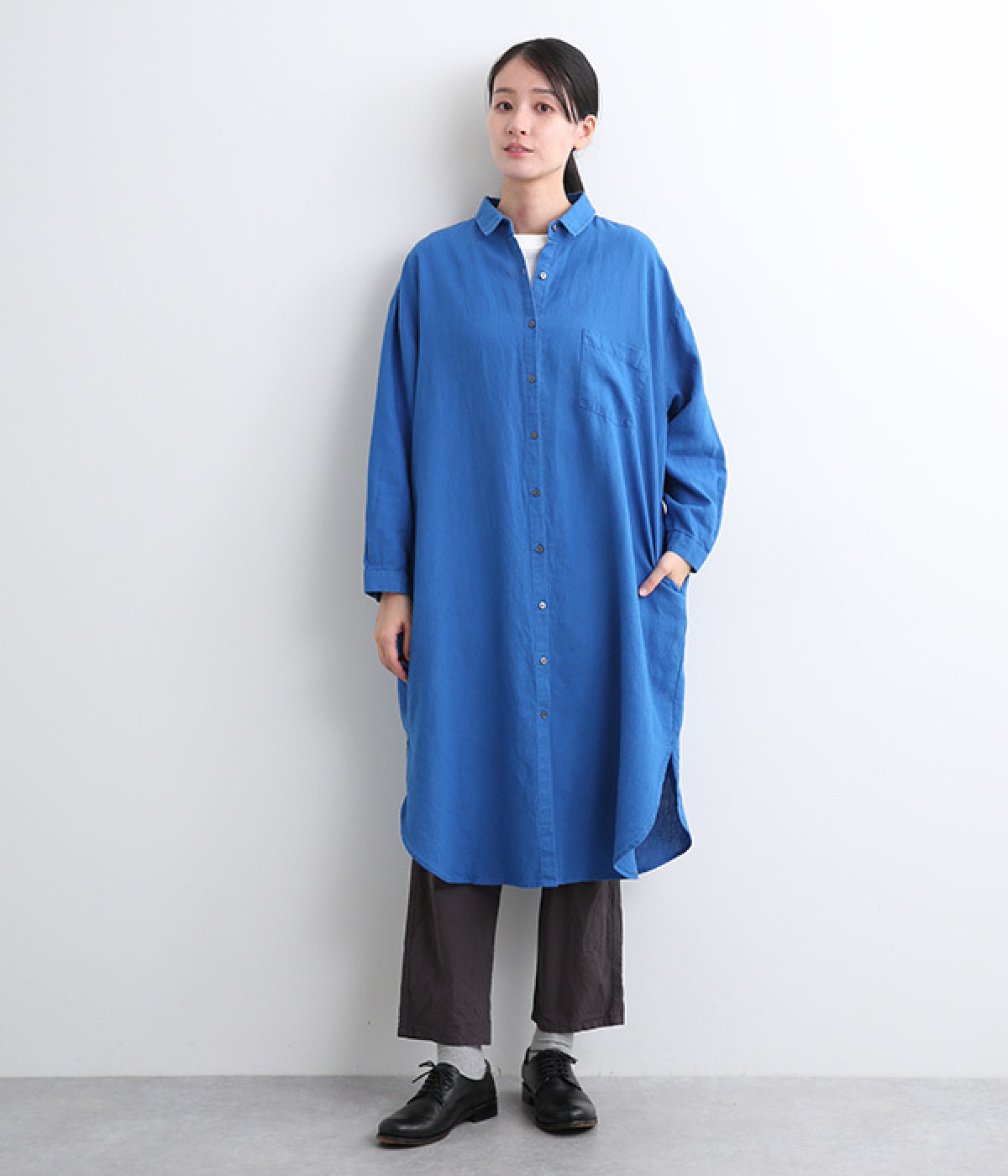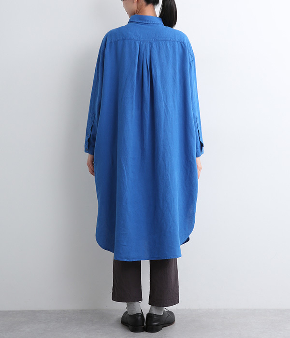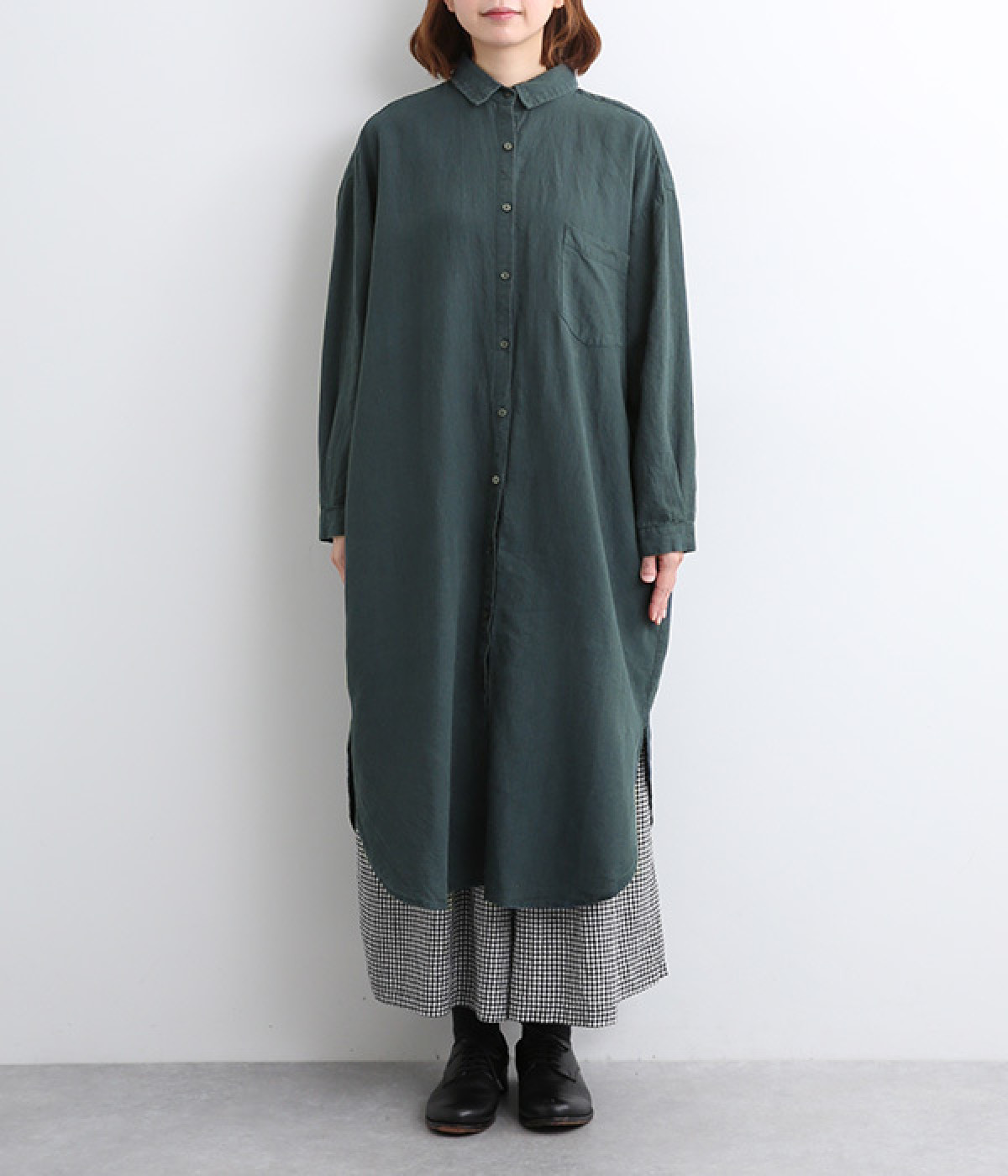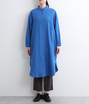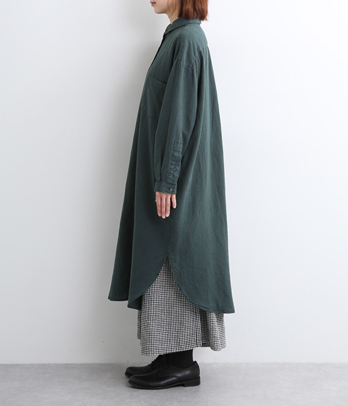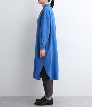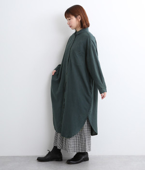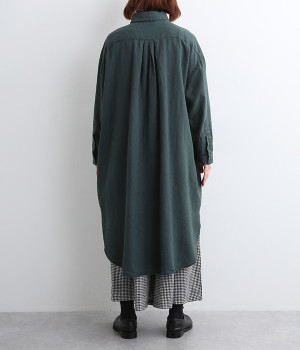 体のラインを拾いにくいゆとりのある身幅に、すっきり落ち感のあるシルエットのワンピース。後ろはタックを入りで、自然なドレープが目を惹きます。大きくラウンドさせたヘムラインが特徴的で、ボトムとのレイヤードが楽しめる一着です。