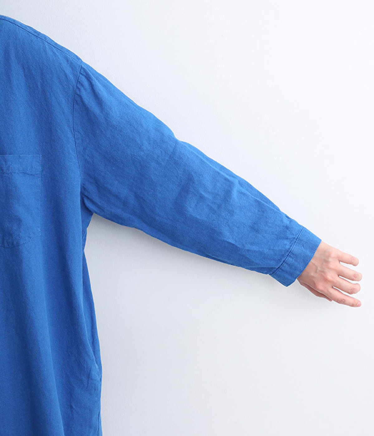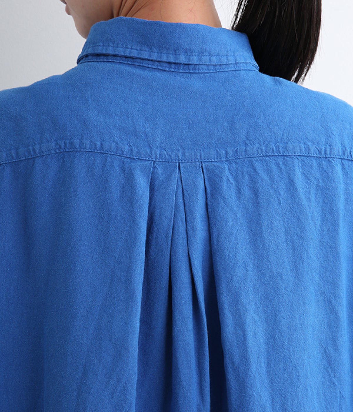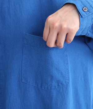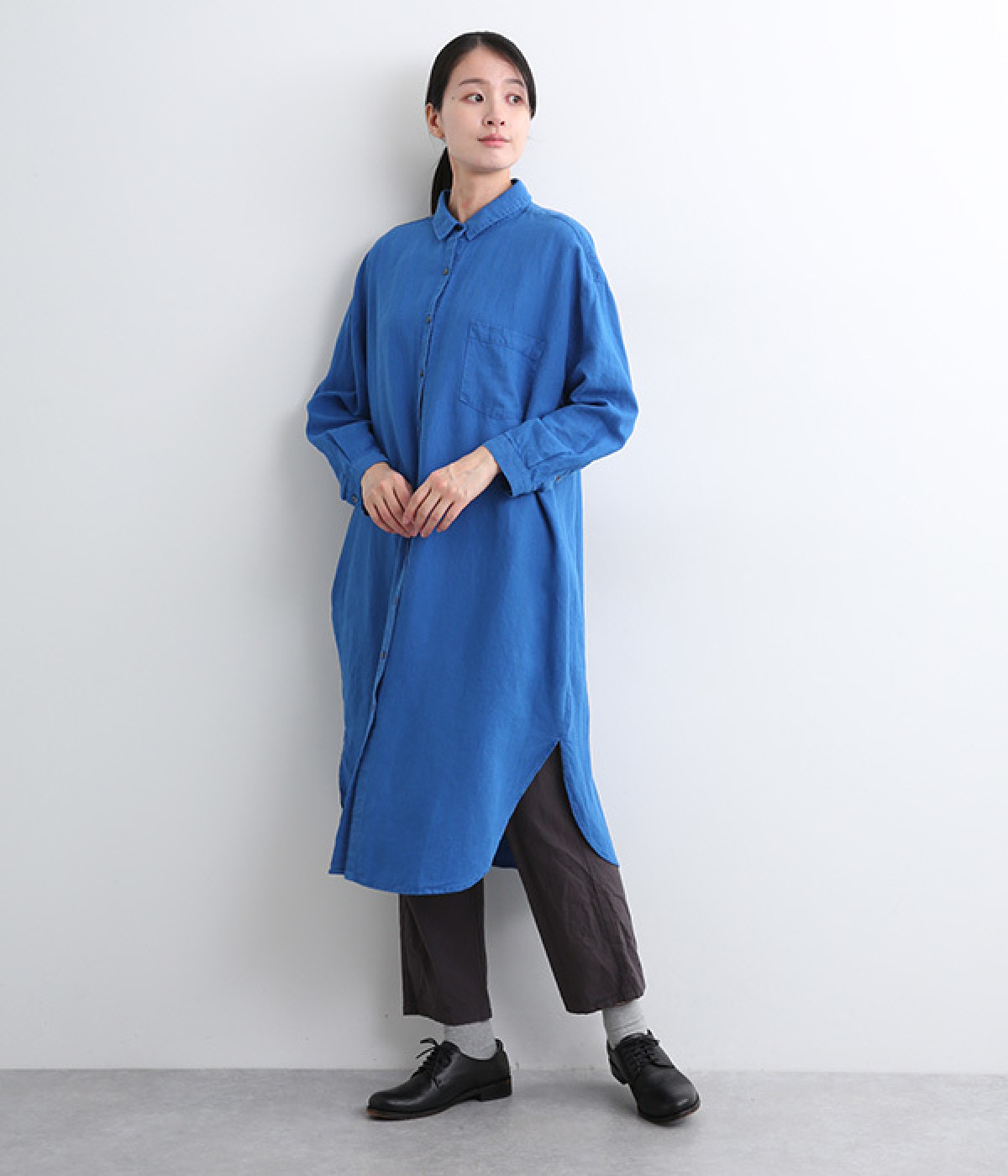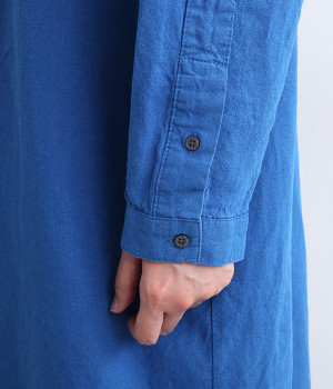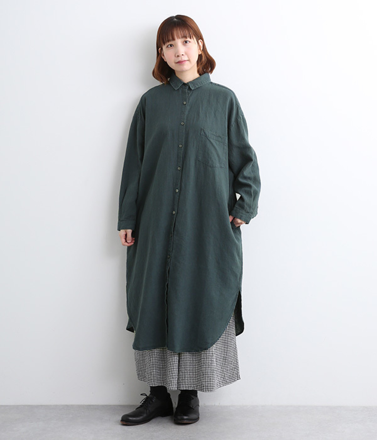 体のラインを拾いにくいゆとりのある身幅に、すっきり落ち感のあるシルエットのワンピース。後ろはタックを入りで、自然なドレープが目を惹きます。大きくラウンドさせたヘムラインが特徴的で、ボトムとのレイヤードが楽しめる一着です。