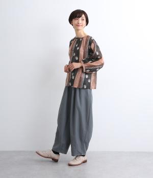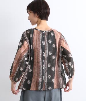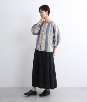 ストライプの規則性とソフトなフラワーモチーフを調和させて、すっきりとしたデザインにしました。前後で着られる利便性の高い一枚。ボリュームのある袖がコーディネートのアクセントになります。羽織りとしてもおすすめです。