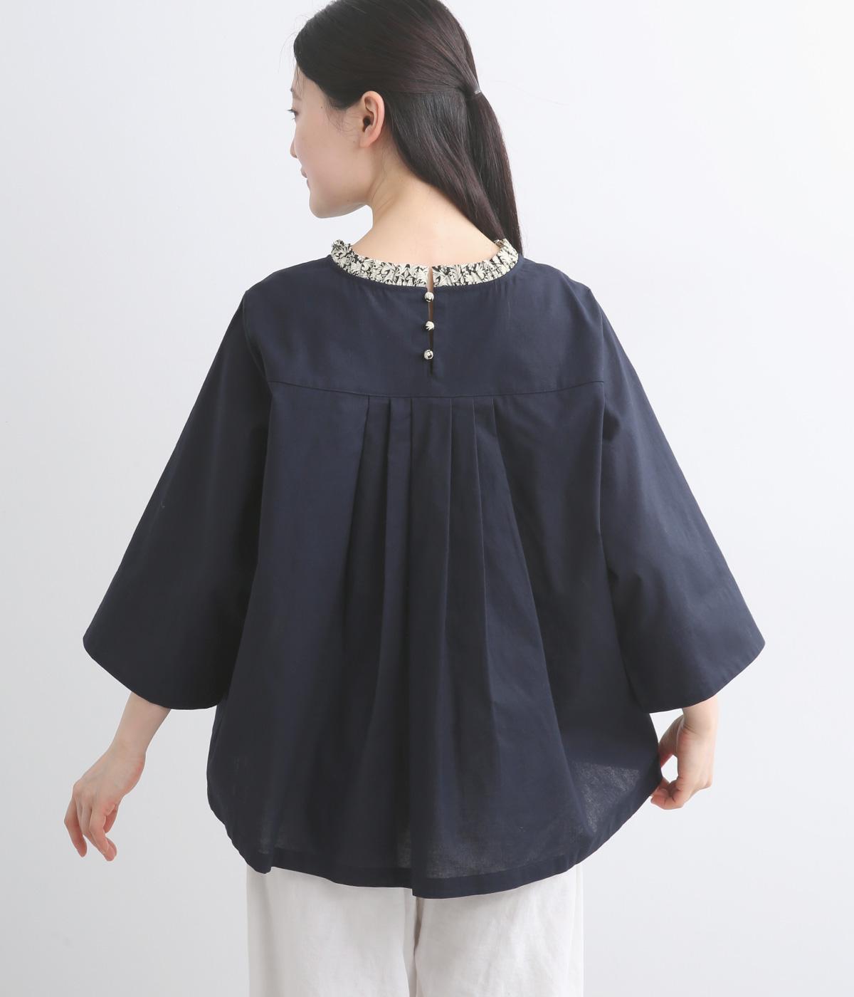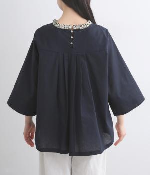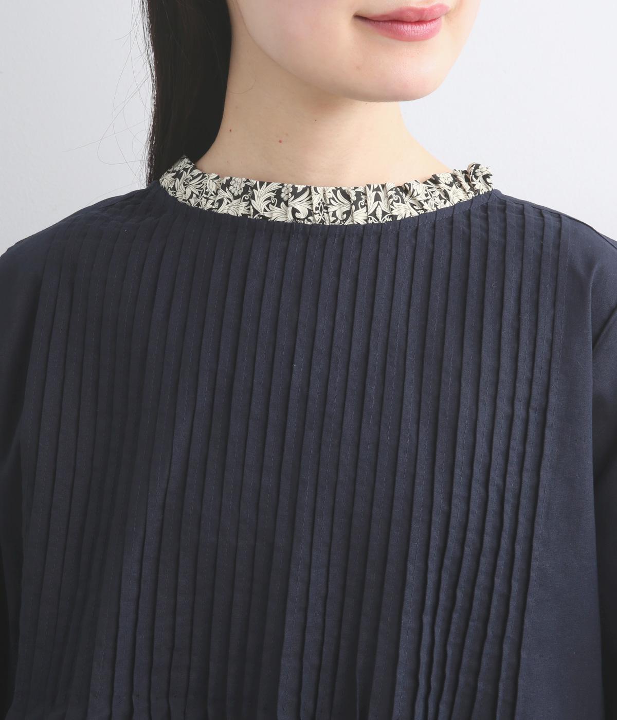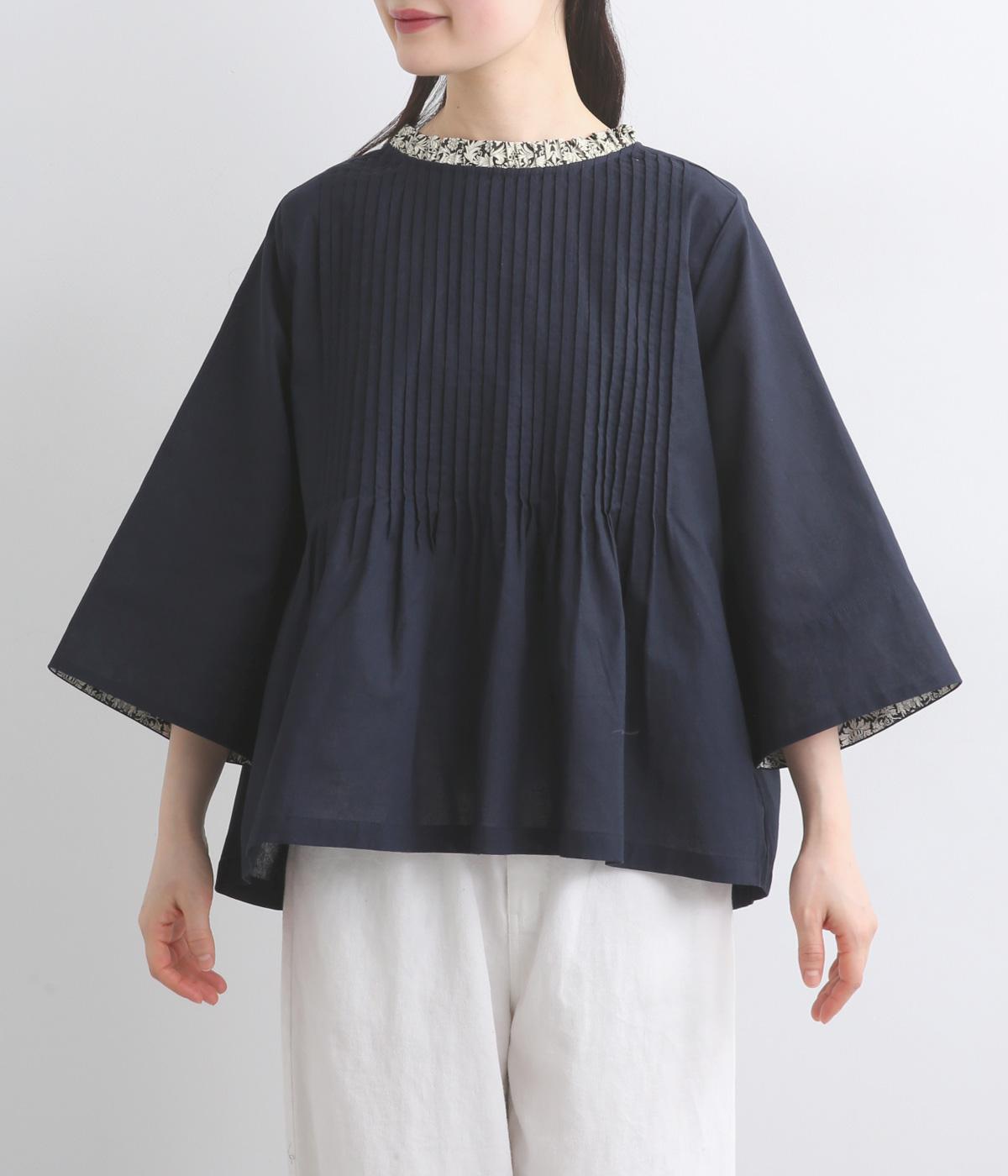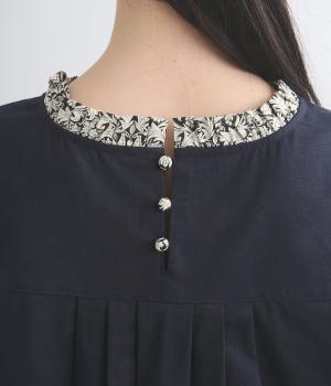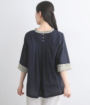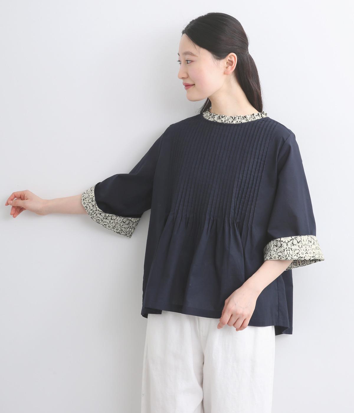 細ピンタックが端正な表情を添えるブラウス。袖口の裏にもリバティプリントをあしらい、折り返すとさらに華やかな印象に。背中のころんとしたくるみボタンにもプリントをほどこし、細部までこだわって仕立てた一枚です。