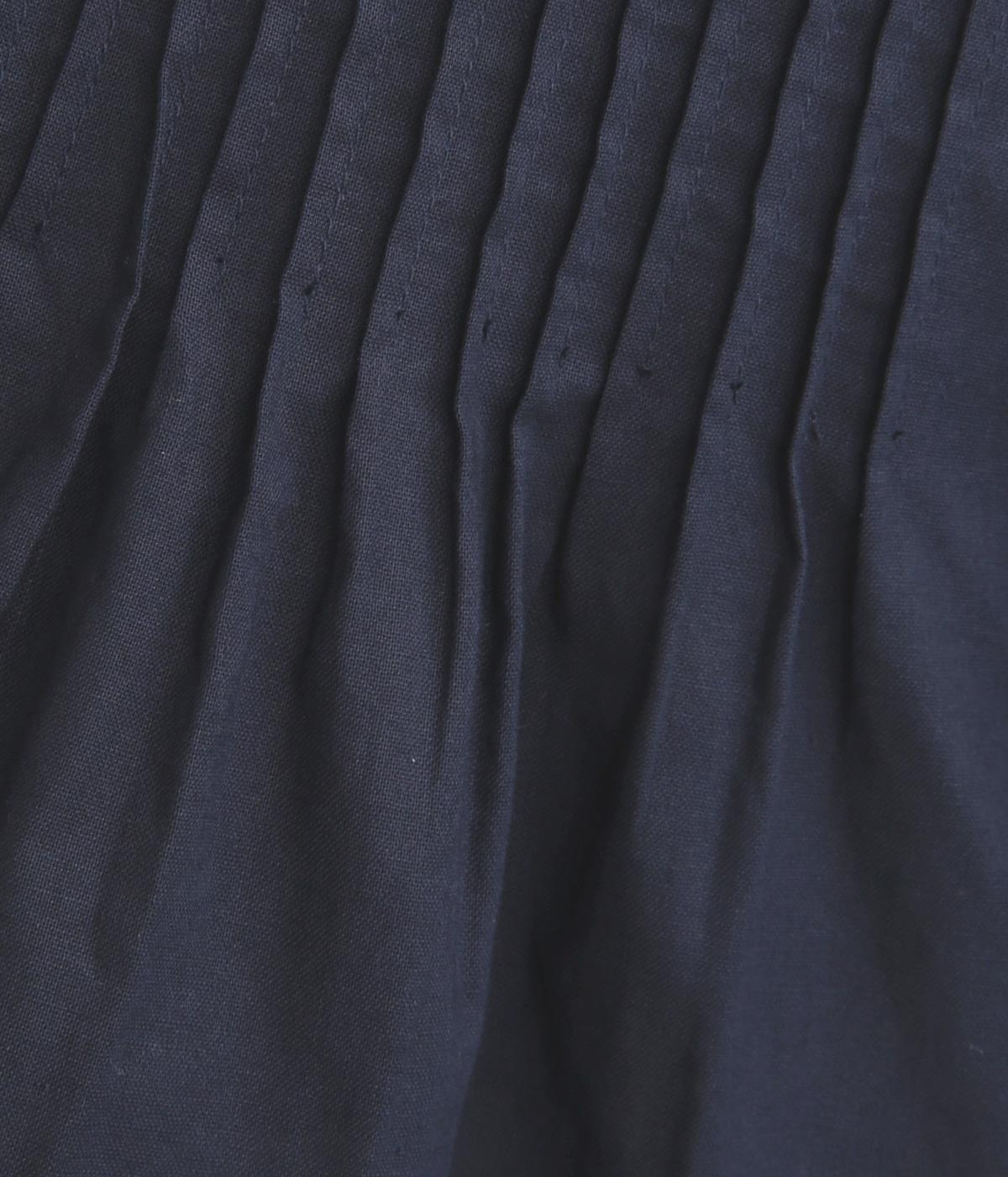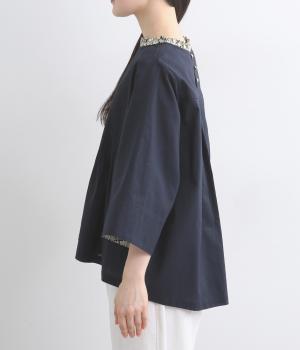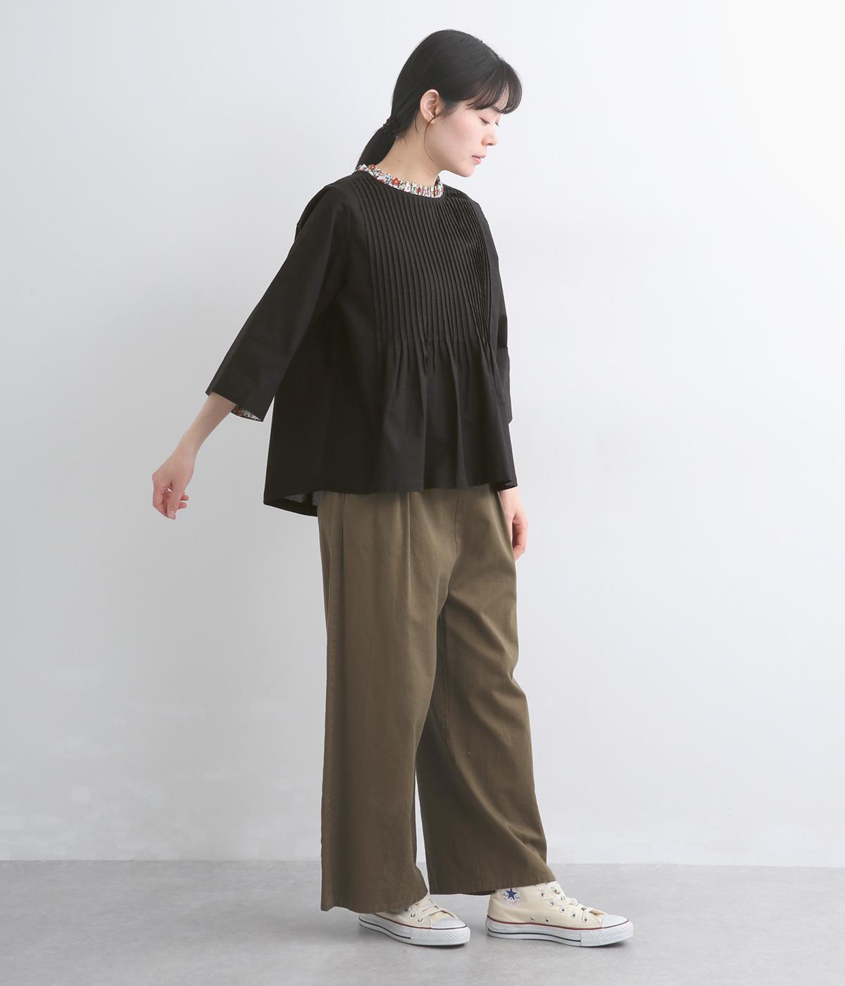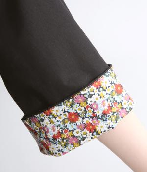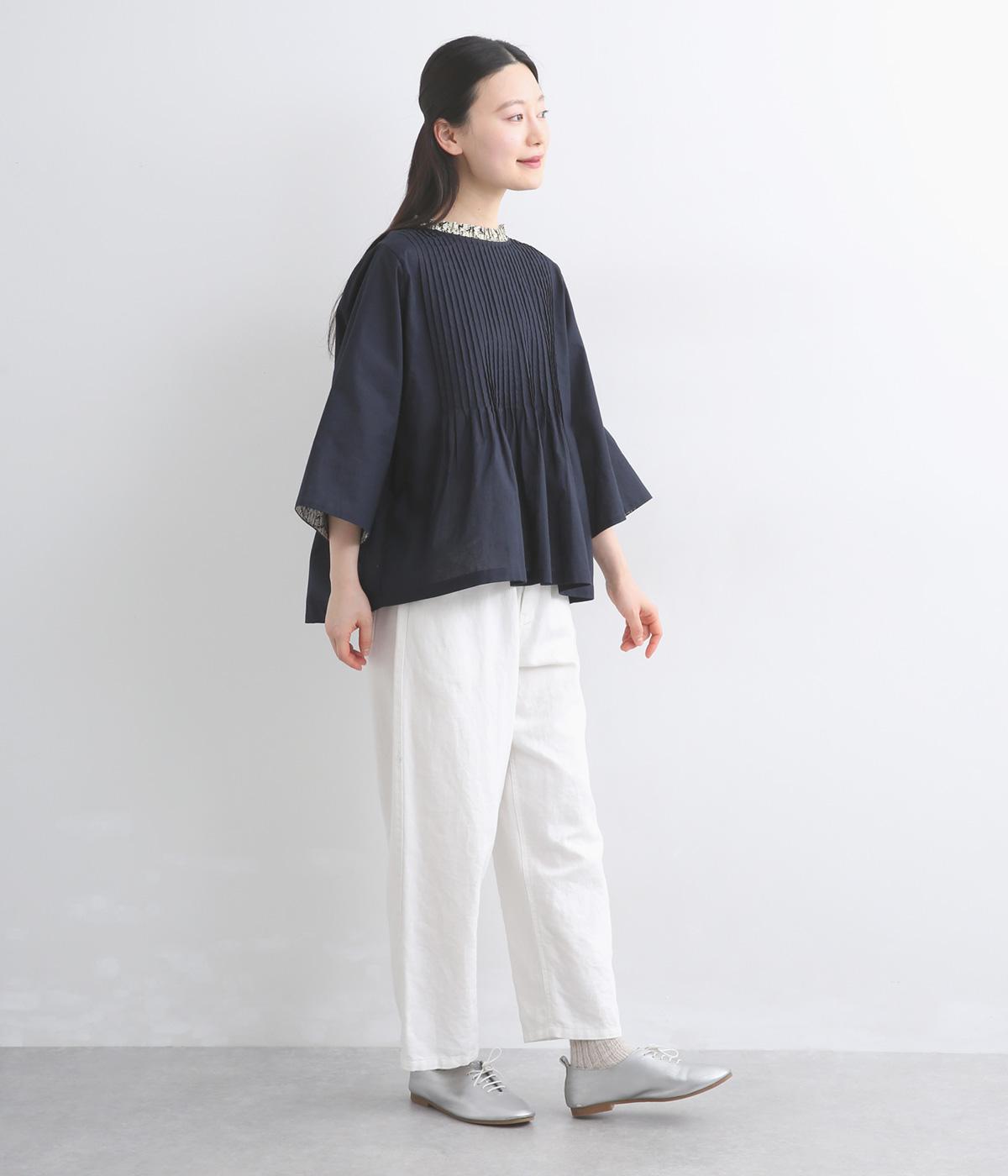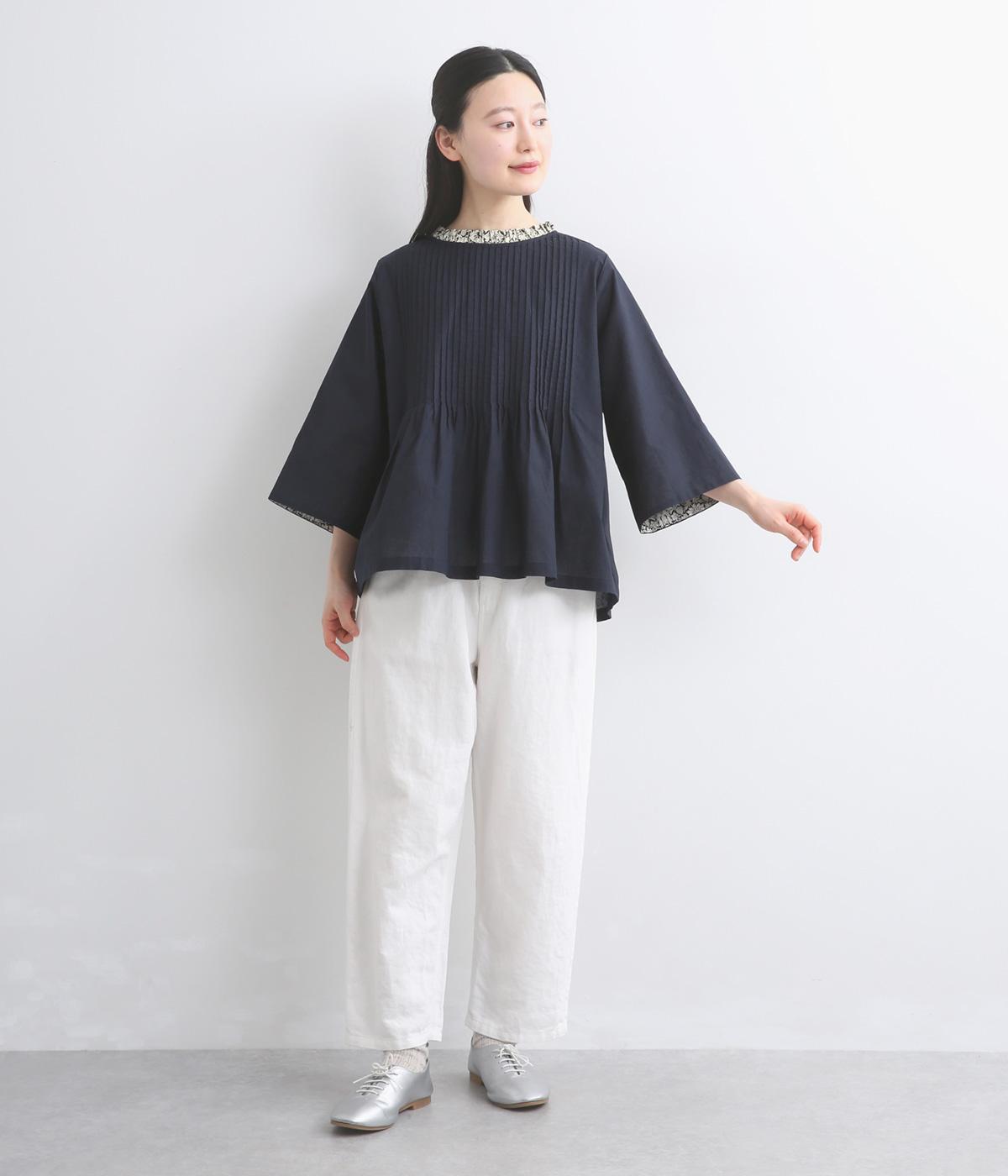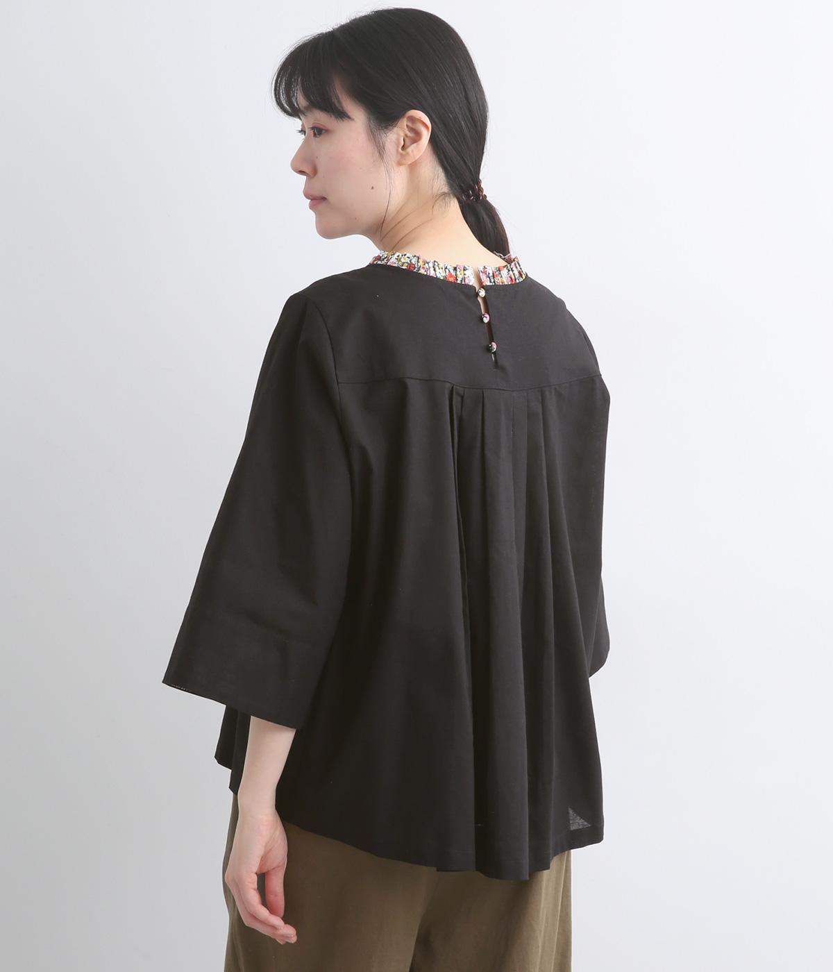 細ピンタックが端正な表情を添えるブラウス。袖口の裏にもリバティプリントをあしらい、折り返すとさらに華やかな印象に。背中のころんとしたくるみボタンにもプリントをほどこし、細部までこだわって仕立てた一枚です。