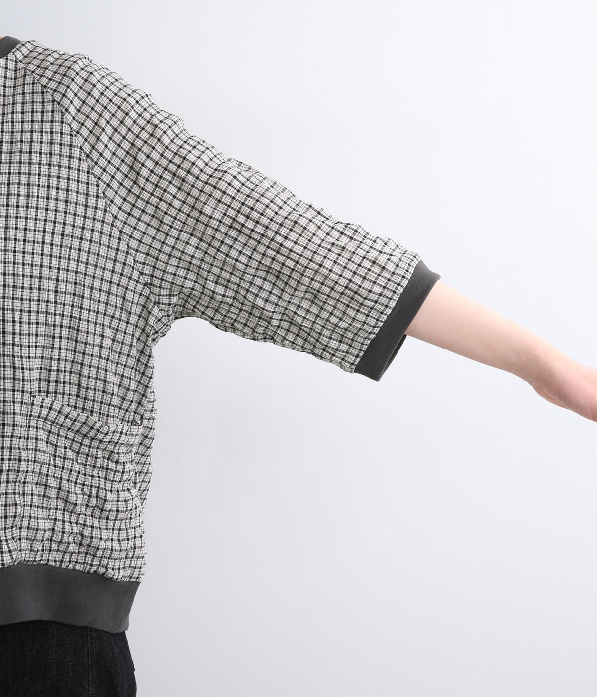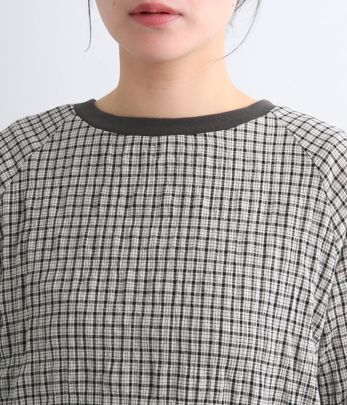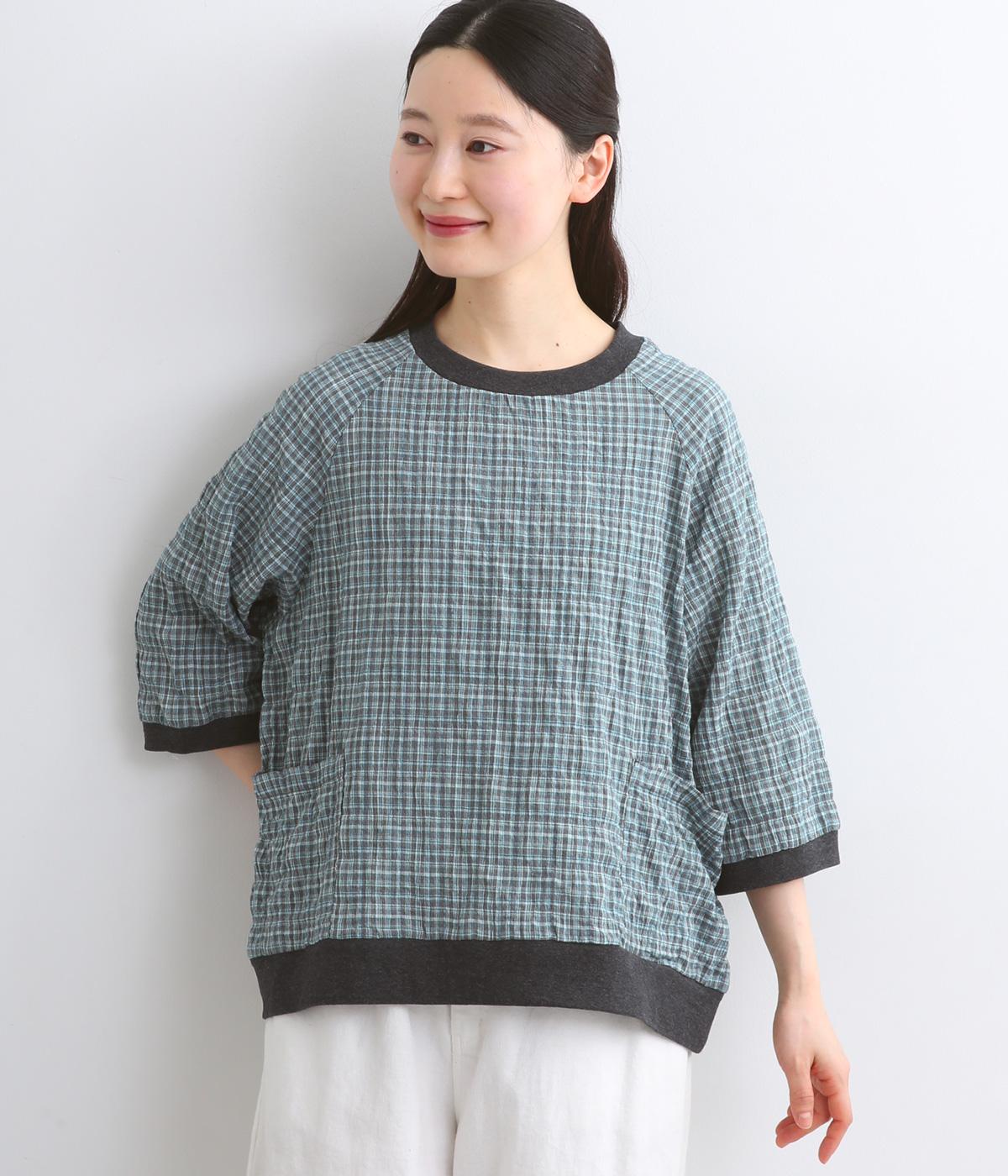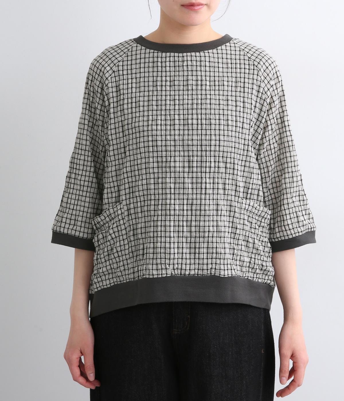 シワ感のあるナチュラルな生地にシックなチェック柄をあしらったブラウス。肩まわりが楽なラグランスリーブでなだらかなラインを描き、七分袖で抜け感を演出。便利なポケット付きで、機能性とこなれ感を兼ね備えた一着です。