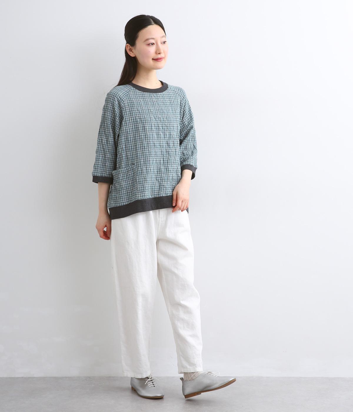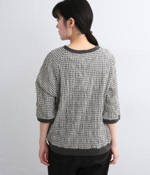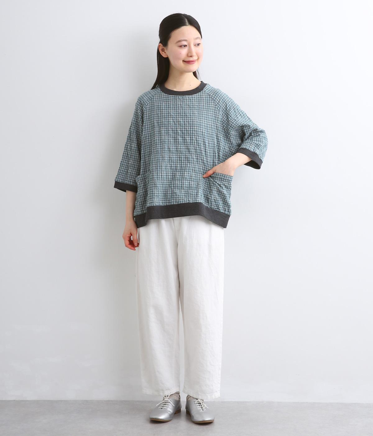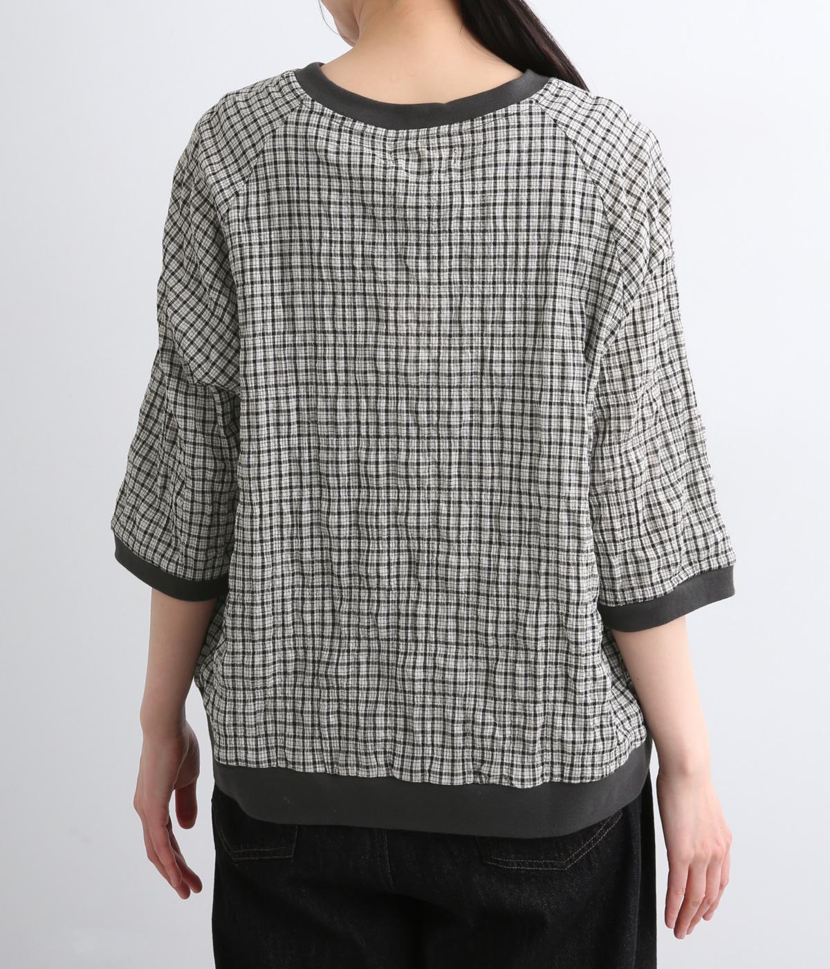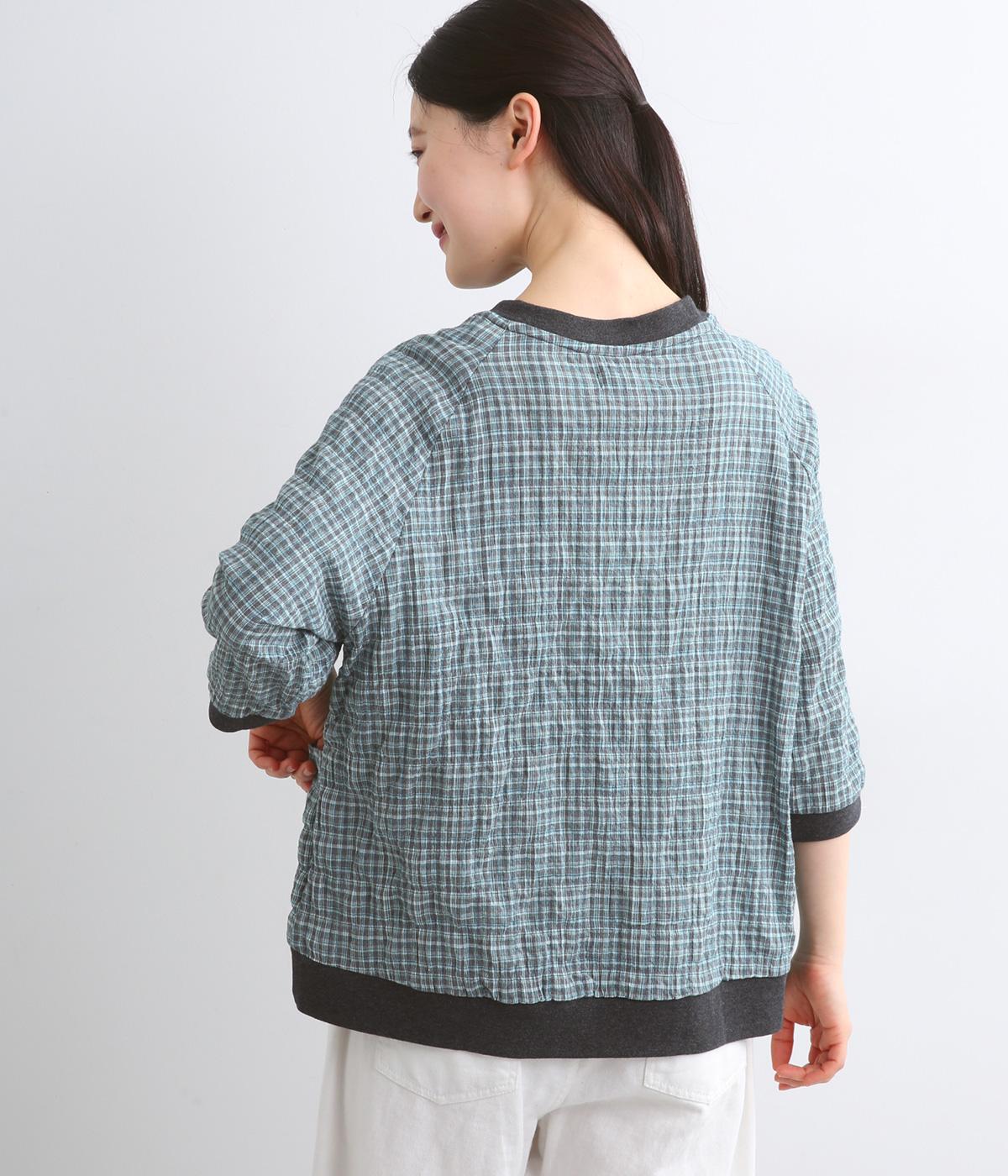 シワ感のあるナチュラルな生地にシックなチェック柄をあしらったブラウス。肩まわりが楽なラグランスリーブでなだらかなラインを描き、七分袖で抜け感を演出。便利なポケット付きで、機能性とこなれ感を兼ね備えた一着です。