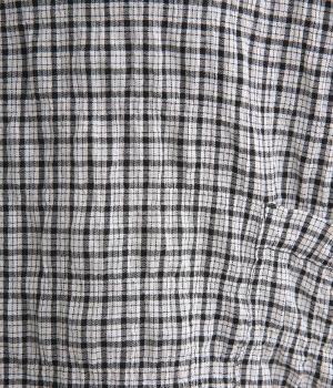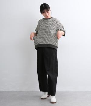 さらりとした肌ざわりのポリエステル混のコットン生地です。洗いざらしのようなシワ感のあるナチュラルな風合いが魅力。首・袖・裾には伸縮性のあるリブをほどこし、着脱しやすく動きやすい素材感です。