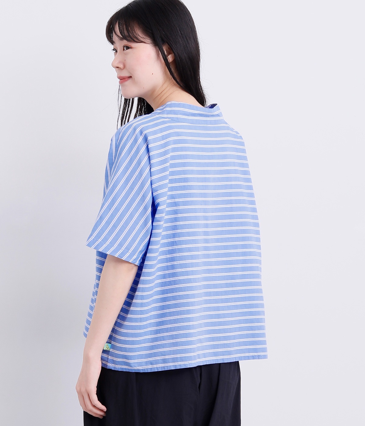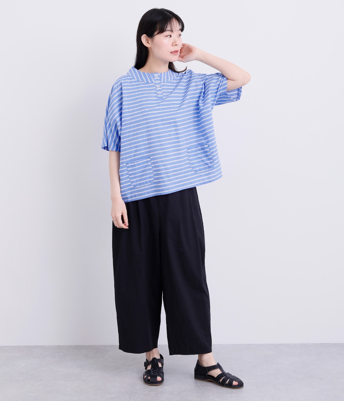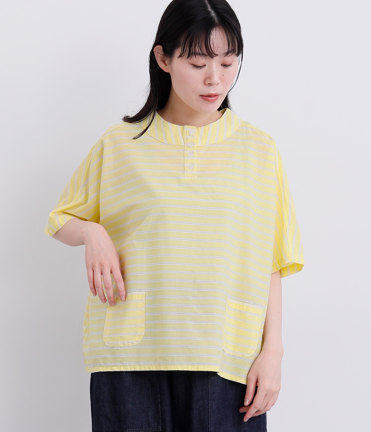 ゆるめのボックスシルエットに身頃続きのドルマンスリーブで着心地よく仕上げました。ヘンリーあきのハイネックで顔まわりはお洒落なニュアンスをプラス。裾につけた小さめのポケットがグッドポイントに。