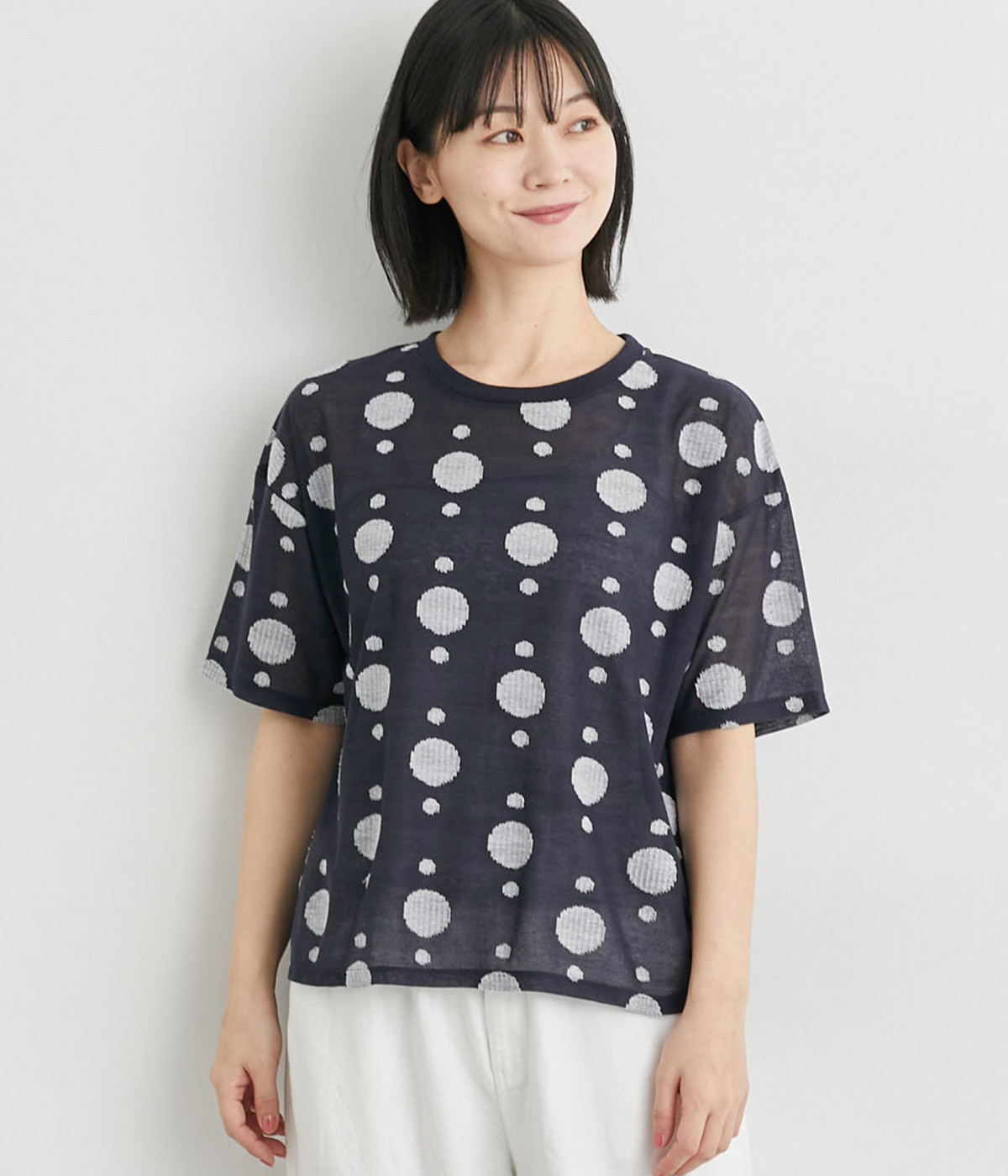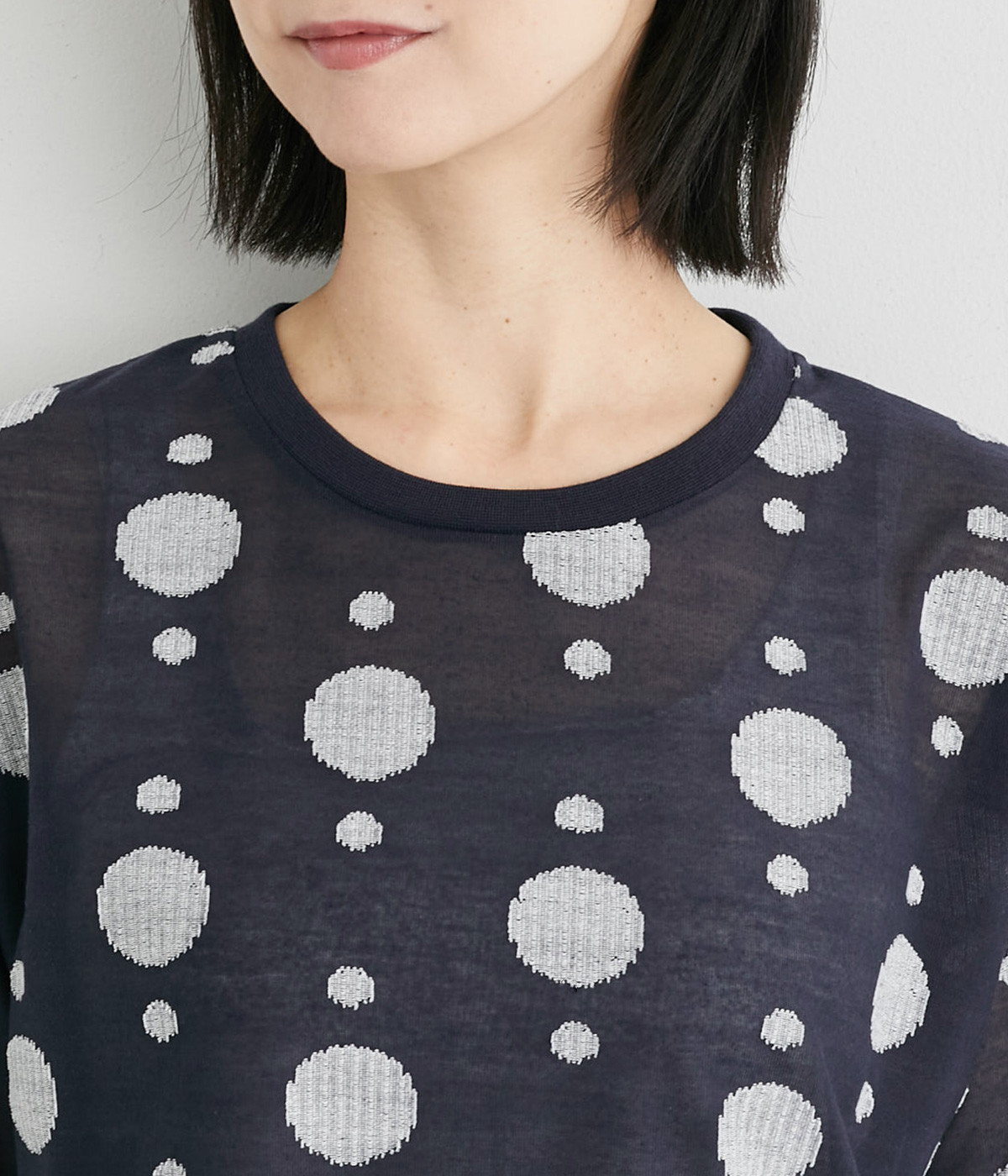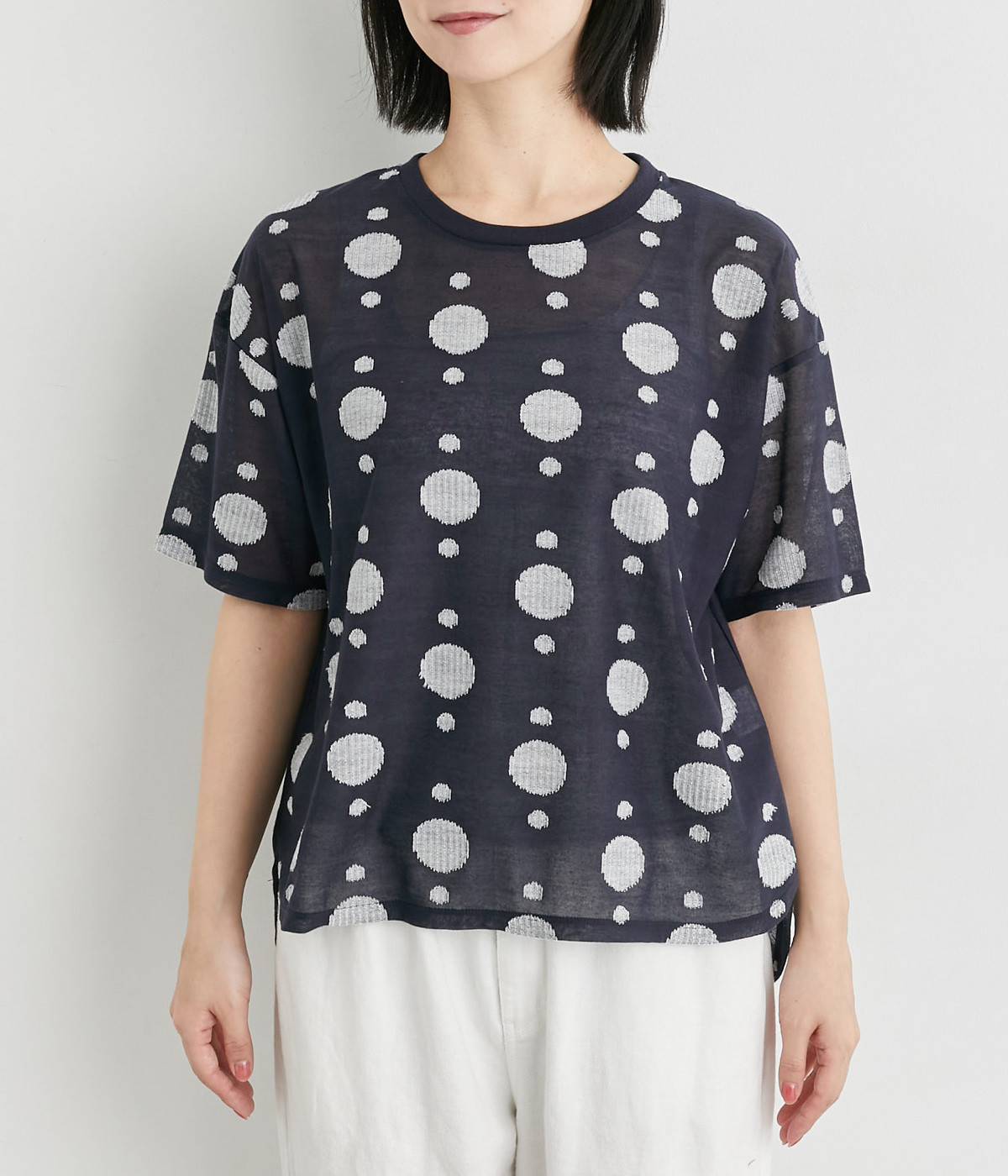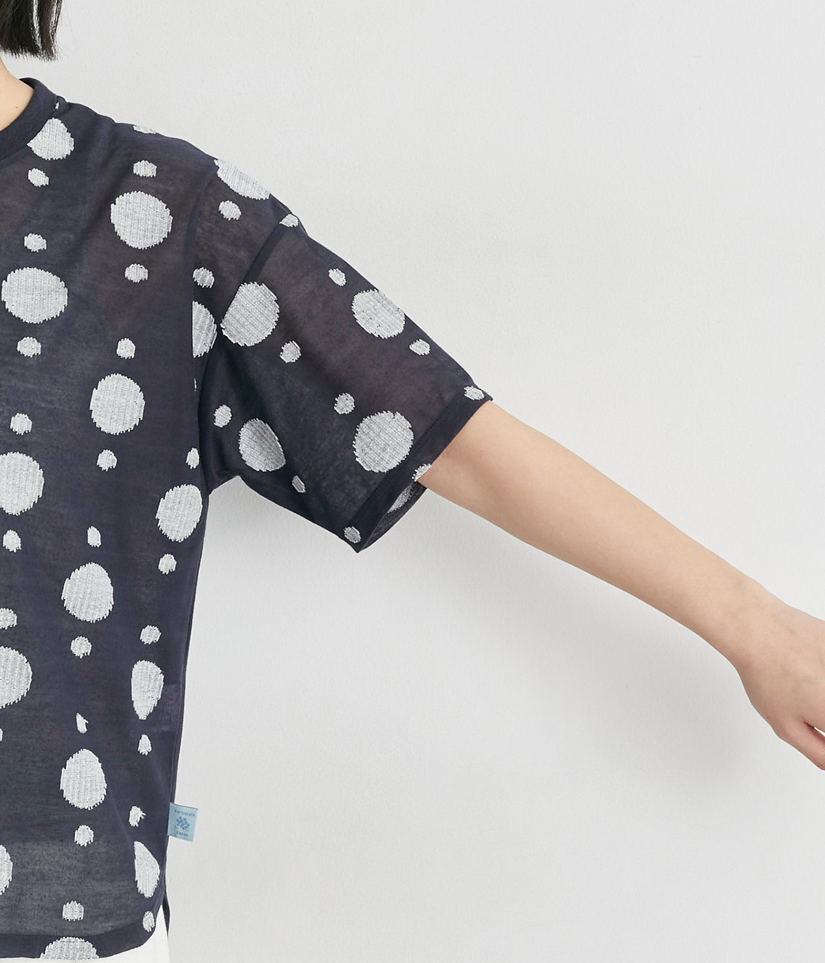 ランダムなドット柄のシアー生地が特徴的なカットプルオーバーです。やわらかでほのかに伸縮性があり、透け感があるので見た目も涼しく着用できます。