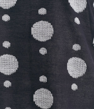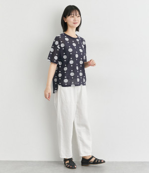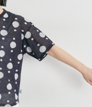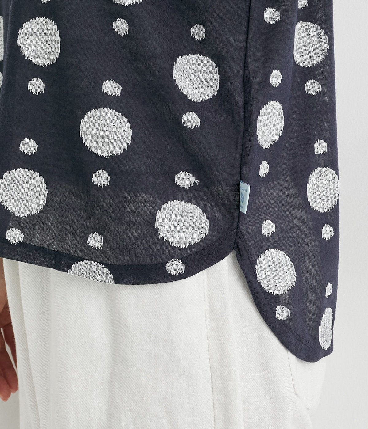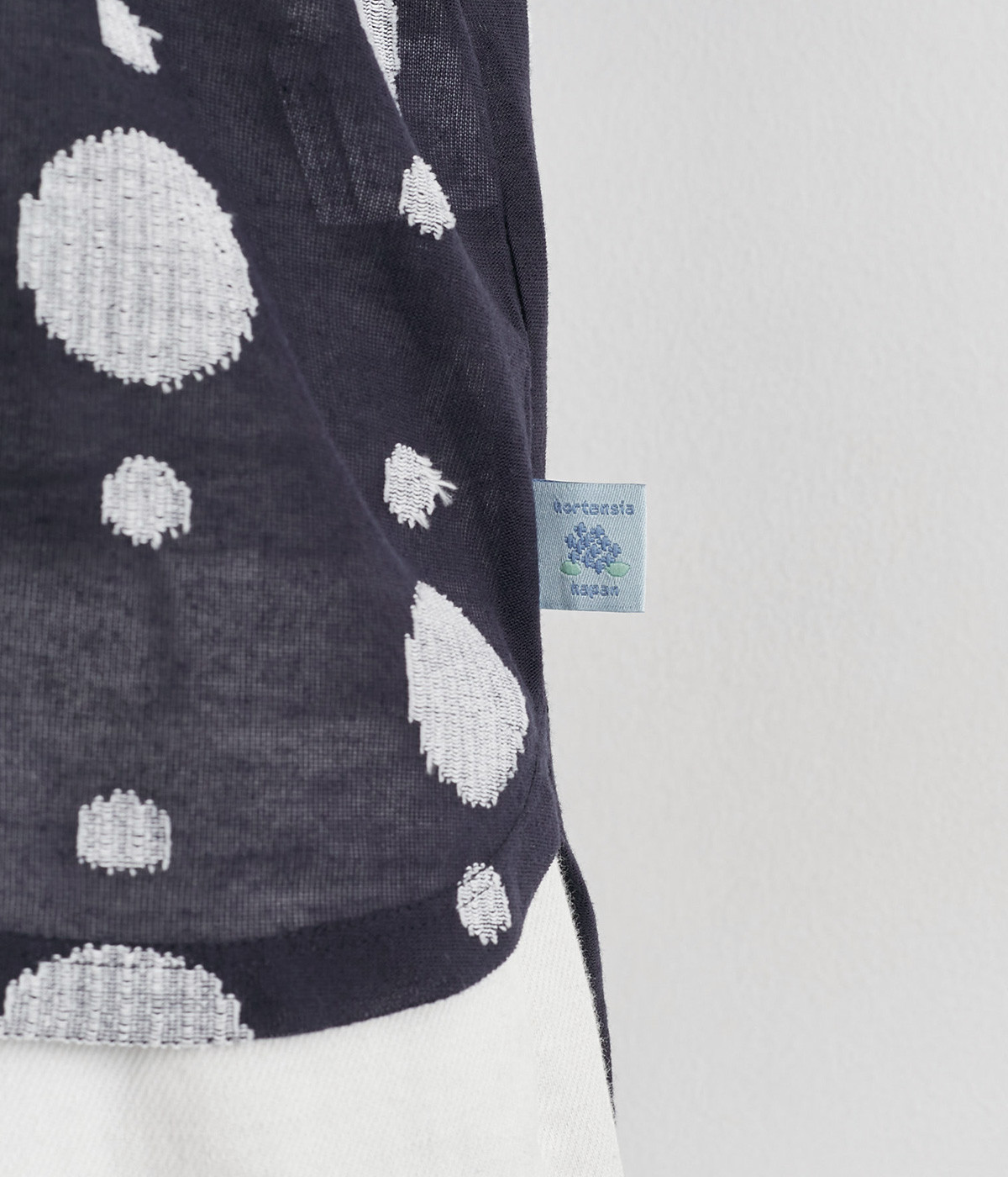 雨のしずくがぽつぽつと降ってくる様子をイメージしたドット柄が印象的な一枚。左脇のピスネームには、あじさいの色についてのちょっとした豆知識をプラスしたアソビ心のあるデザインです。インナーとのレイヤードをおたのしみください。