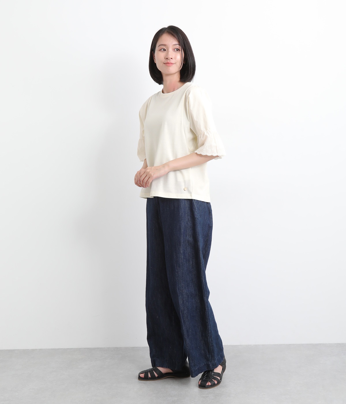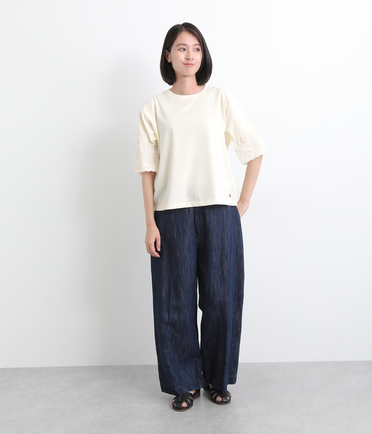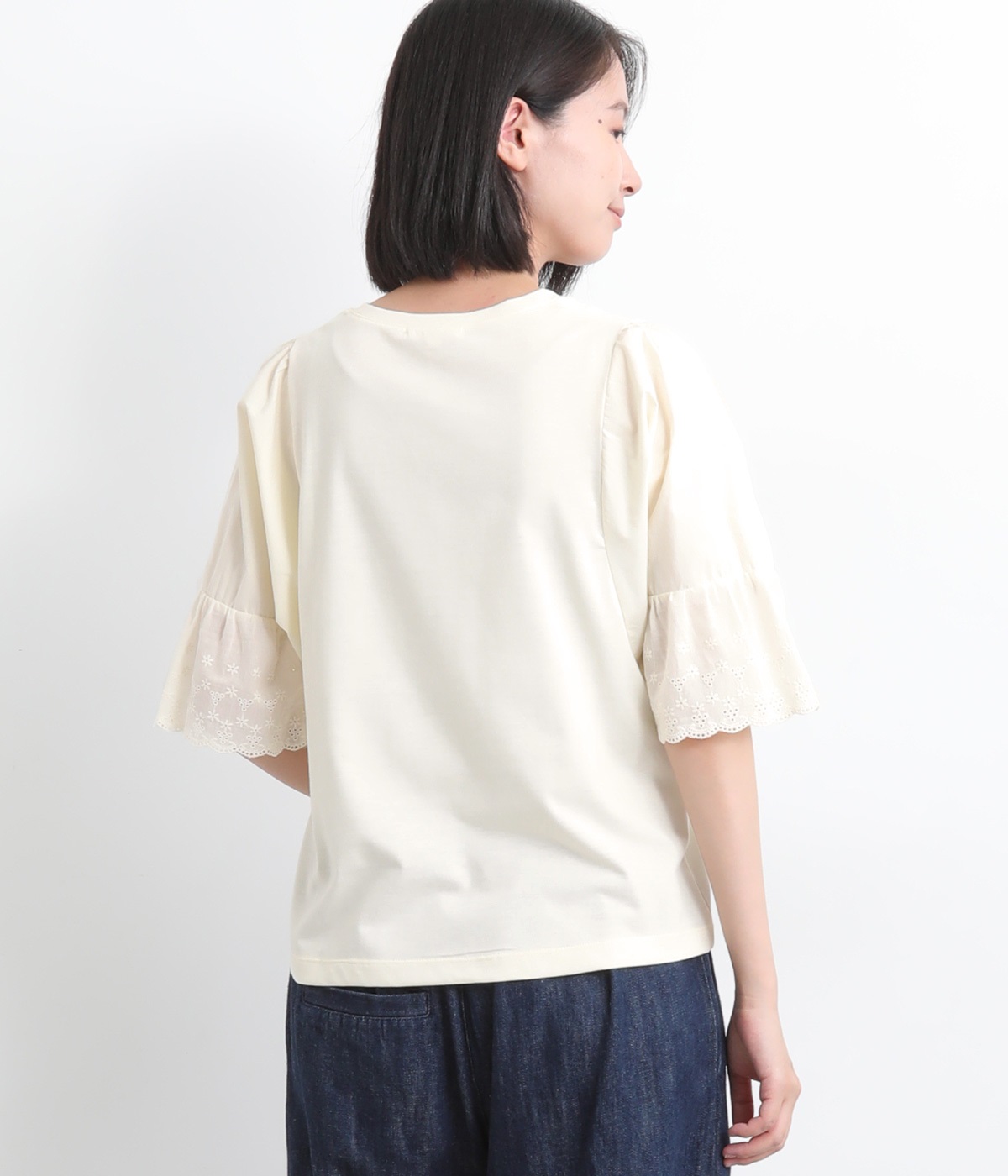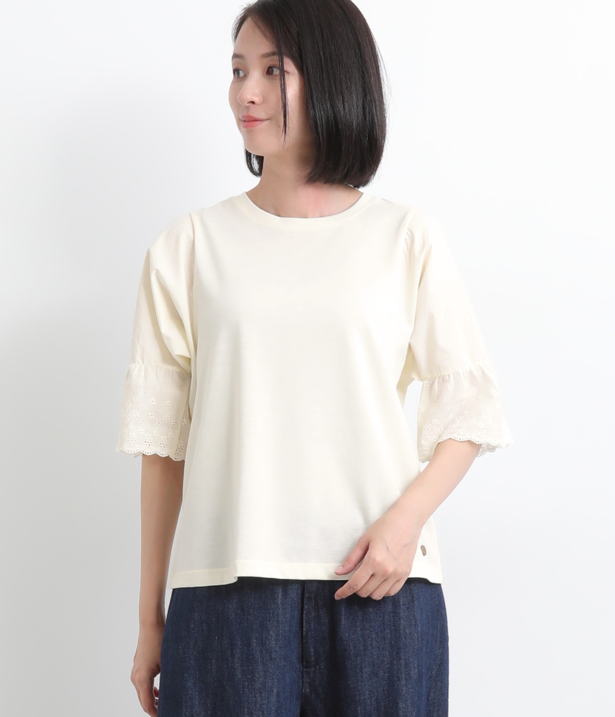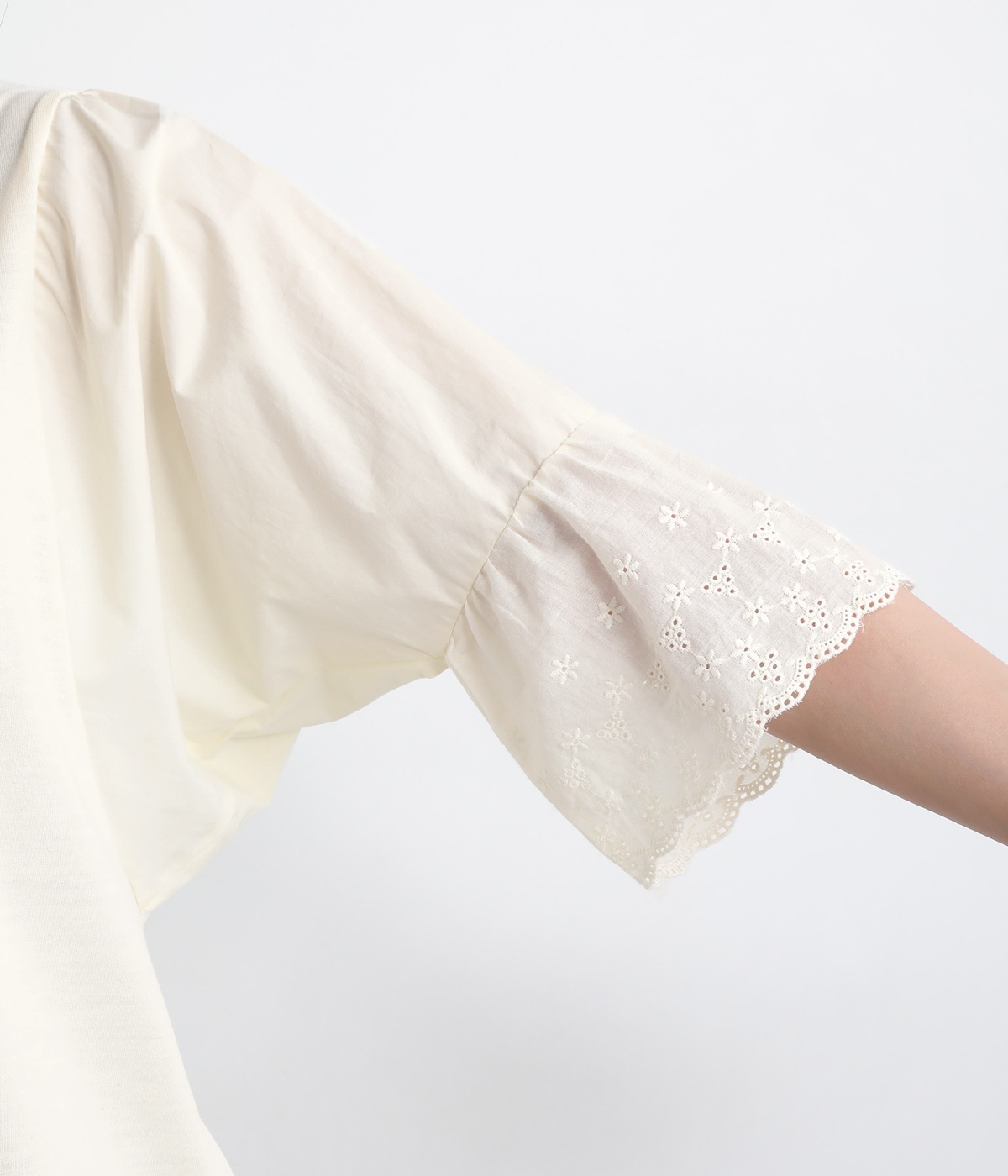 身頃部分はやわらかで着心地のいい綿混カットソーを、袖はさらりと軽やかな布帛生地を組み合わせています。さらに袖口にはレースをあしらった異素材使いです。