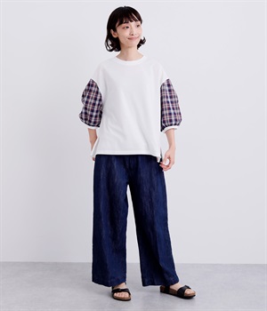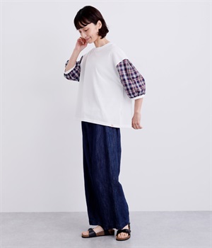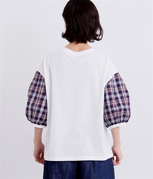 袖山のタックと袖口ギャザーでふわりとさせたシルエットがデイリースタイルの可愛らしいポイントになる一枚。ベースは伸縮性素材のボックスシルエットでカジュアルに着こなせます。裾スリット入りなので軽いタックインからラフなアウトまで◎。