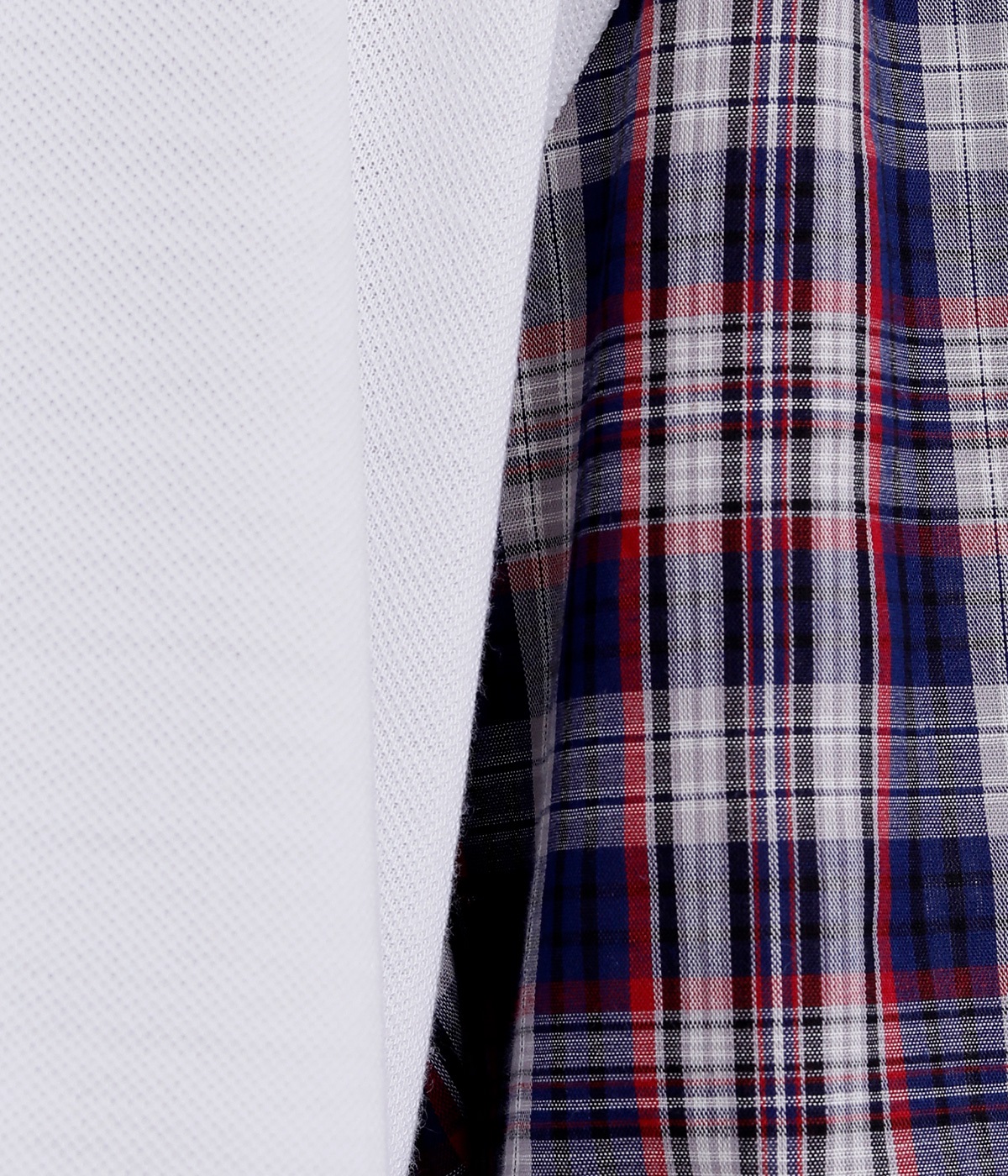 通気性が良くサラッとした肌触りが心地よい鹿の子生地をベースに、薄手の先染めチェック生地を組み合わせました。無地×柄のメリハリをつけた異素材コンビです。