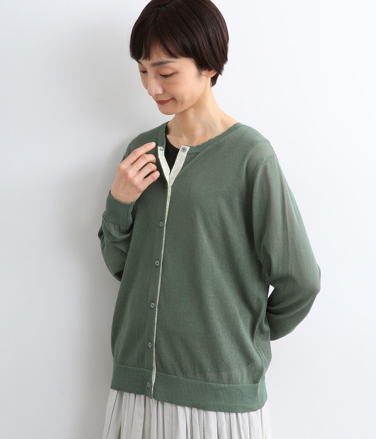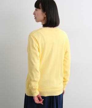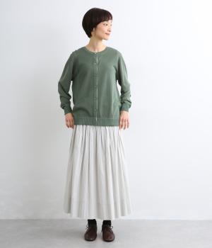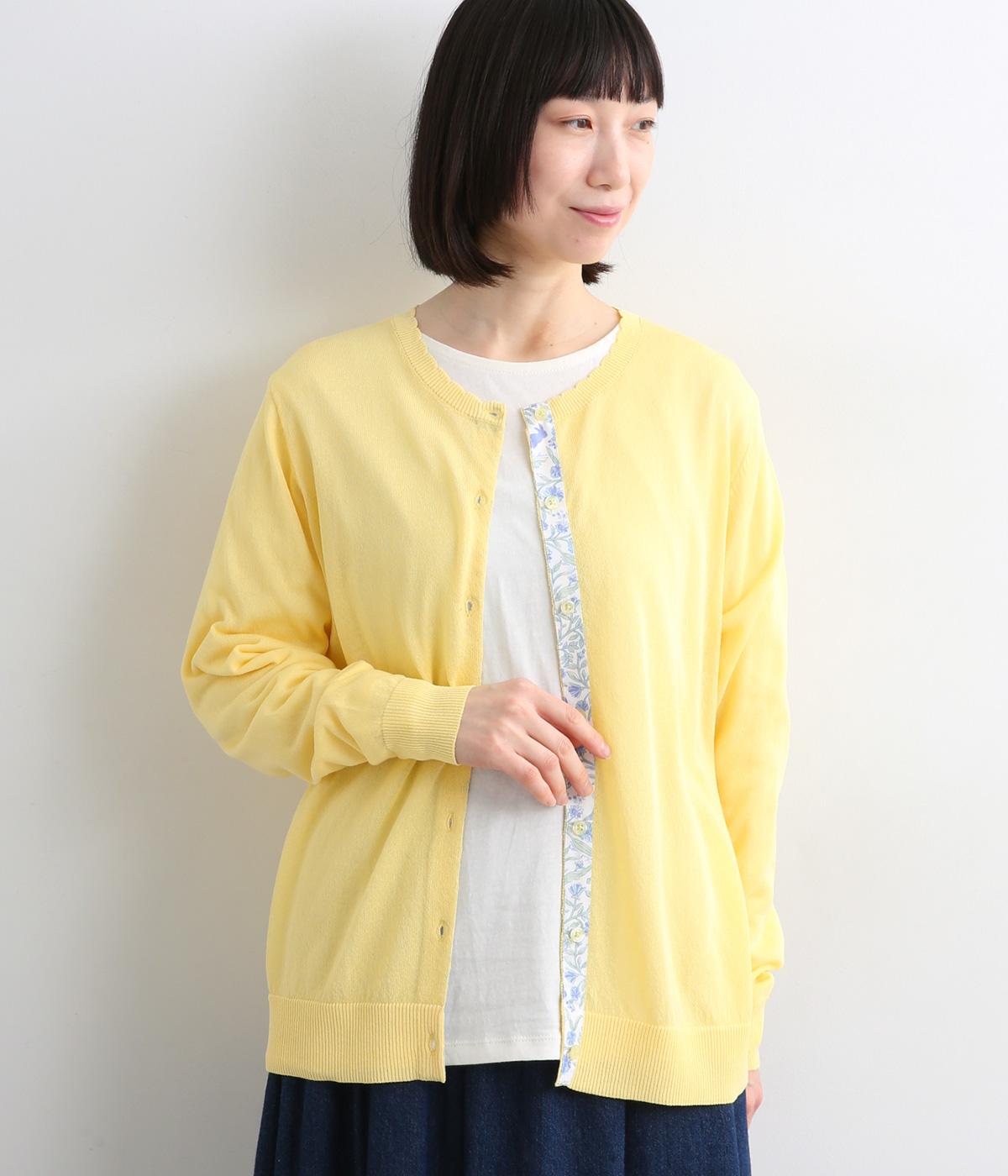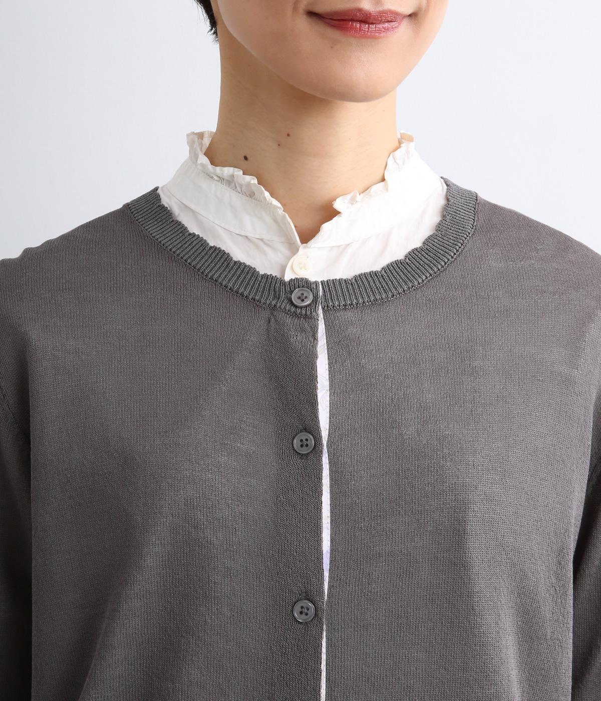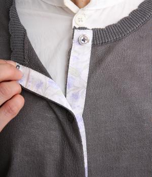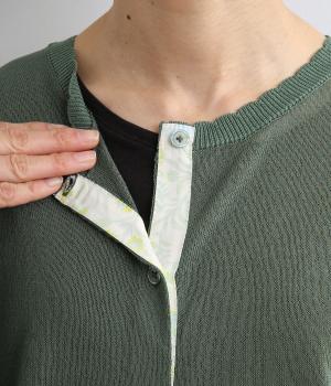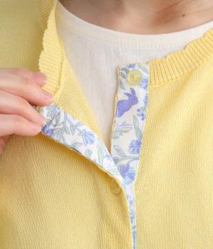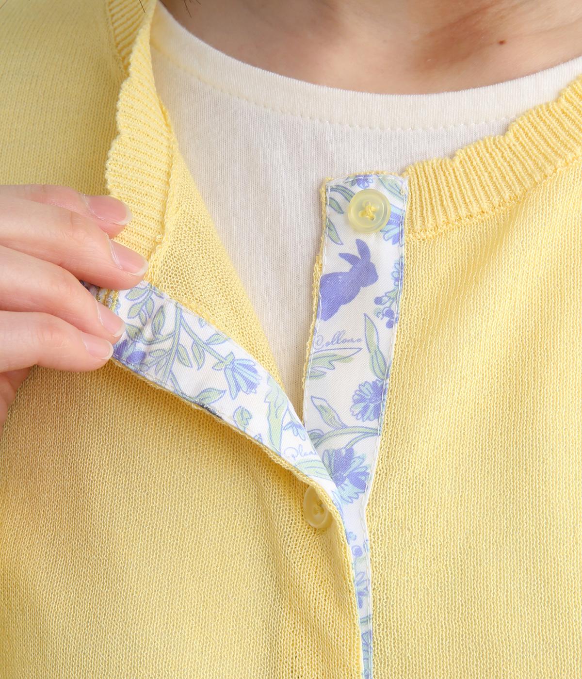一見シンプルな無地デザインながら、前立てにオリジナルの柄生地を配してさり気ないポイントを設けました。襟元のスカラップリブも可愛らしくさわやかな柄の世界観にマッチ。甘さと大人っぽさのバランスがいい一枚です。