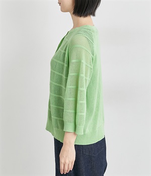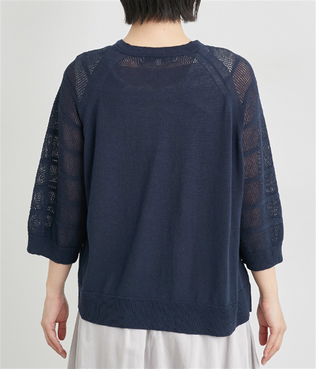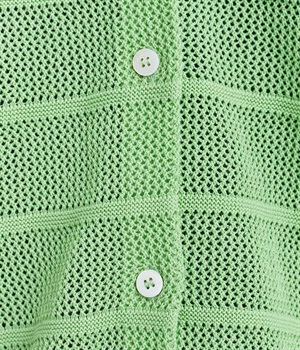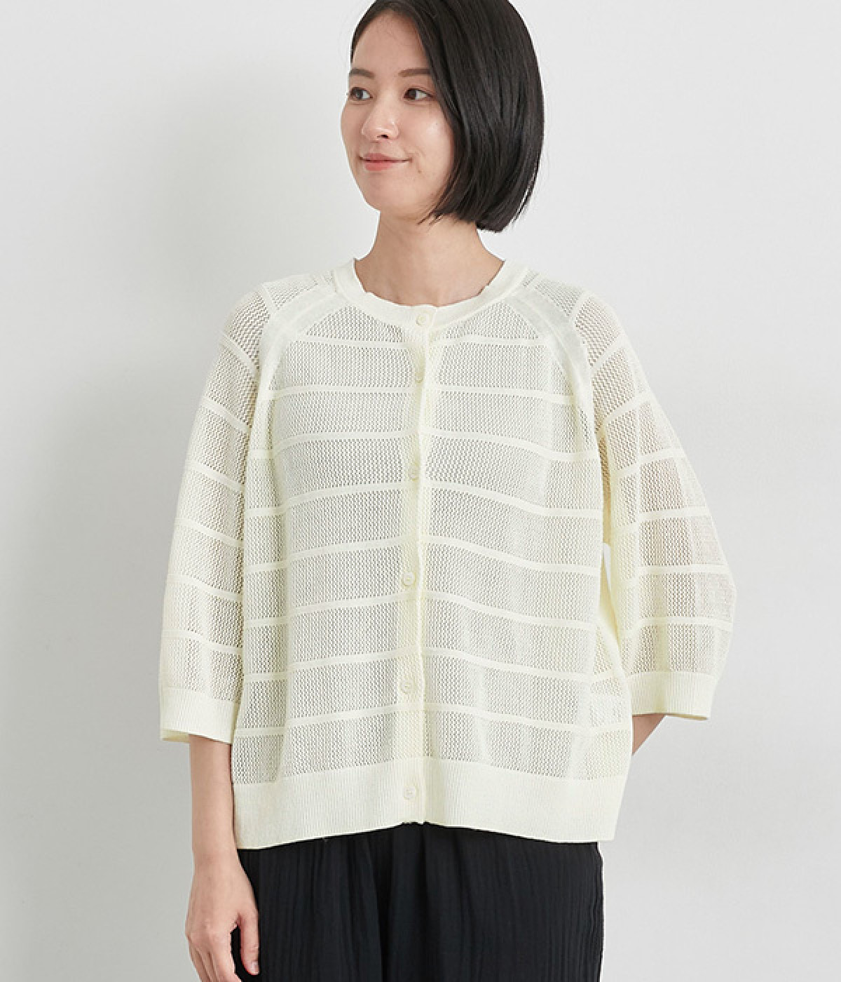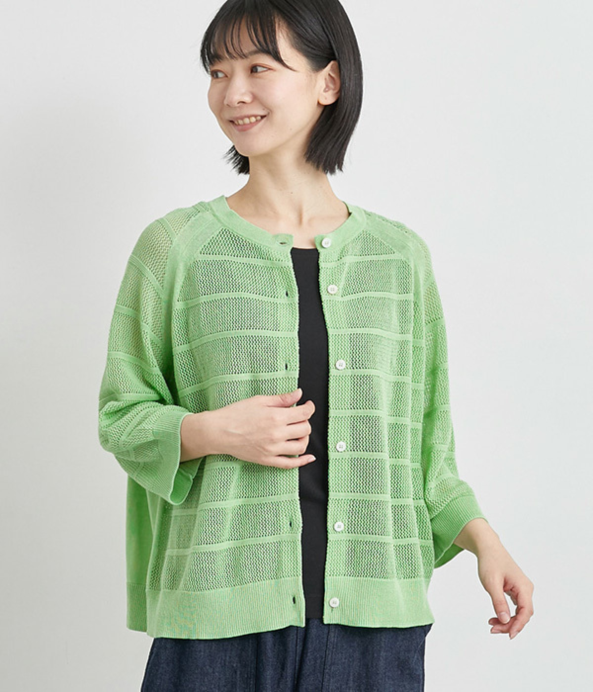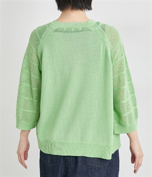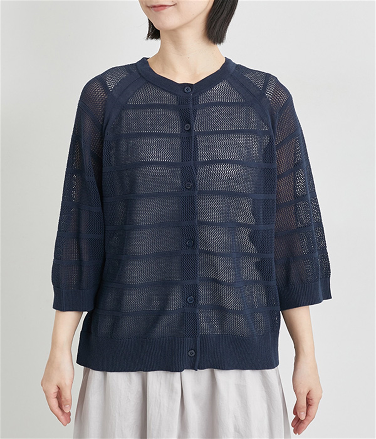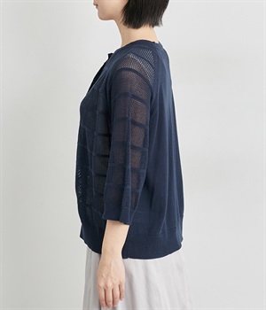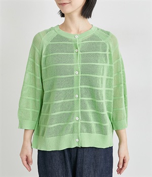 インナーを活かした重ね着がたのしめるメッシュ編みのカーディガンです。ほどよくゆとりのあるサイズ感で着合わせしやすく、後ろは透け具合を減らしているのでスタイリングしやすくなっています。