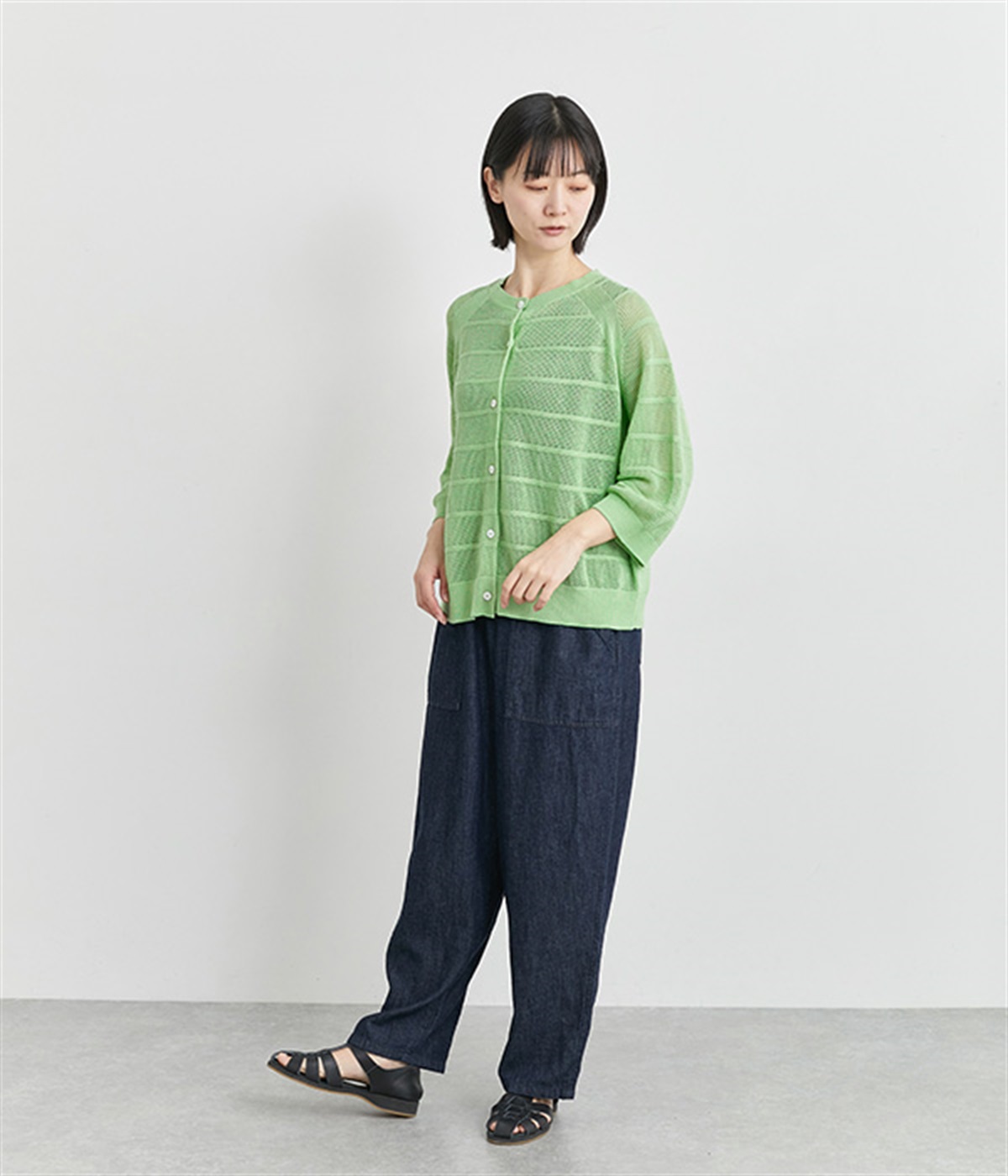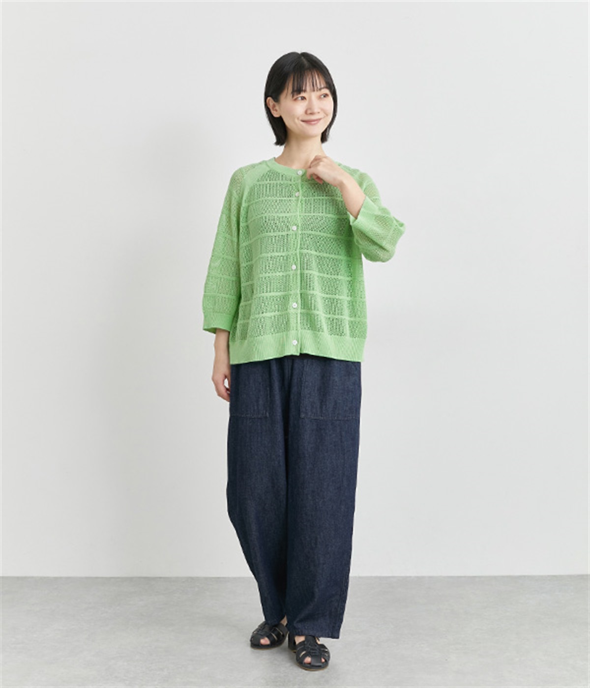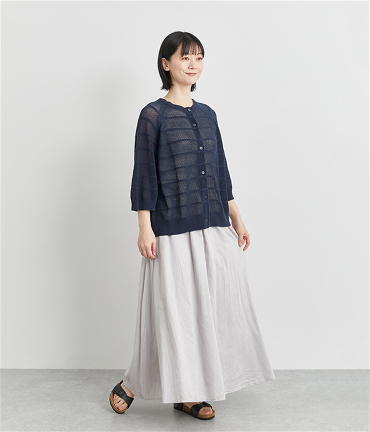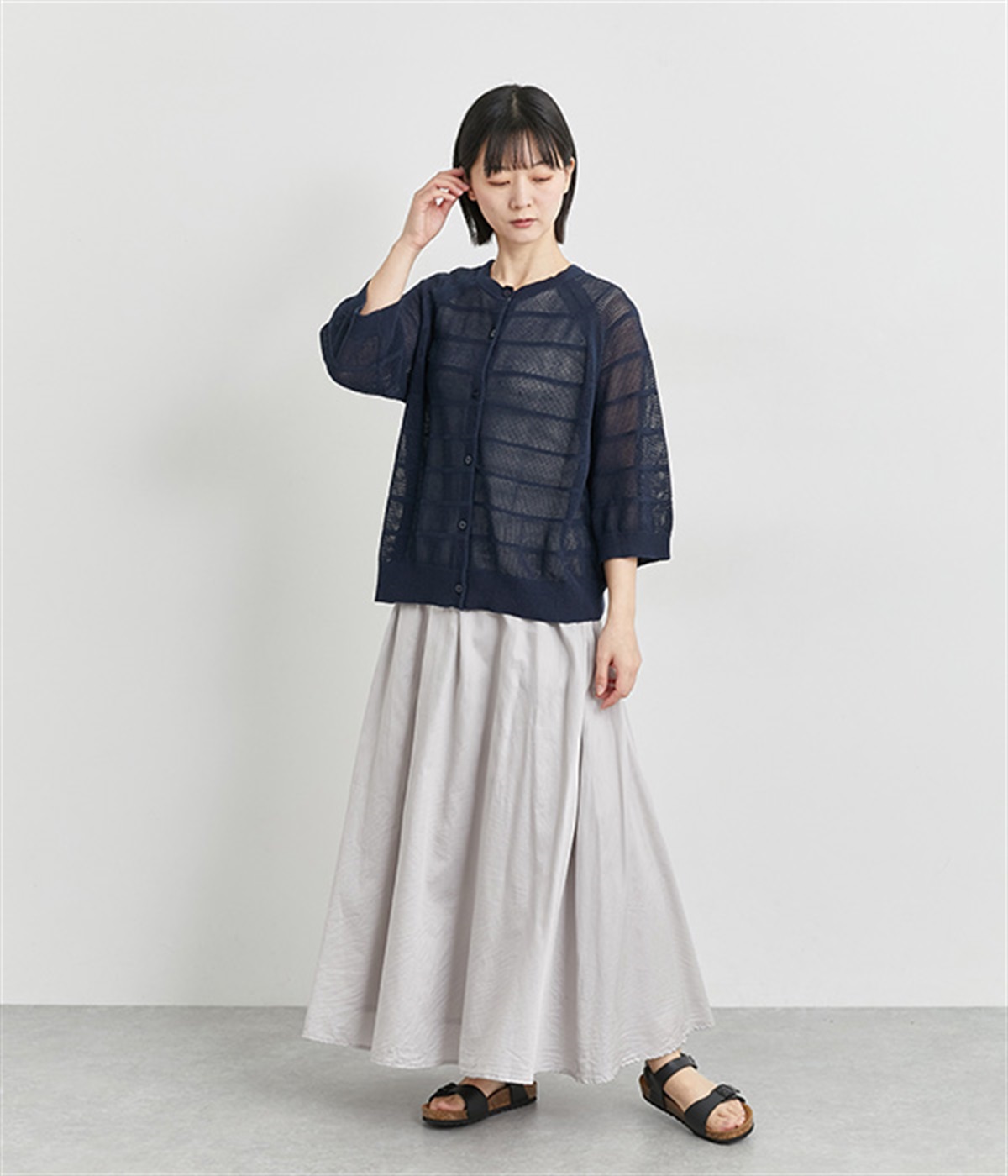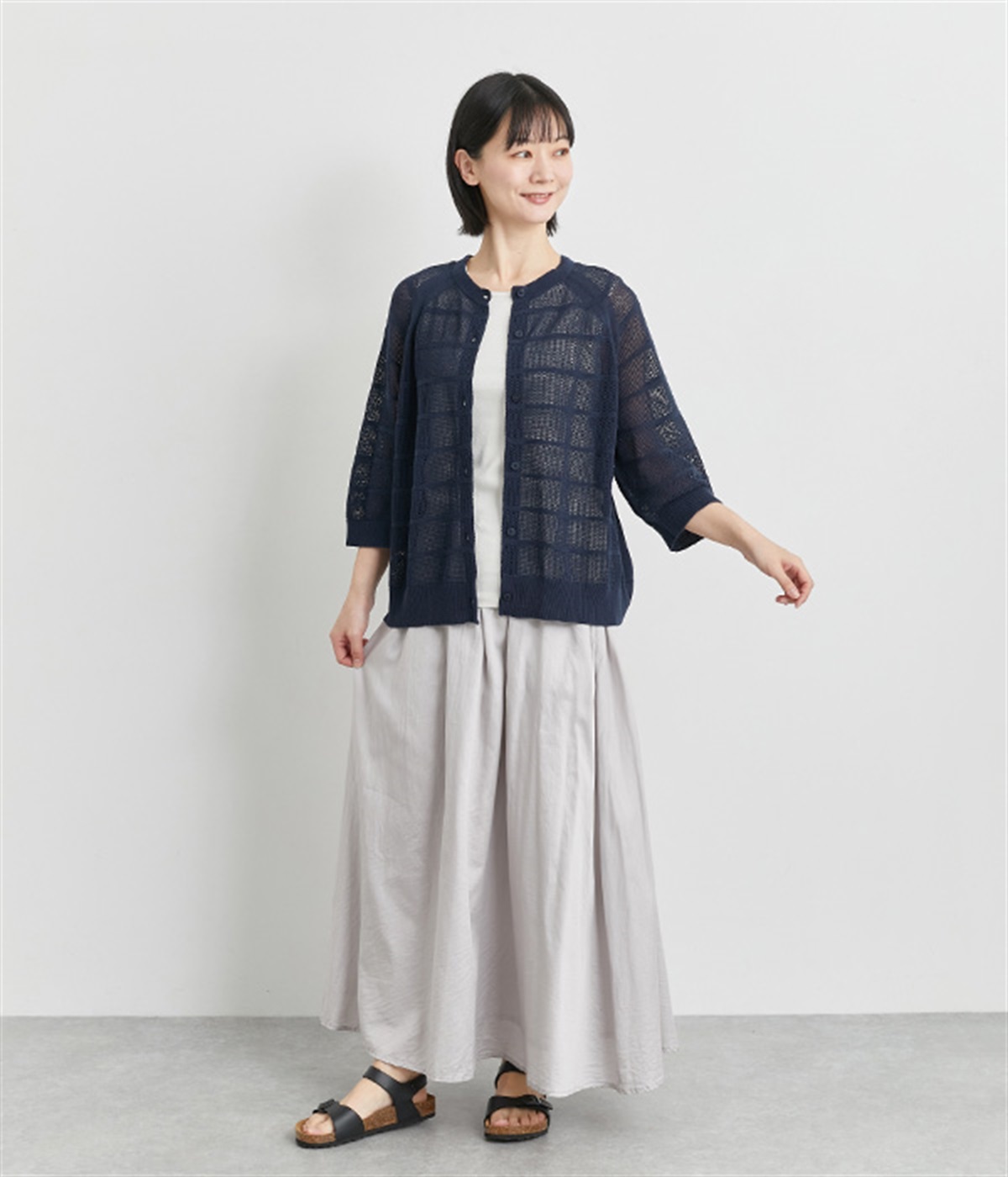 インナーを活かした重ね着がたのしめるメッシュ編みのカーディガンです。ほどよくゆとりのあるサイズ感で着合わせしやすく、後ろは透け具合を減らしているのでスタイリングしやすくなっています。
