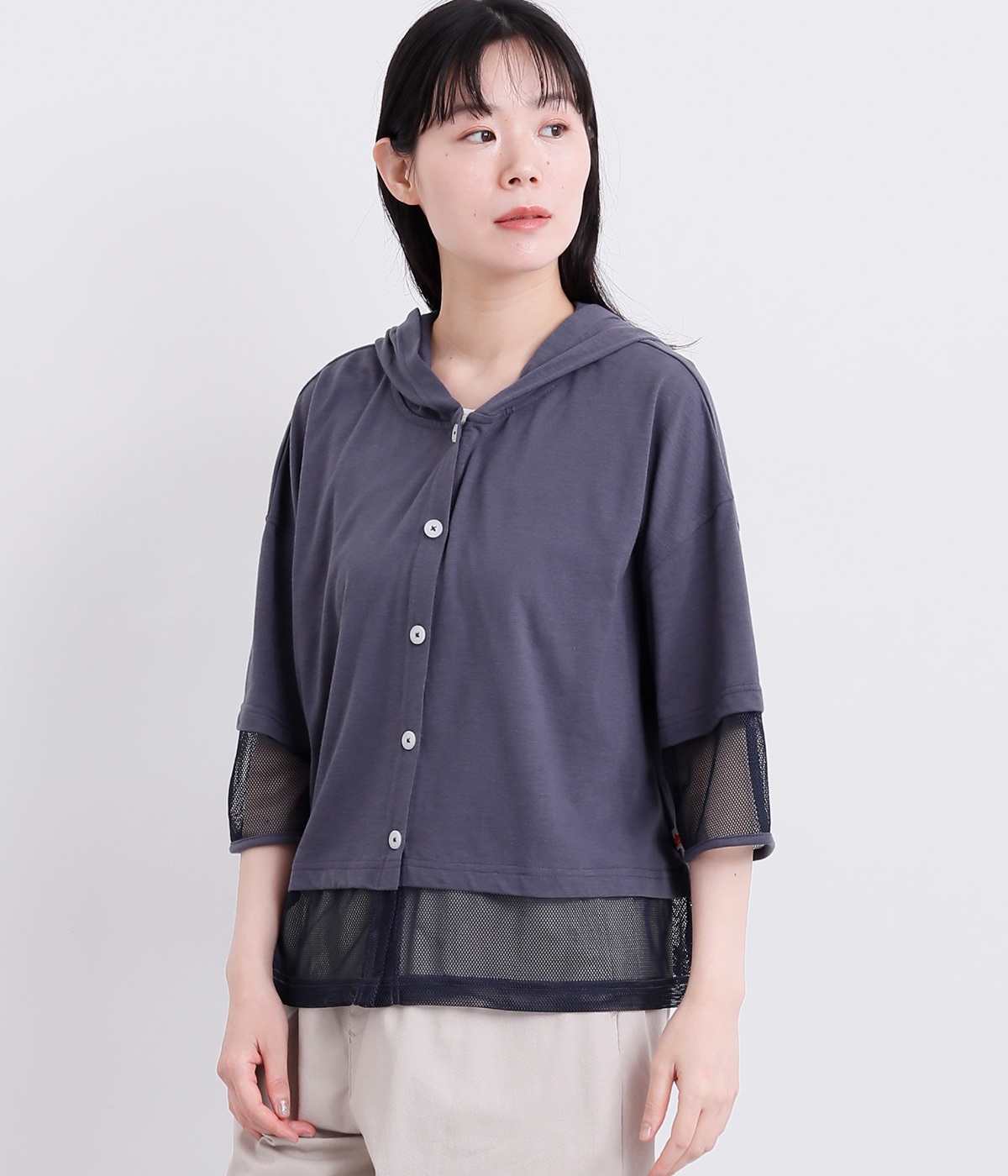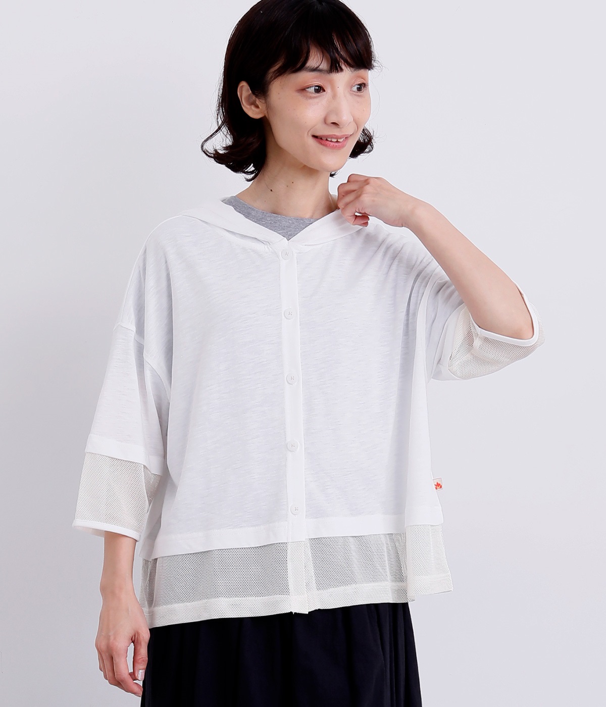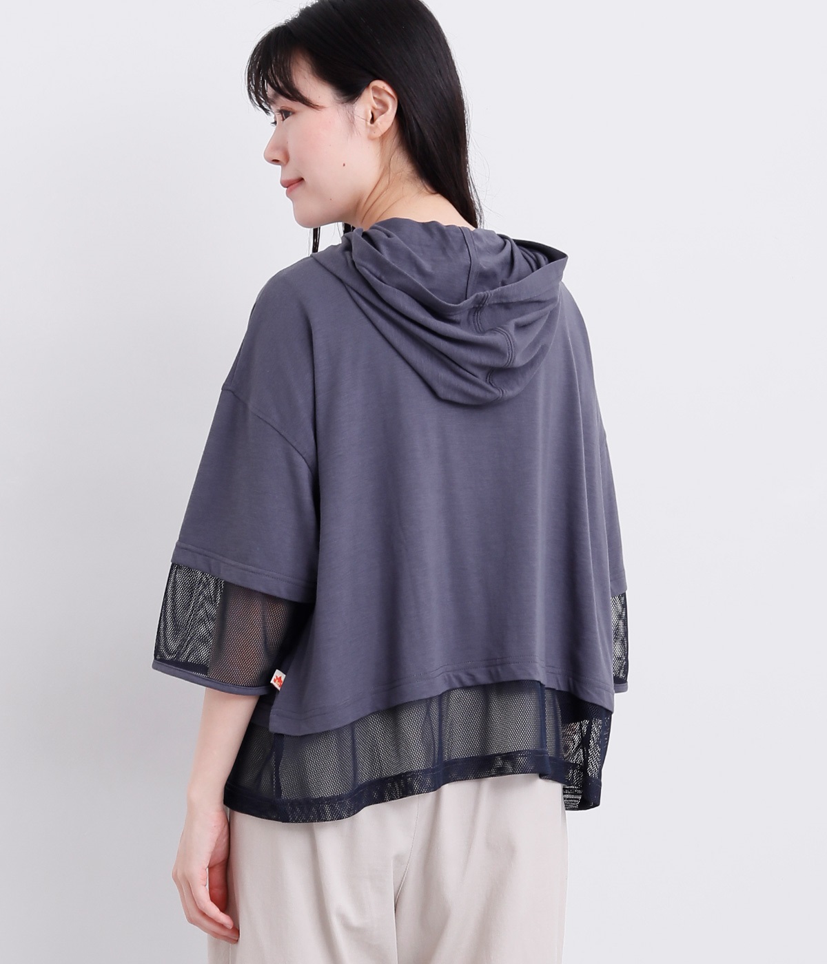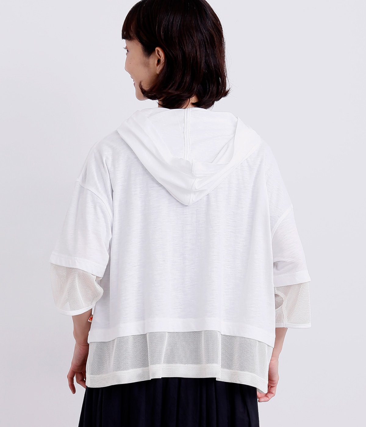 カットソー生地でカジュアル感を、メッシュ生地で軽やかさと涼し気な印象を足した異素材コンビのパーカーです。ワイドシルエットなのでさまざまなインナーと合わせやすくなっています。