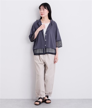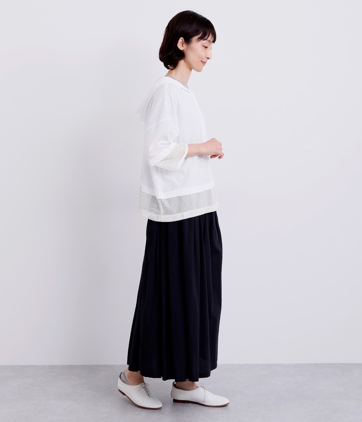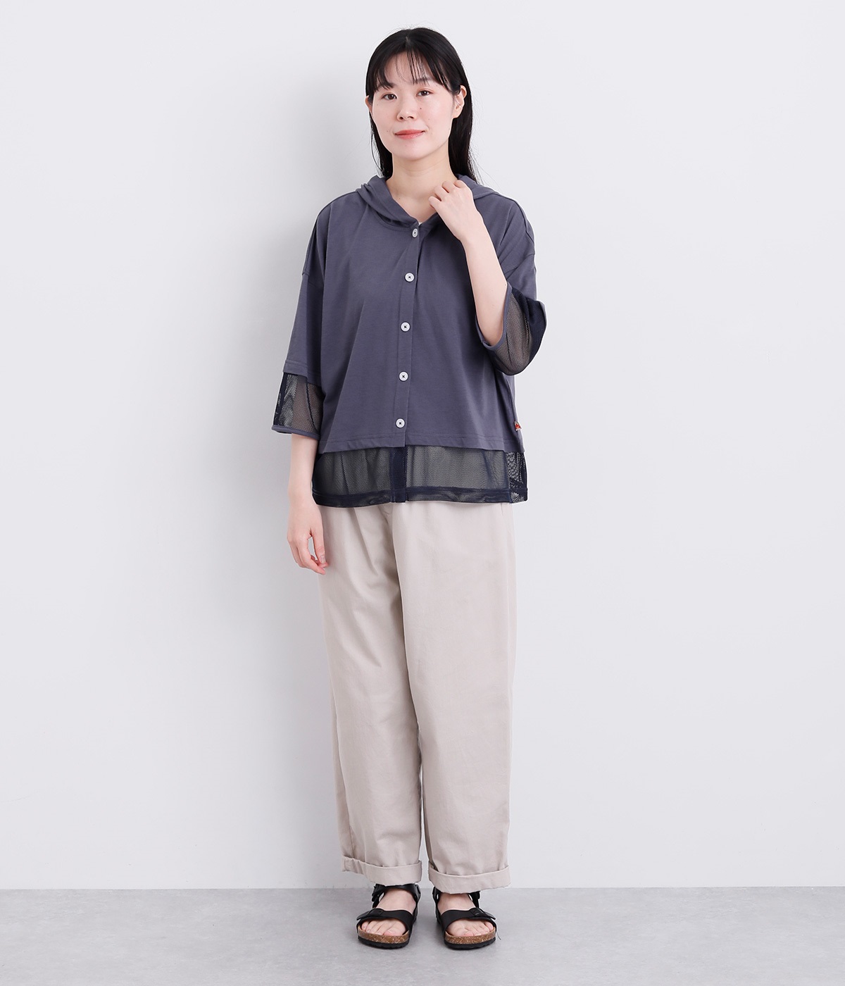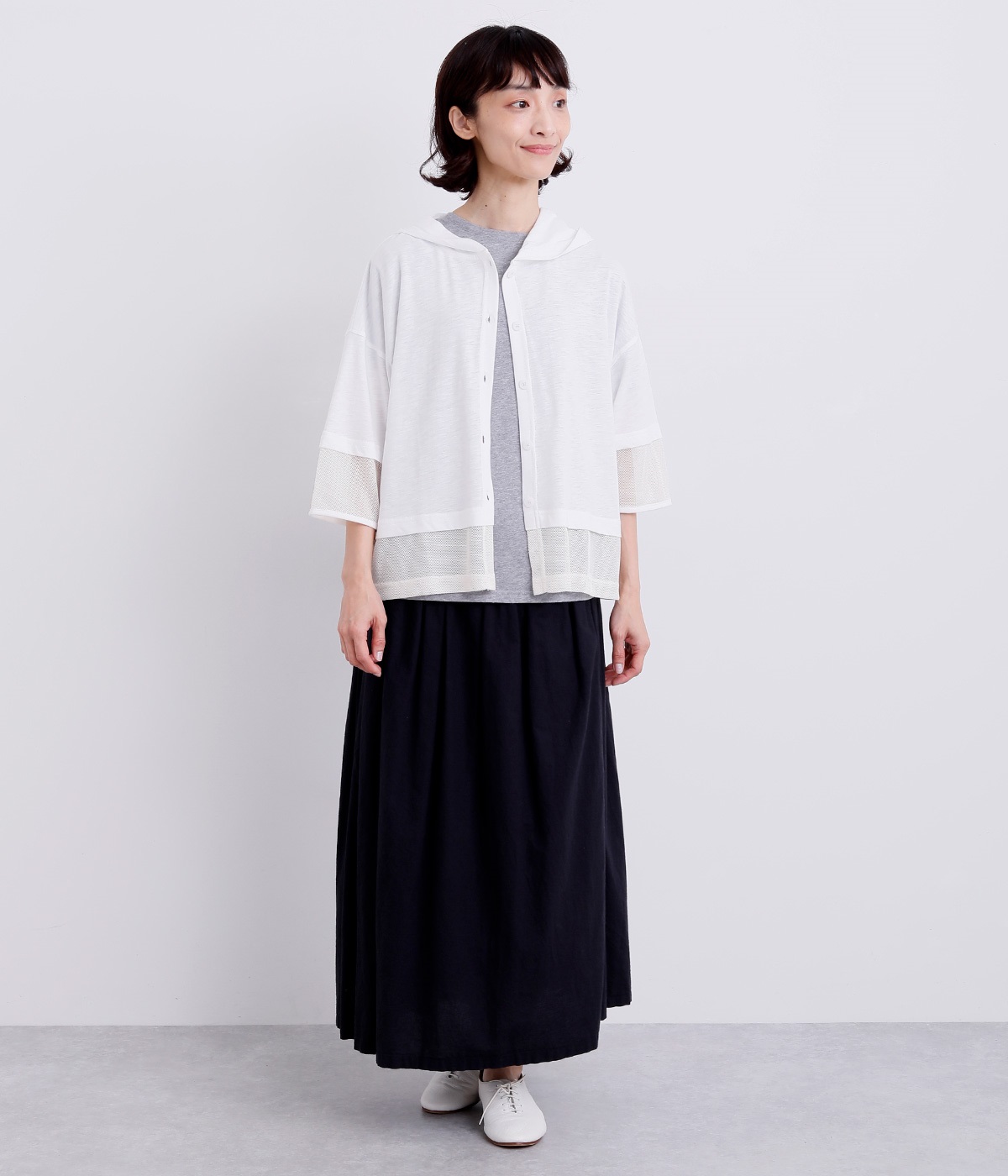 カットソー生地でカジュアル感を、メッシュ生地で軽やかさと涼し気な印象を足した異素材コンビのパーカーです。ワイドシルエットなのでさまざまなインナーと合わせやすくなっています。