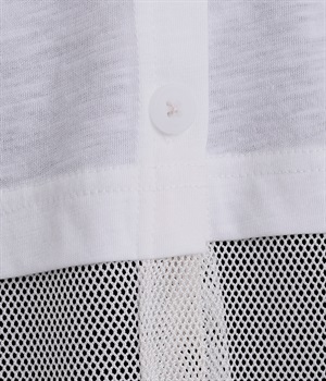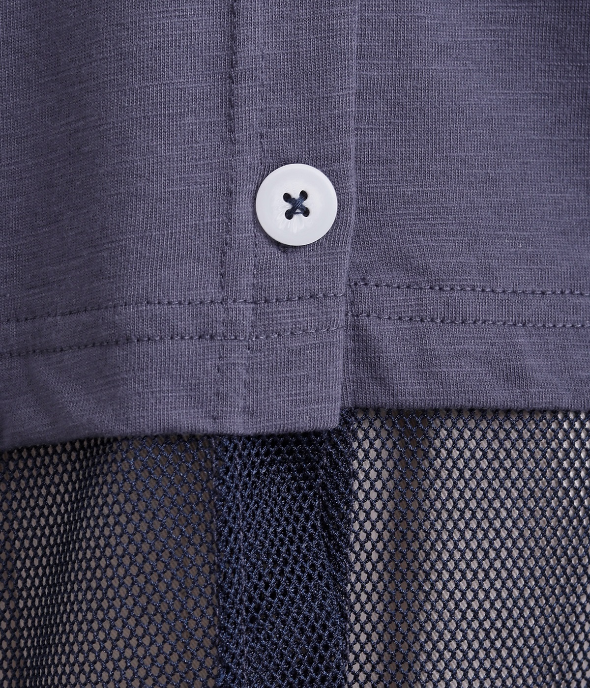ヴィンテージ感がナチュラルな風合いをより惹き立てる綿混スラブ生地をベースにしています。袖と裾をメッシュ生地に切り替えた涼し気な仕上がりです。