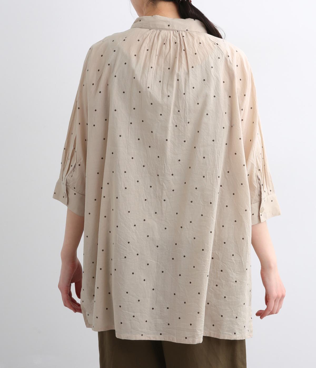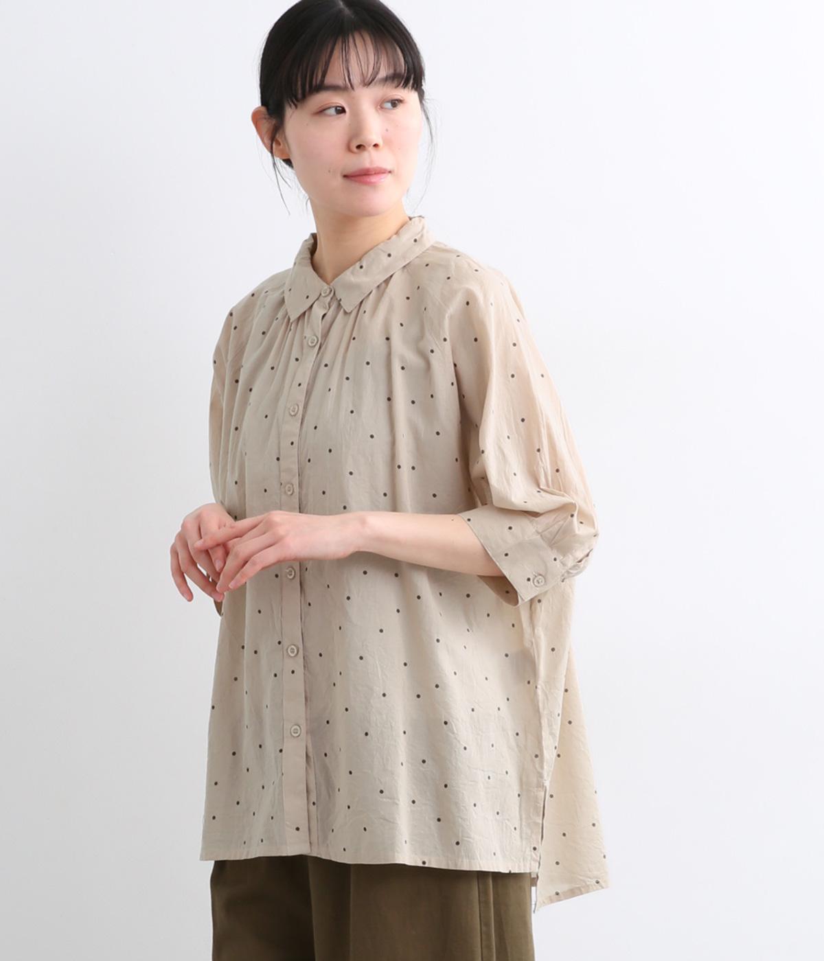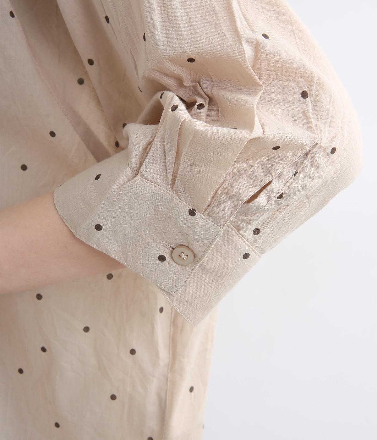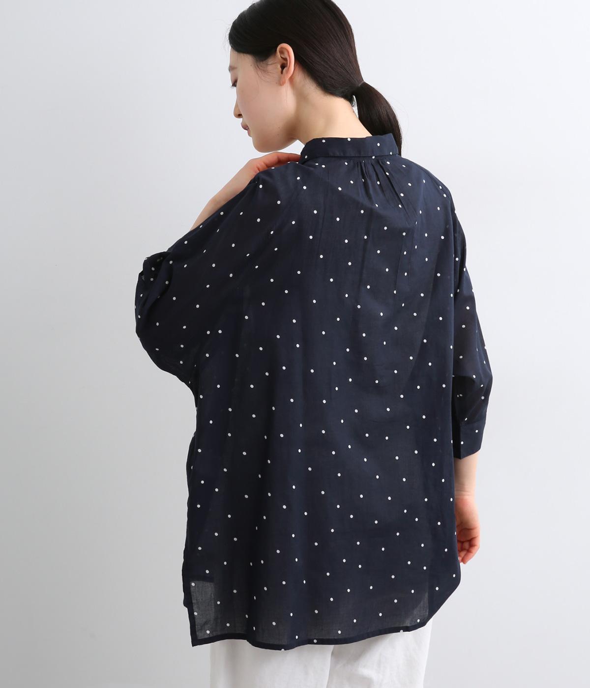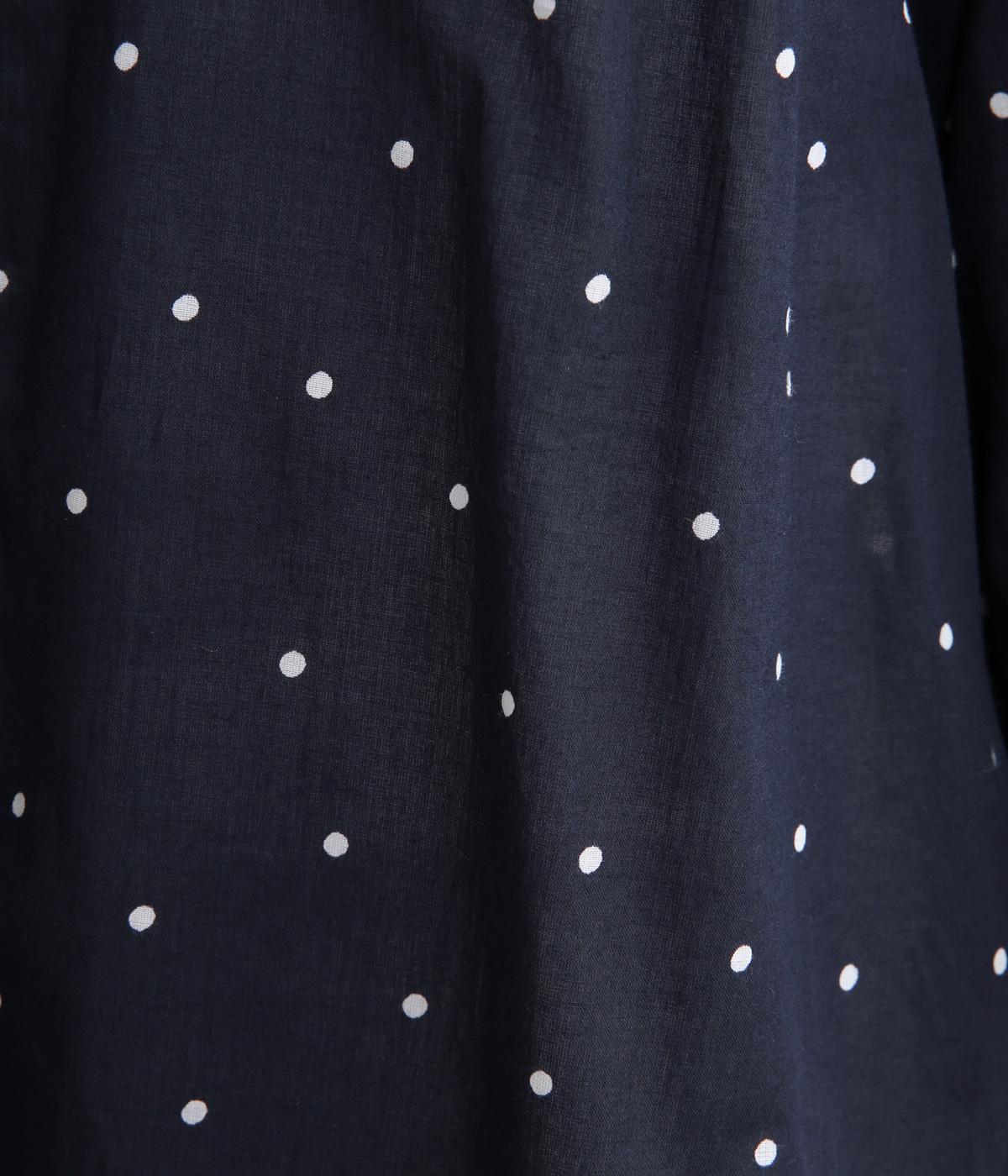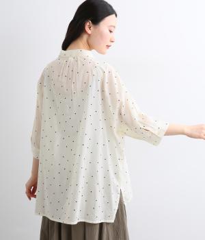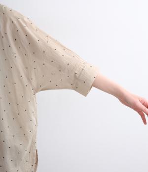 軽やかな生地が揺れるたびに柔らかい表情を生み、大人かわいいムードを添えます。上品で甘すぎないドット柄が、大人かわいい雰囲気を引き立てます。腰まわりをカバーするゆったりシルエットに、手首が見える七分袖で抜け感のある仕上がりです。