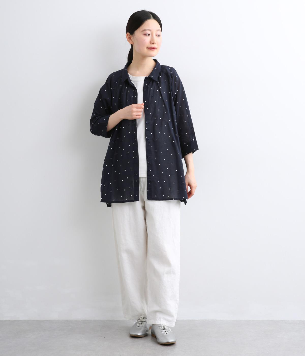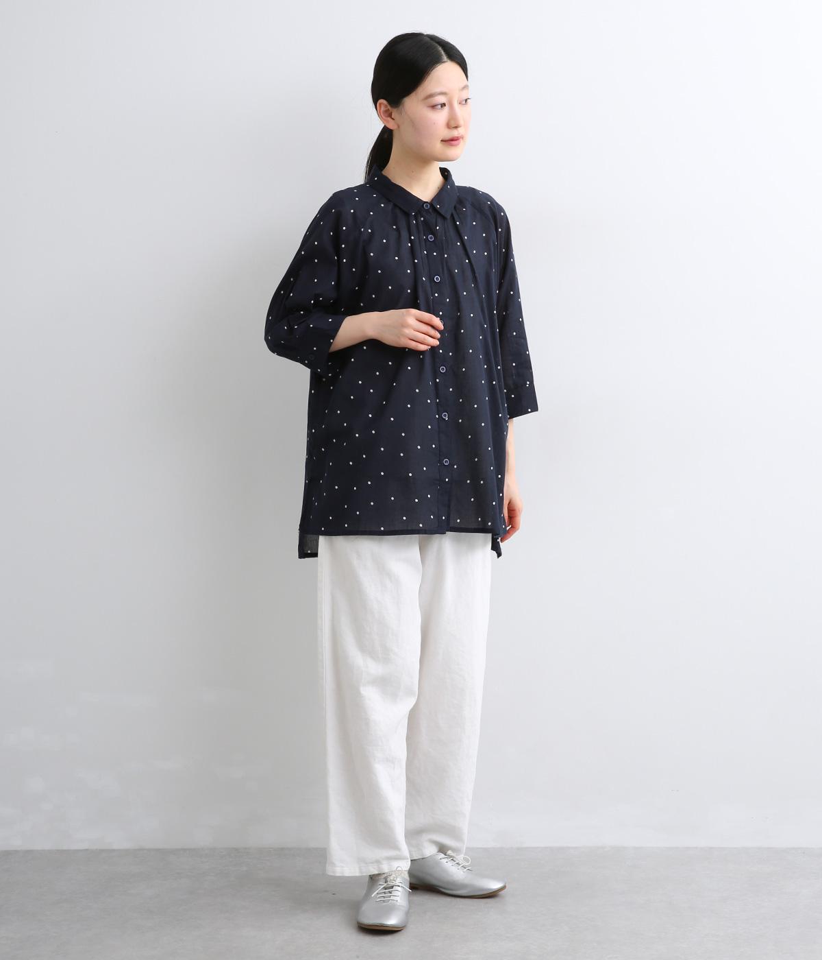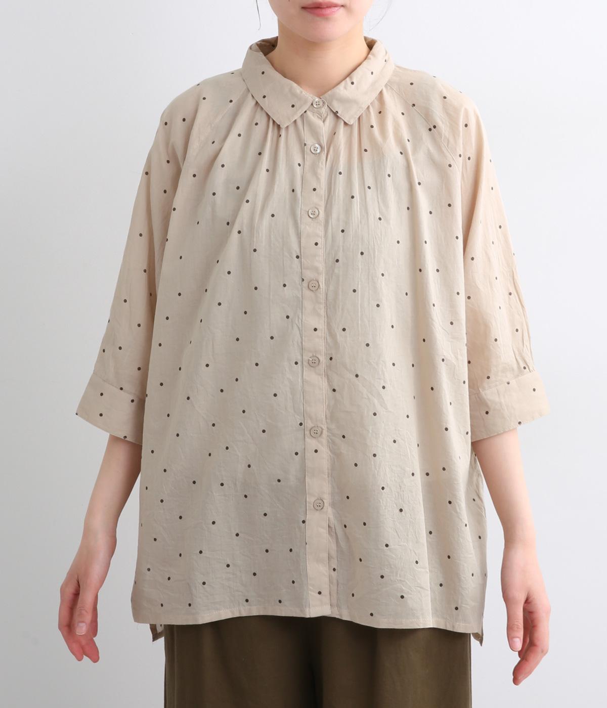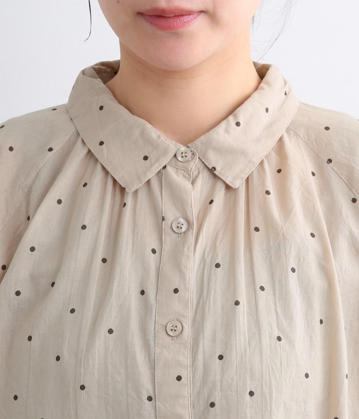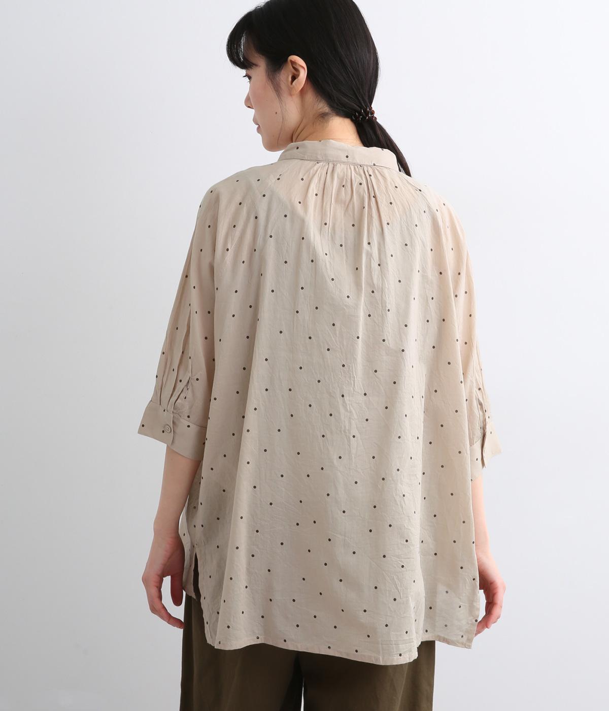 軽やかな生地が揺れるたびに柔らかい表情を生み、大人かわいいムードを添えます。上品で甘すぎないドット柄が、大人かわいい雰囲気を引き立てます。腰まわりをカバーするゆったりシルエットに、手首が見える七分袖で抜け感のある仕上がりです。