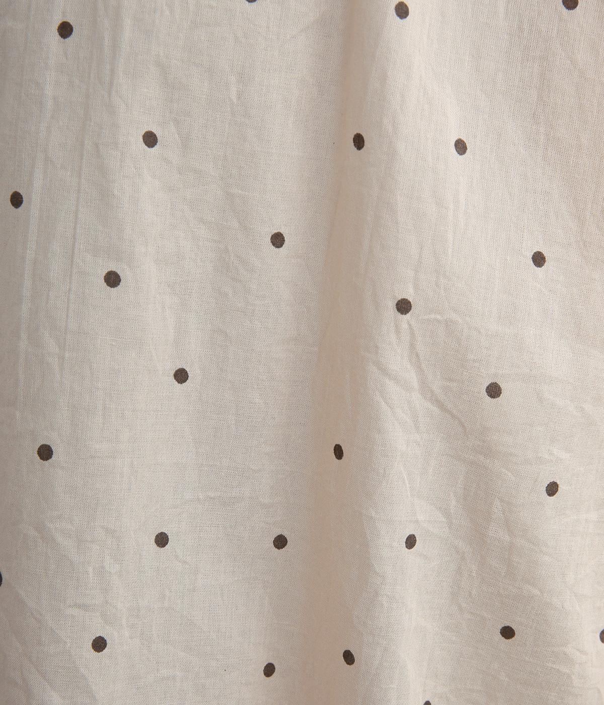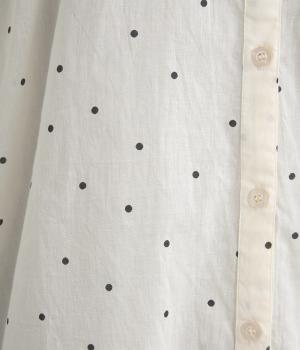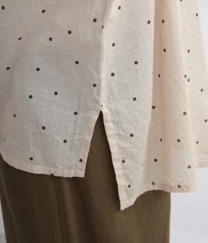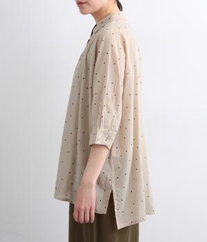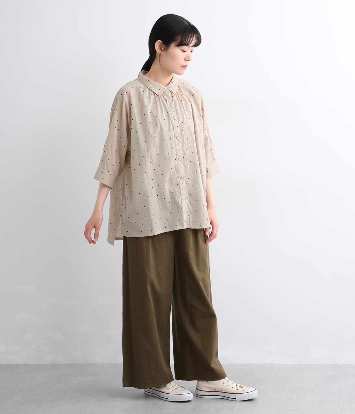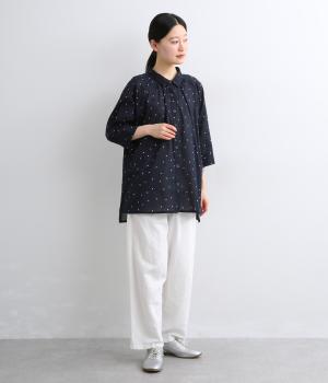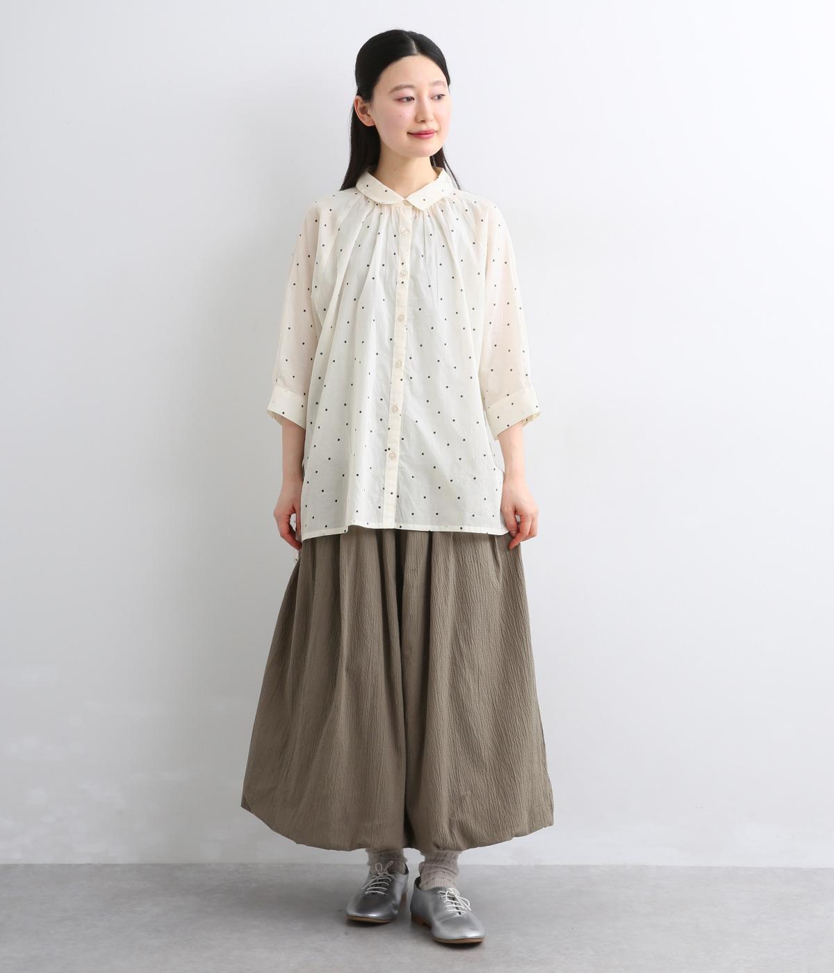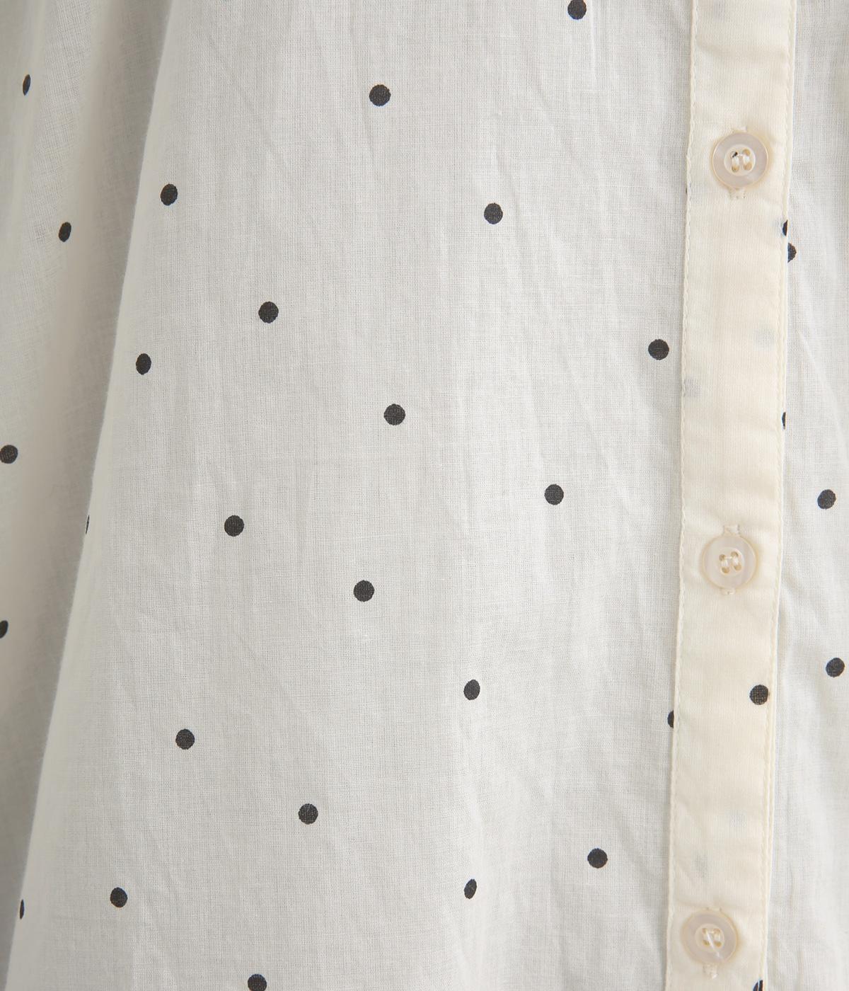 軽やかな生地が揺れるたびに柔らかい表情を生み、大人かわいいムードを添えます。上品で甘すぎないドット柄が、大人かわいい雰囲気を引き立てます。腰まわりをカバーするゆったりシルエットに、手首が見える七分袖で抜け感のある仕上がりです。