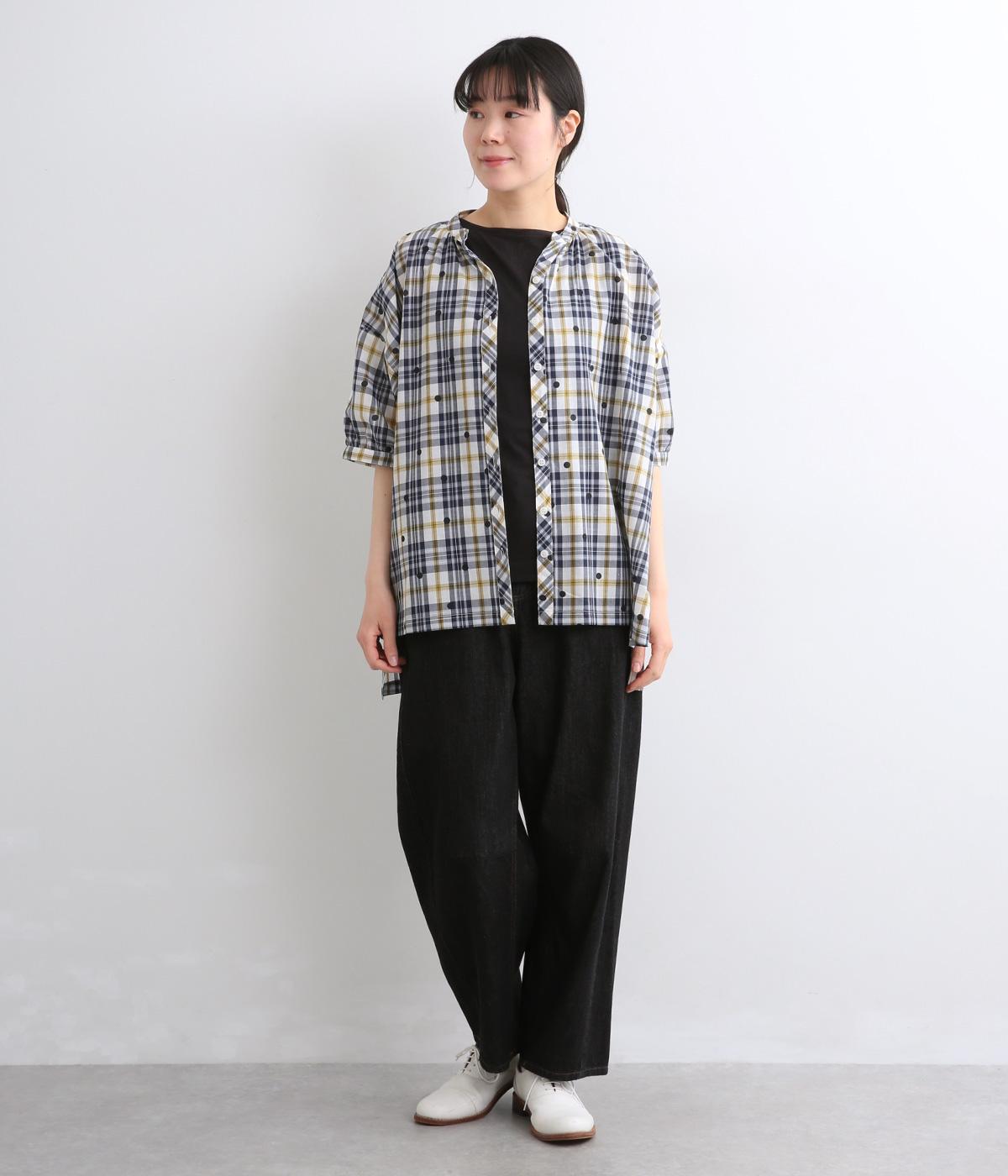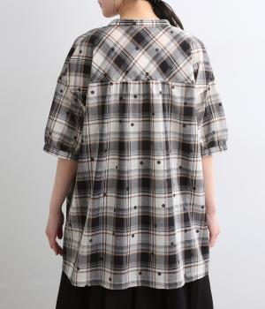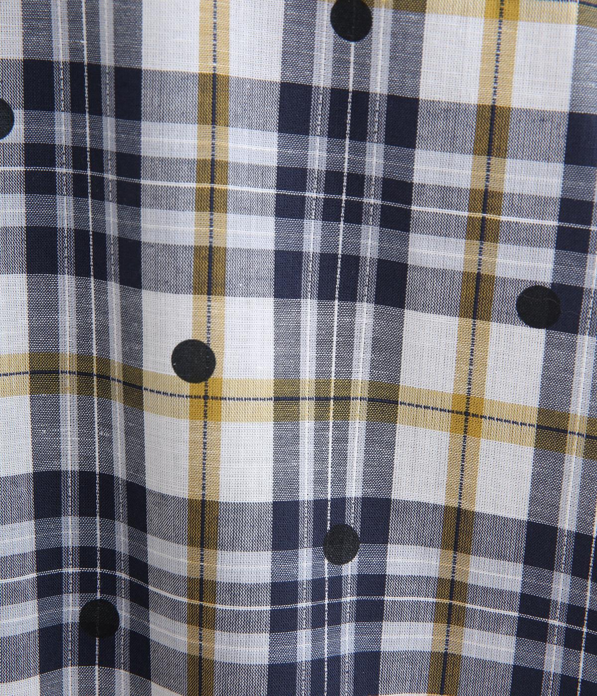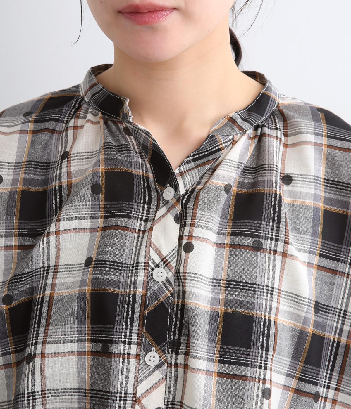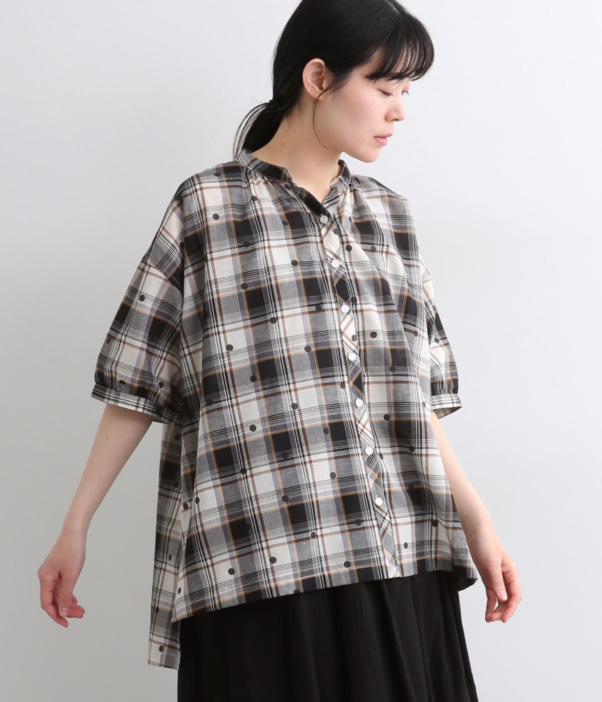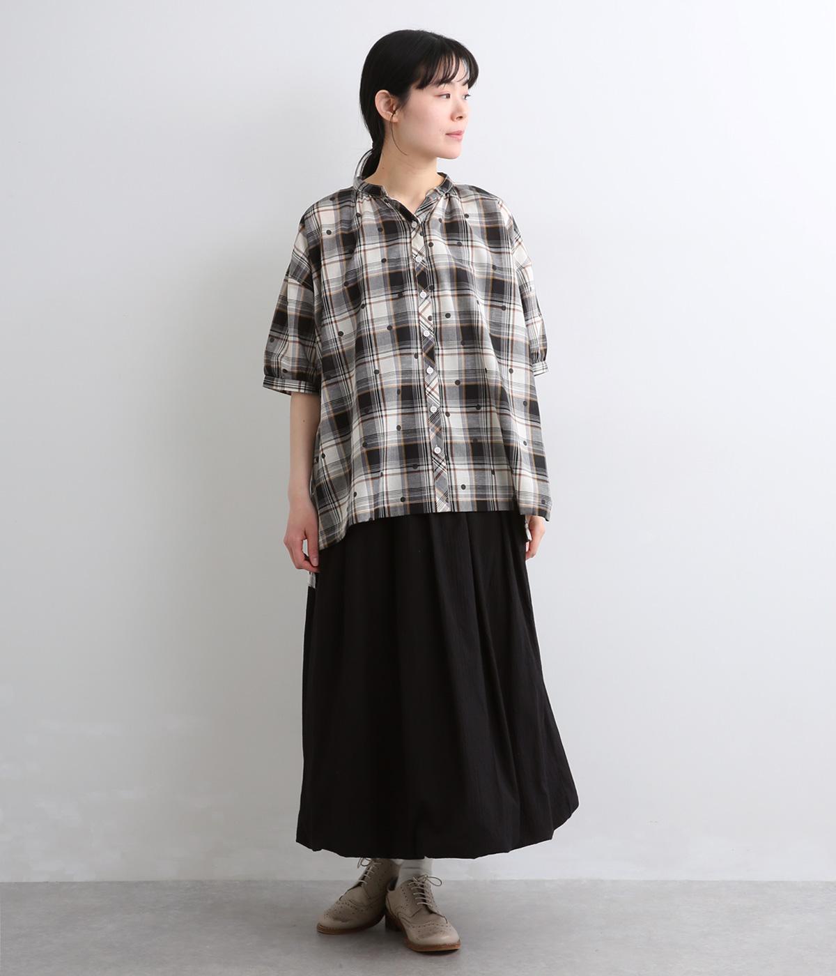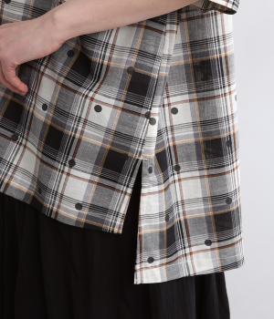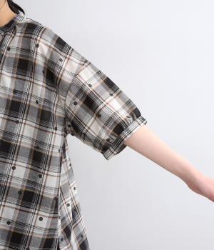 ジャカード織のチェック柄にドットプリントをあしらい、カジュアルな中にさりげなく華やかさが光ります。オーバーサイズのシルエットが軽やかな生地感を引き立てて、動きに合わせてふわりと揺れます。