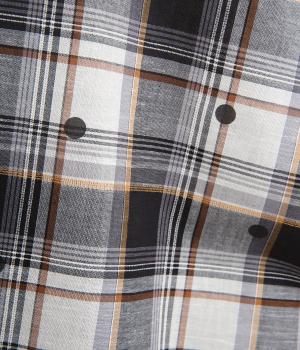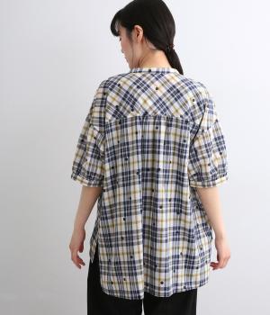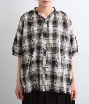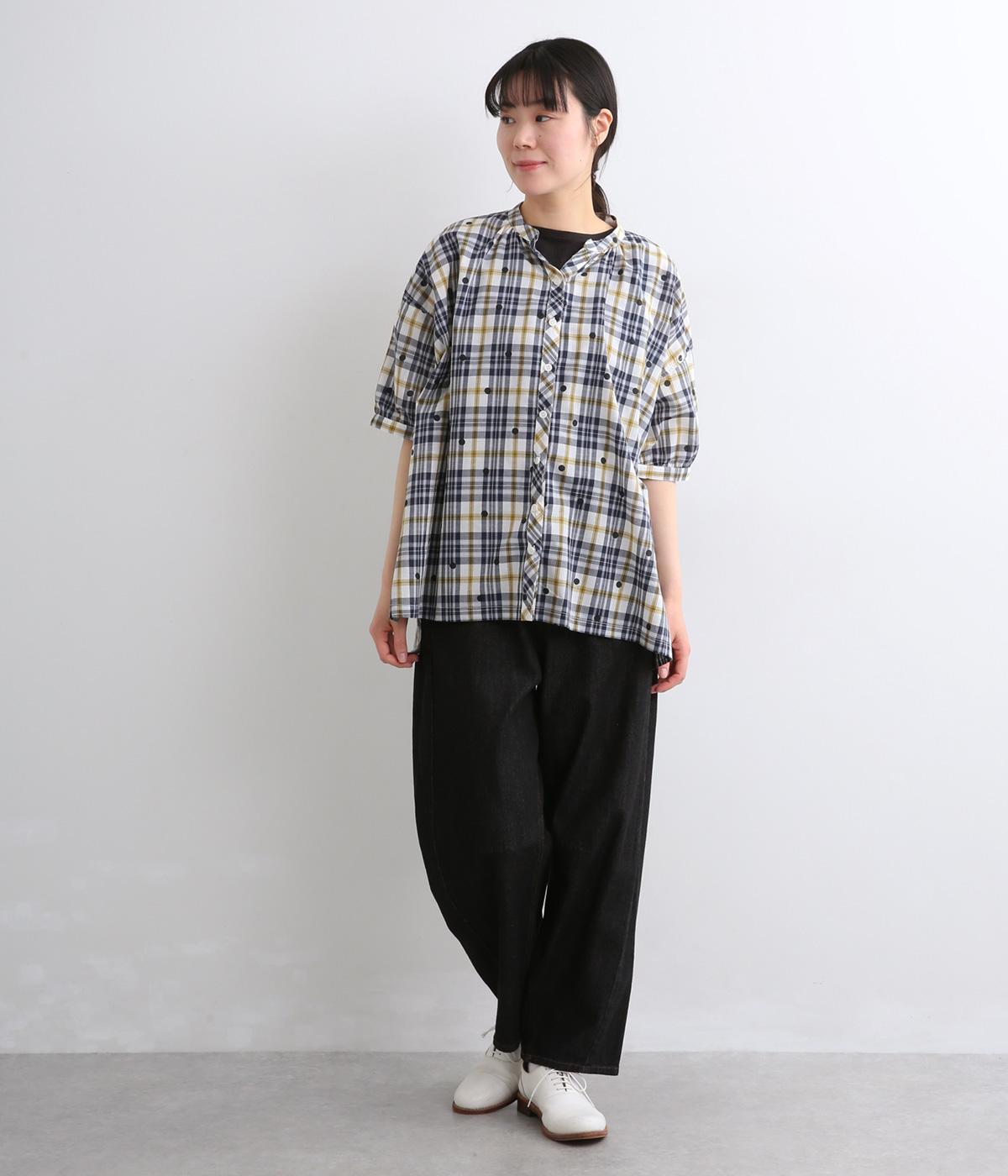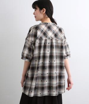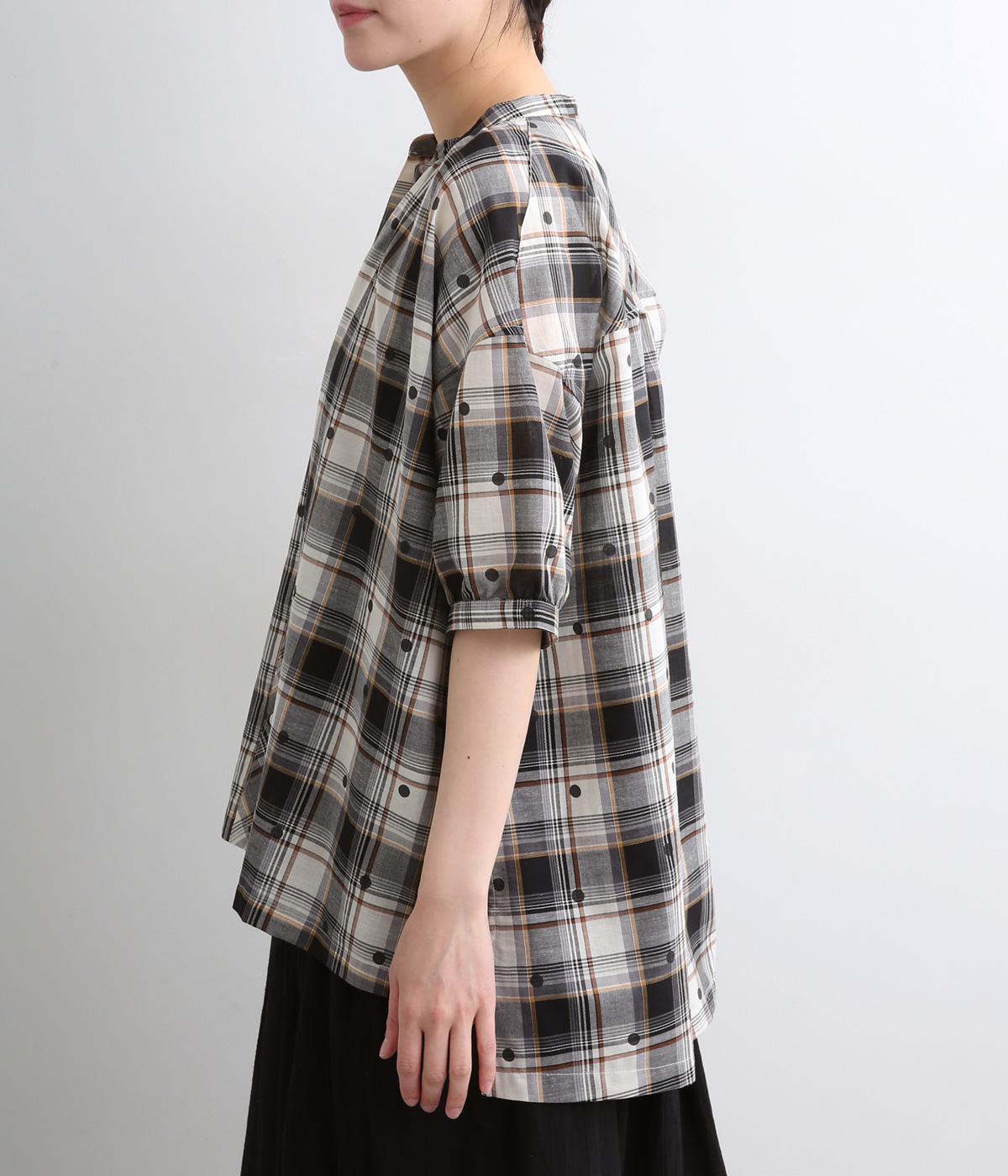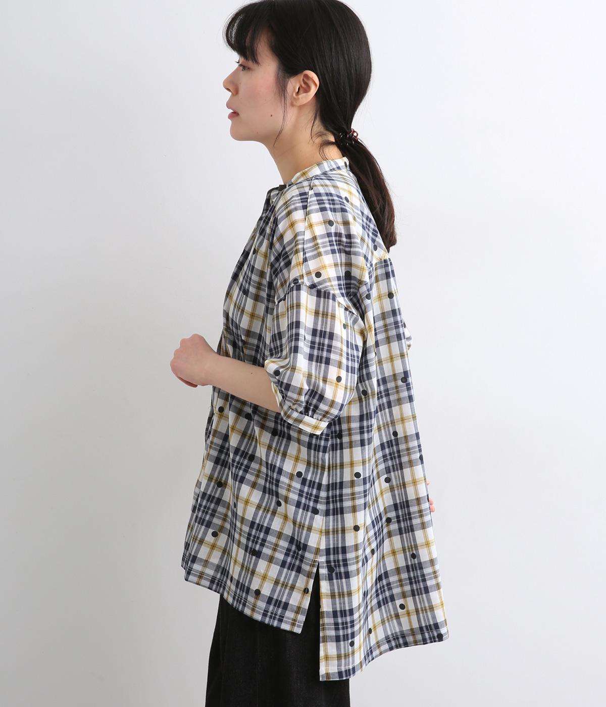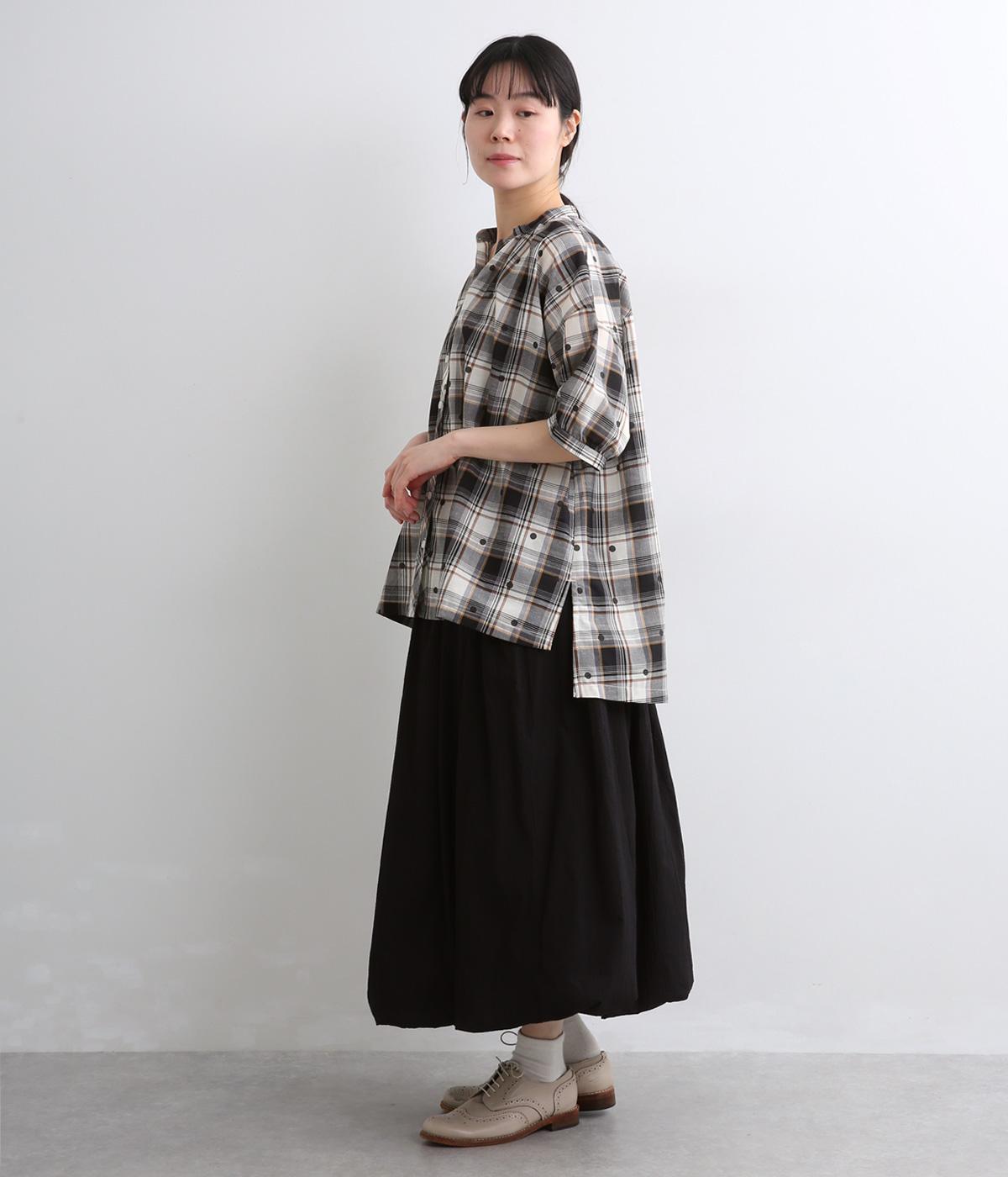 ジャカード織のチェック柄にドットプリントをあしらい、カジュアルな中にさりげなく華やかさが光ります。オーバーサイズのシルエットが軽やかな生地感を引き立てて、動きに合わせてふわりと揺れます。