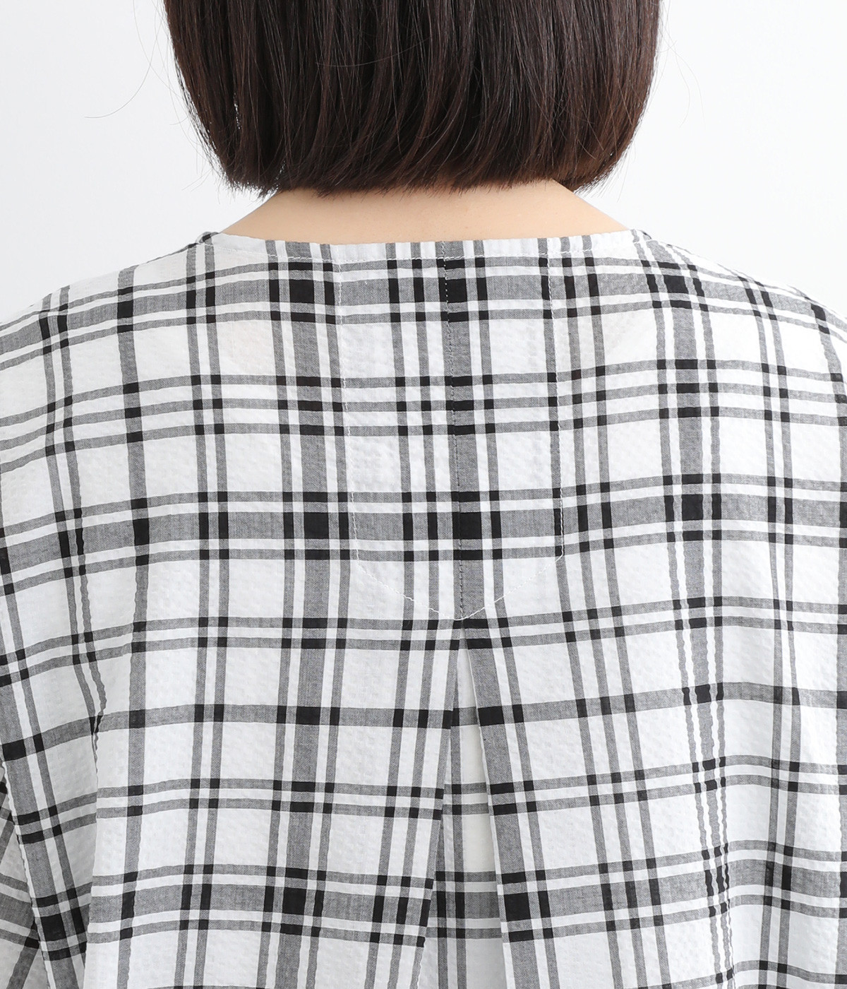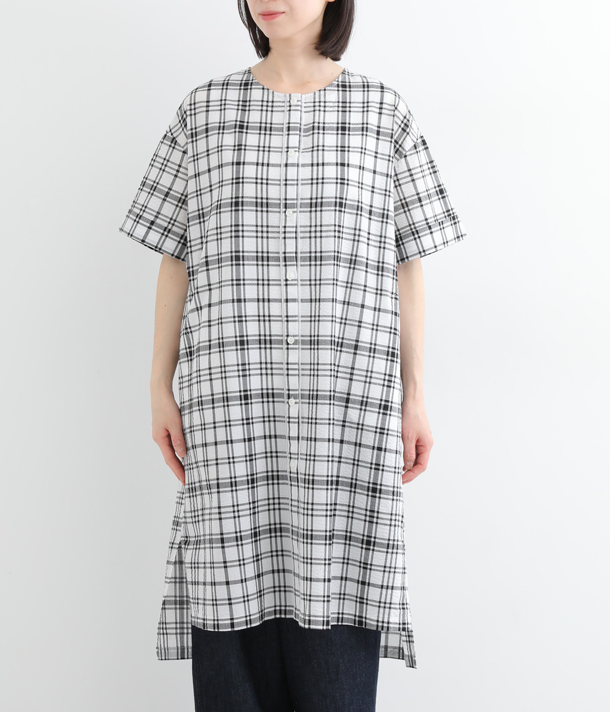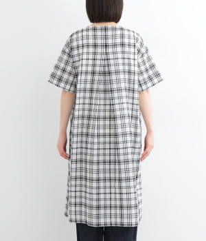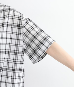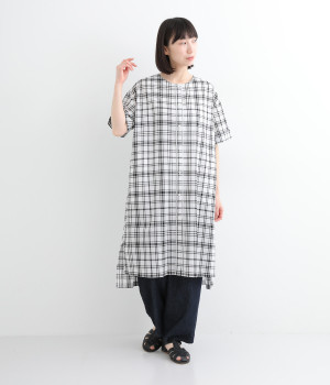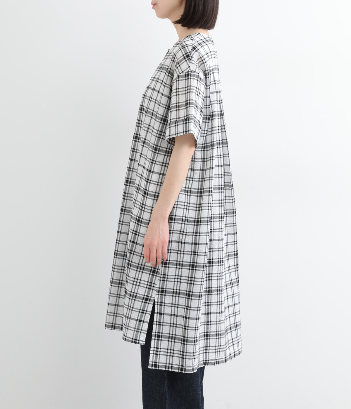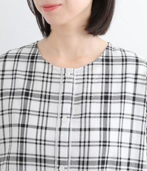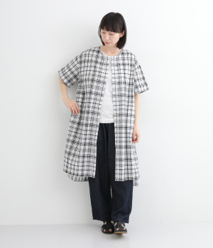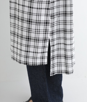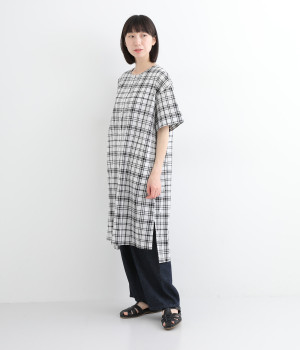 体のラインを拾いにくい、ゆとりのあるボックスシルエットのチュニック。前立て部分のはみ出しチュールの縦のラインがポイントになるデザインです。サイドスリットを入れた、大きく前後差をつけた裾が装いに動きを加えます。
