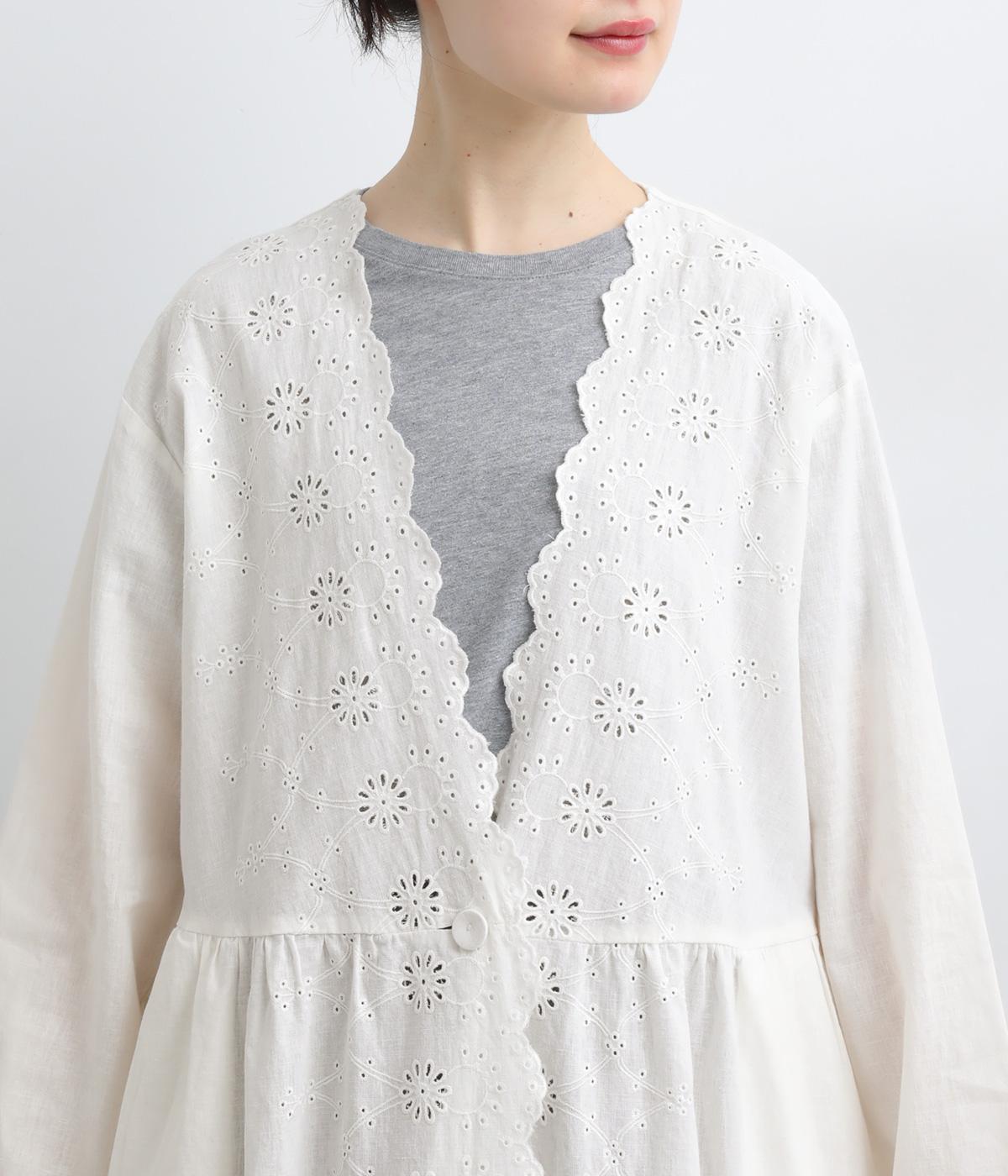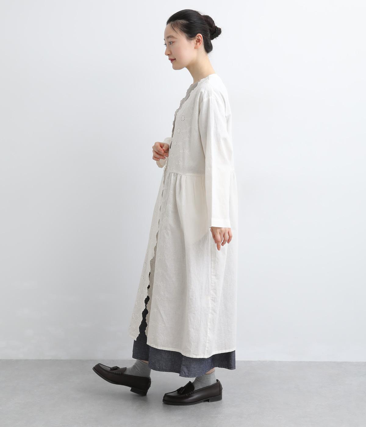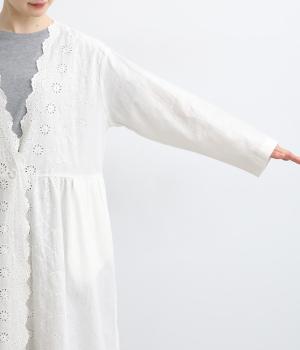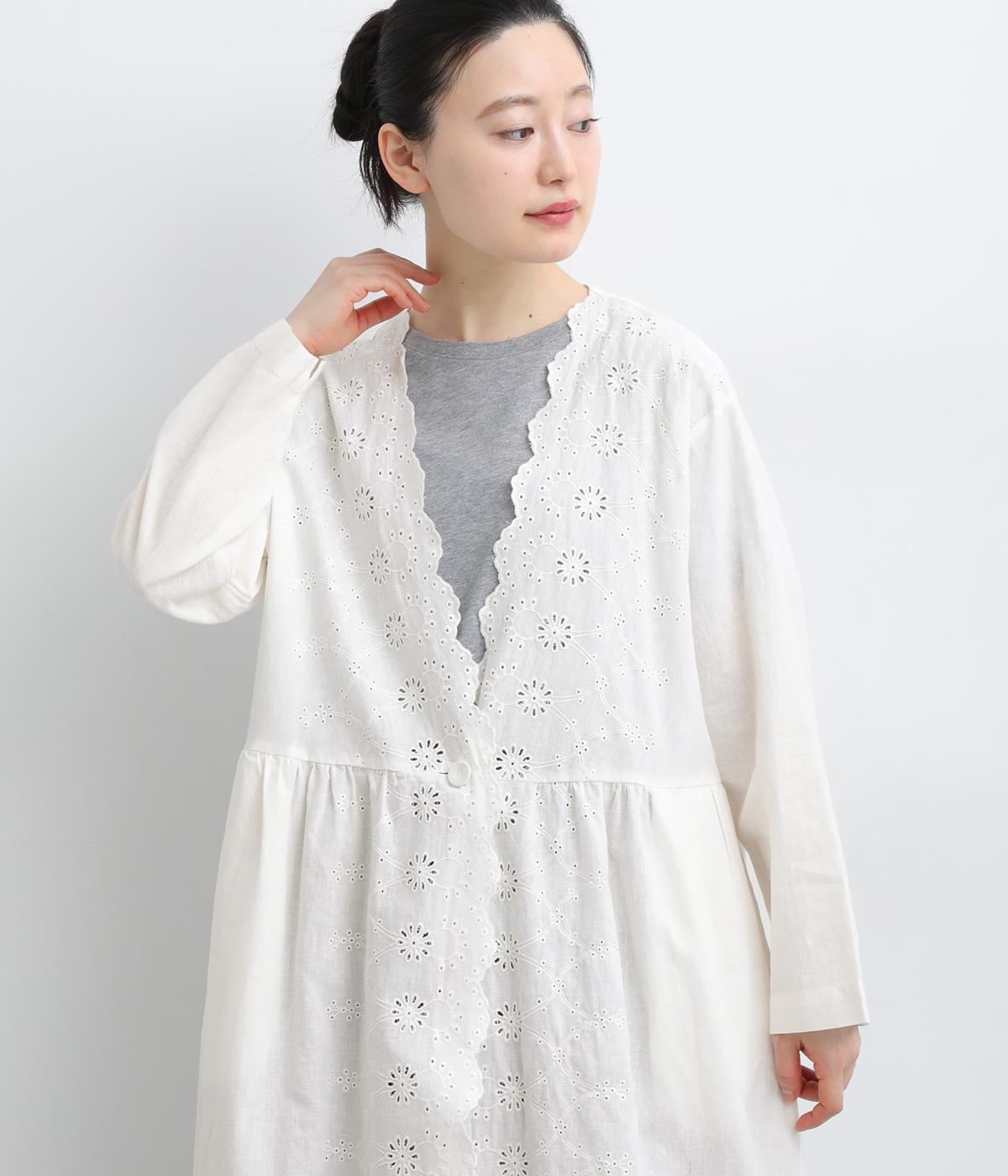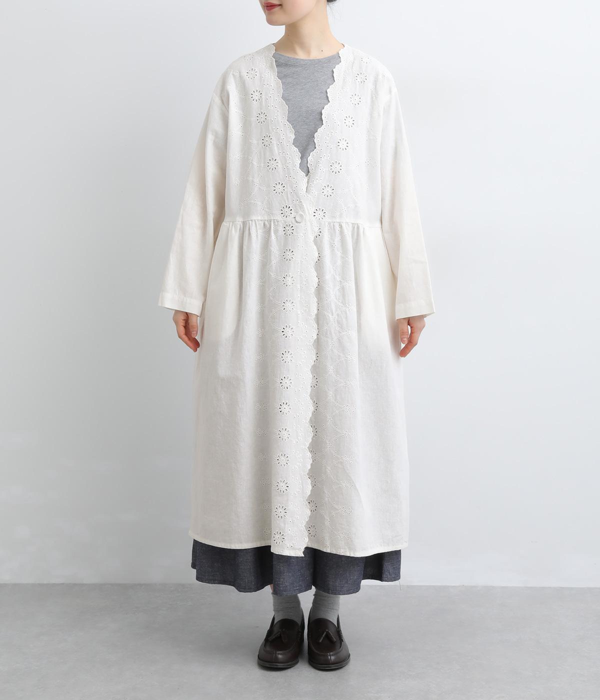 ひとつボタンで軽く留められるガウンタイプのワンピース。襟ぐりからつながったスカラップの前立てがナチュラルながらも着映え力を高めて特別な一着に。シンプルな合わせに羽織るだけでコーディネートがワンランクアップします。