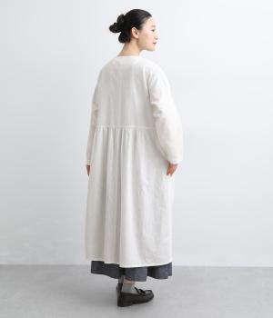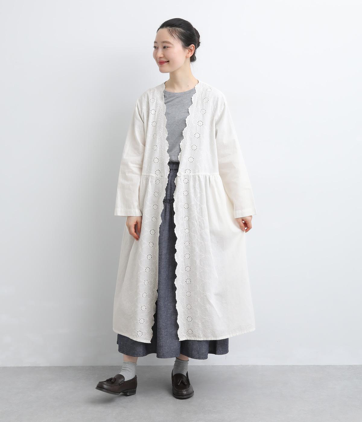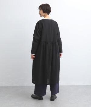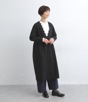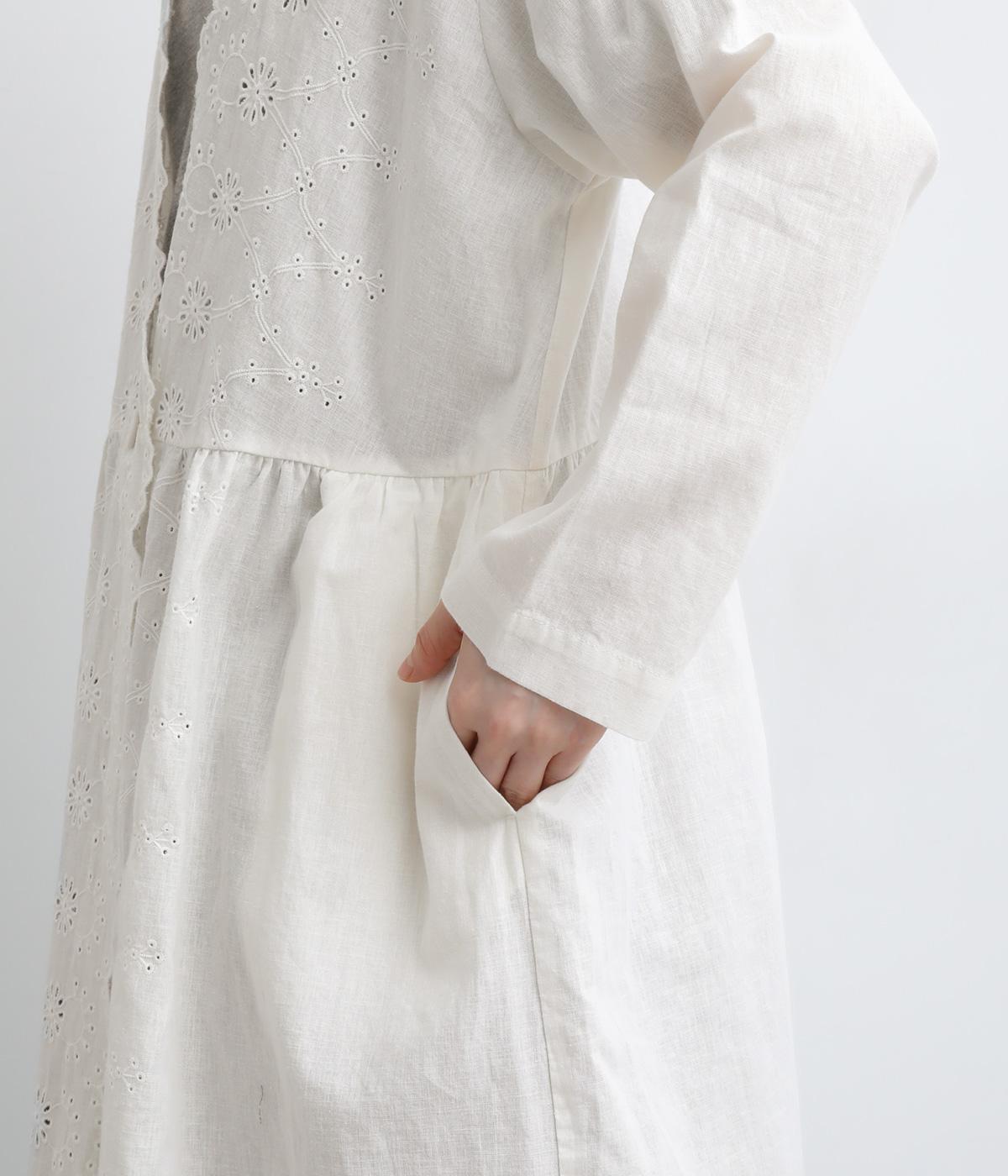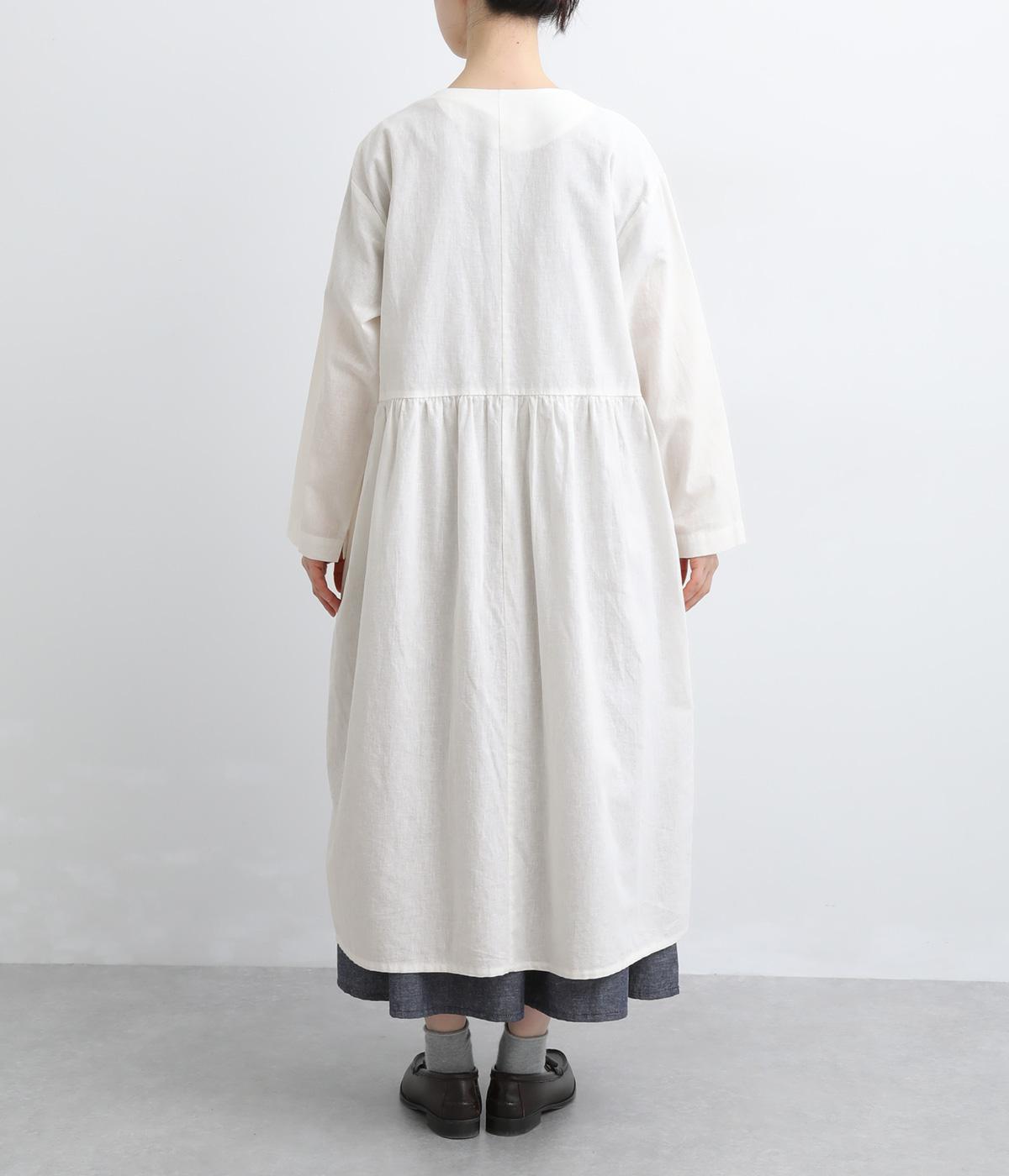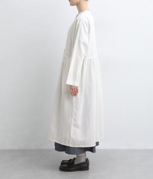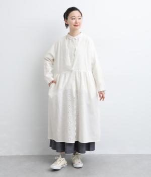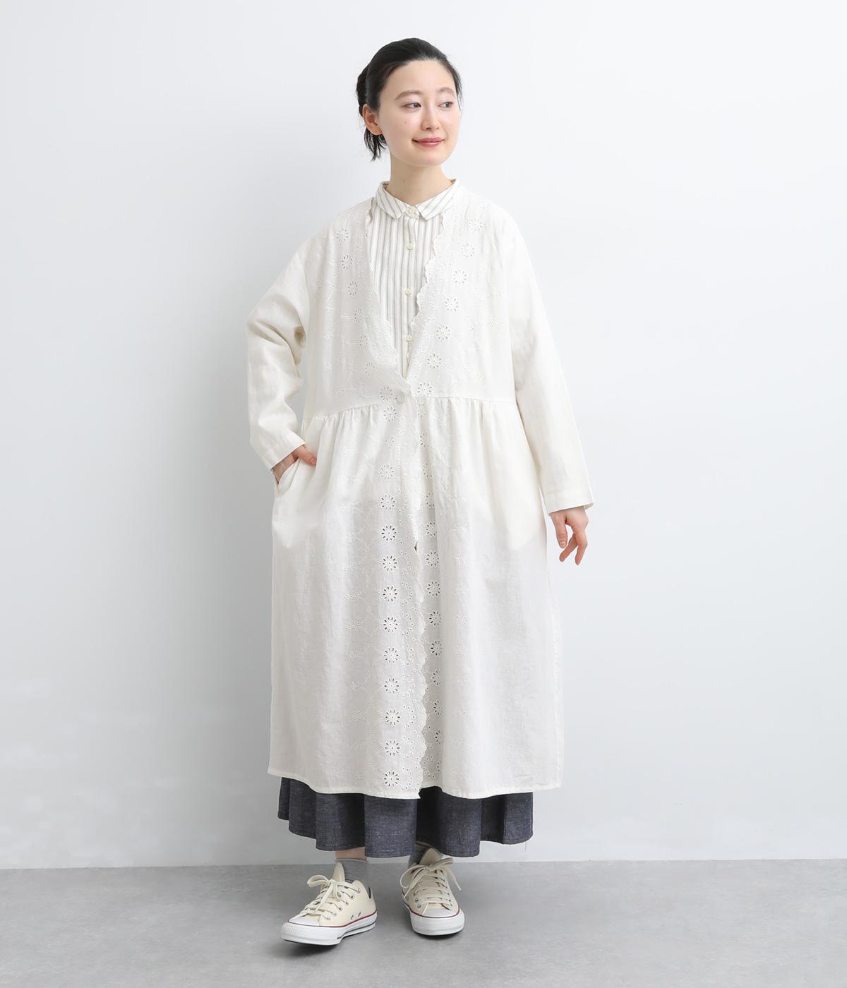 ひとつボタンで軽く留められるガウンタイプのワンピース。襟ぐりからつながったスカラップの前立てがナチュラルながらも着映え力を高めて特別な一着に。シンプルな合わせに羽織るだけでコーディネートがワンランクアップします。