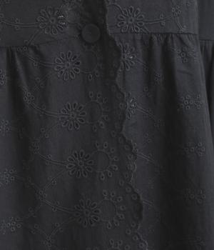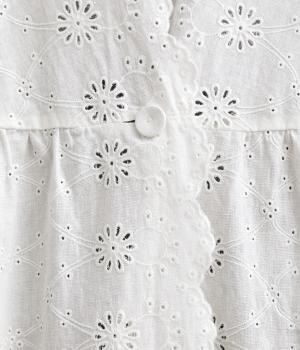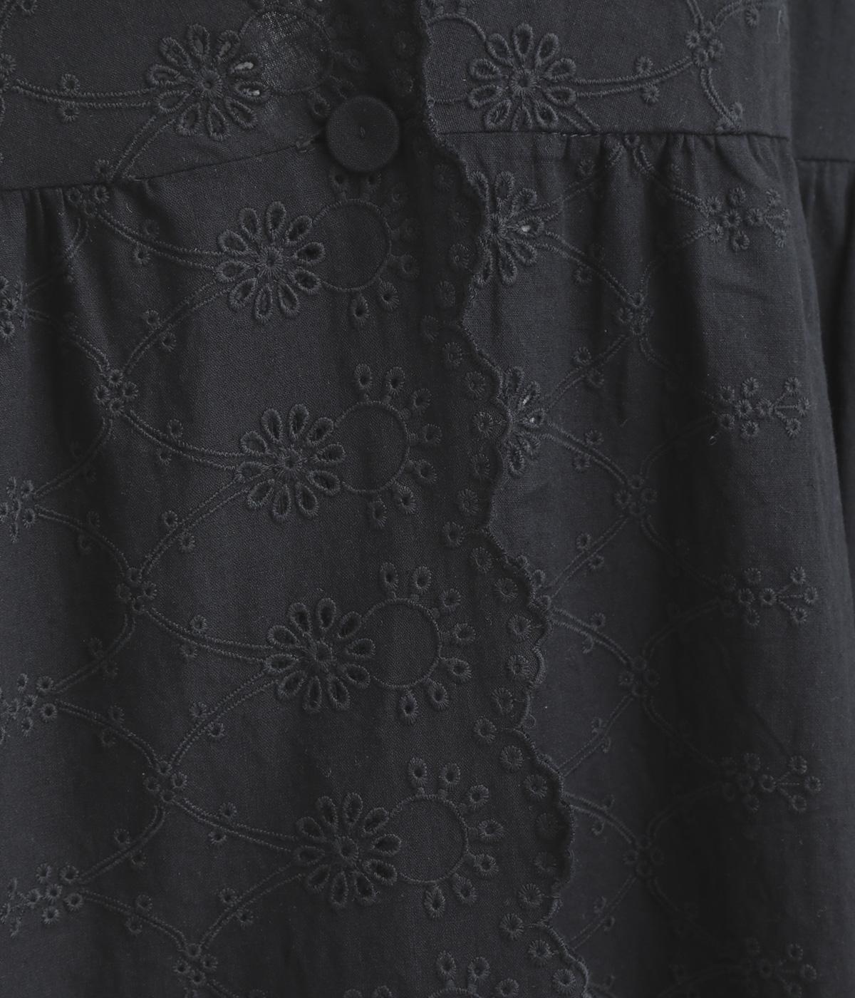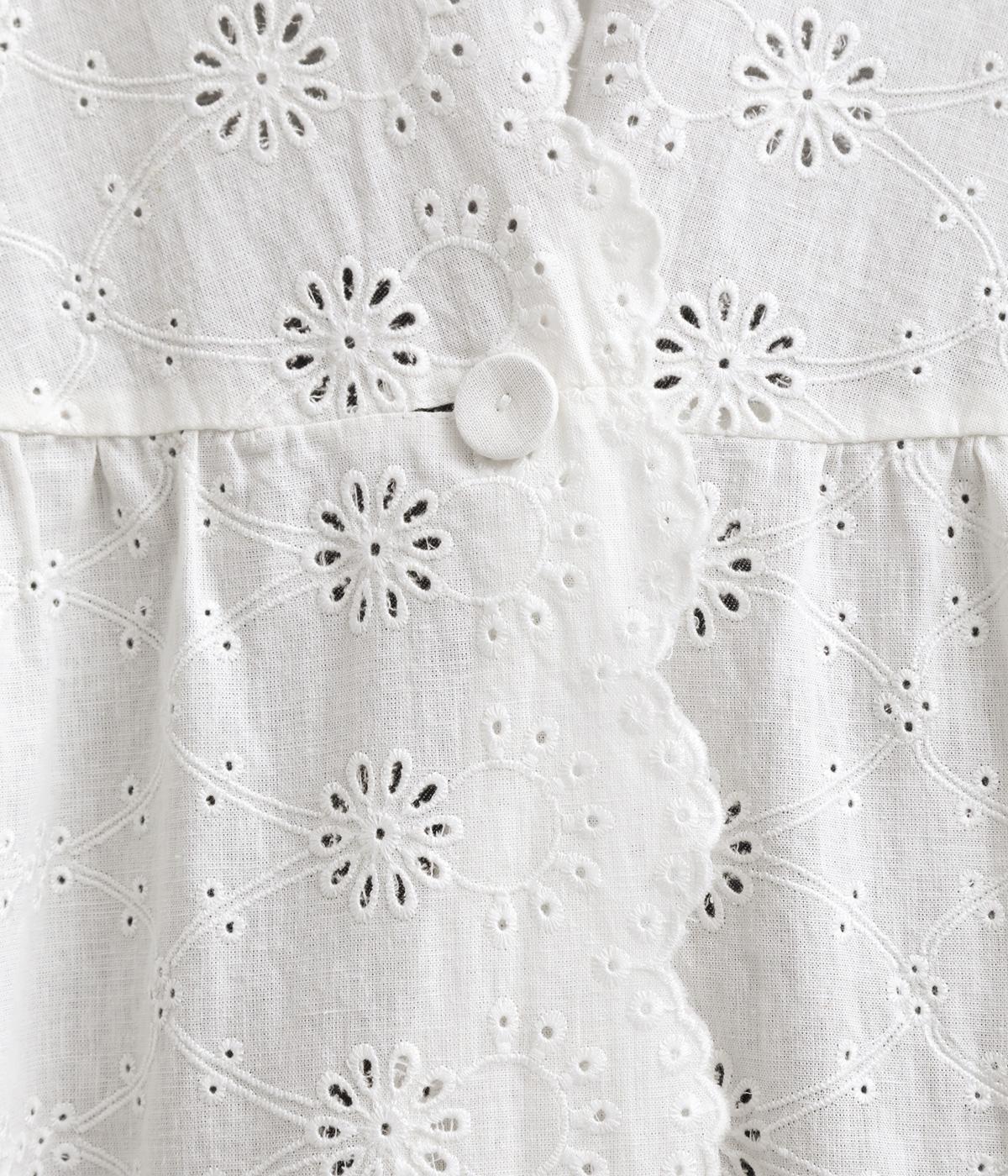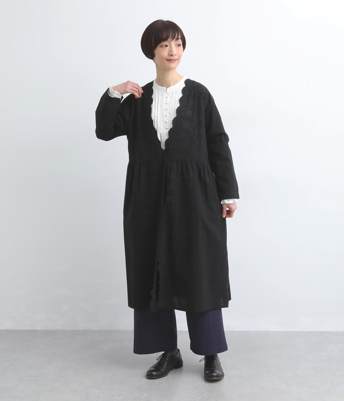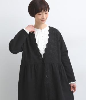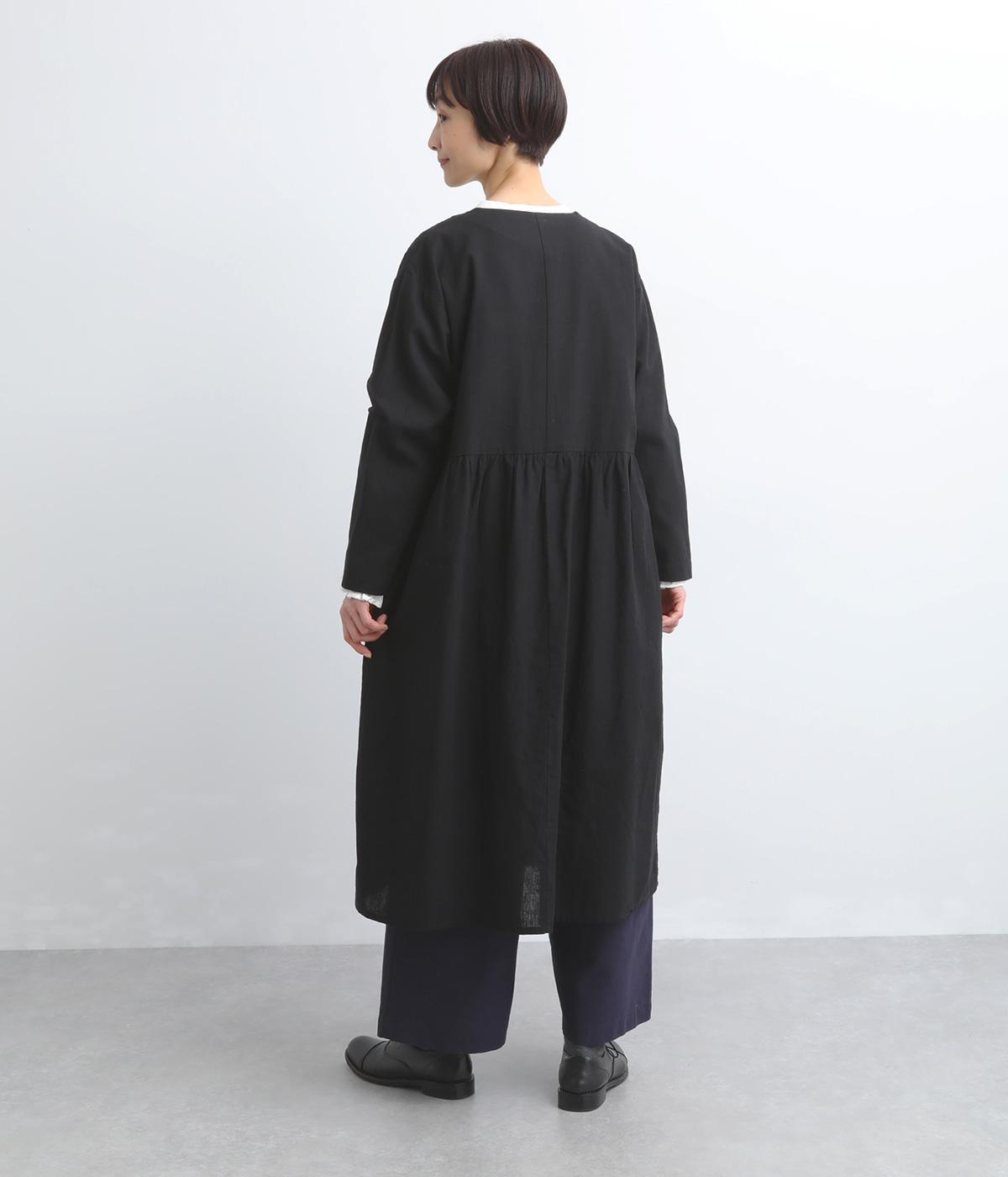 ひとつボタンで軽く留められるガウンタイプのワンピース。襟ぐりからつながったスカラップの前立てがナチュラルながらも着映え力を高めて特別な一着に。シンプルな合わせに羽織るだけでコーディネートがワンランクアップします。