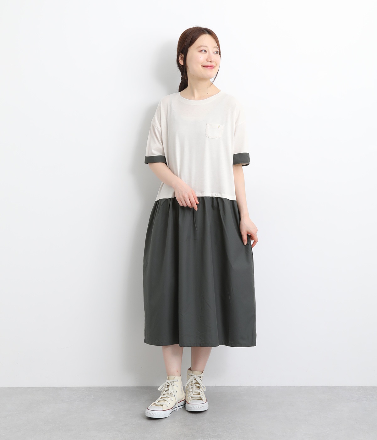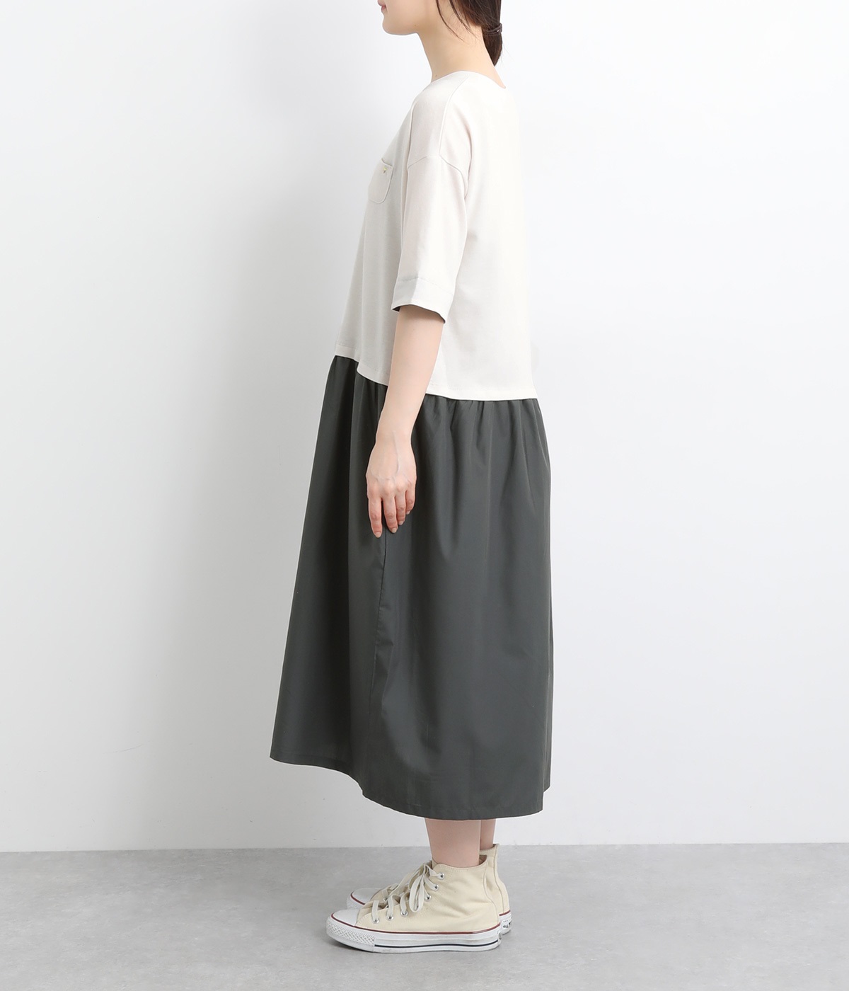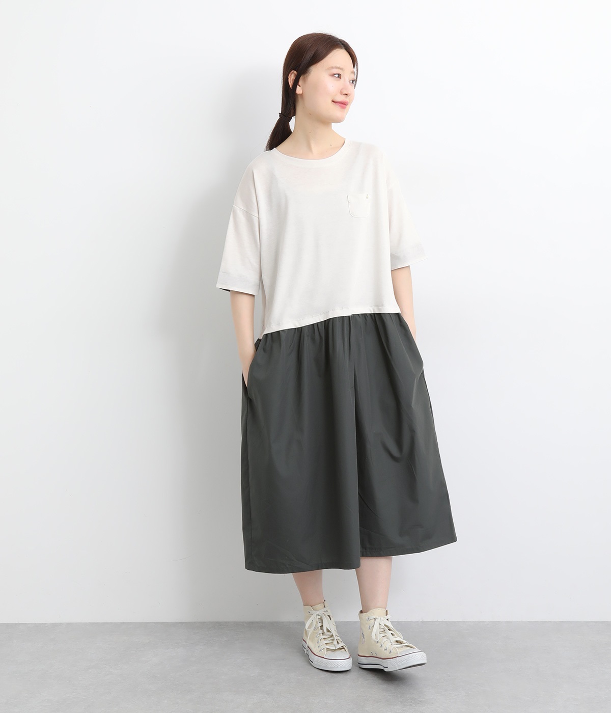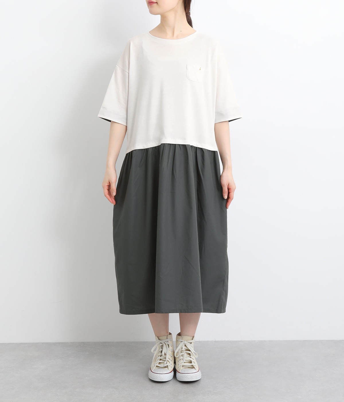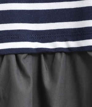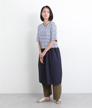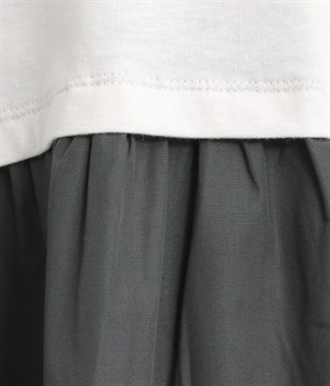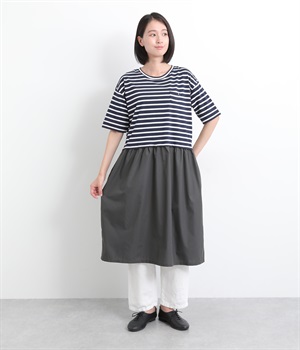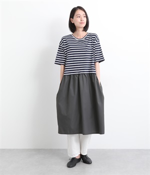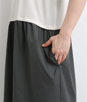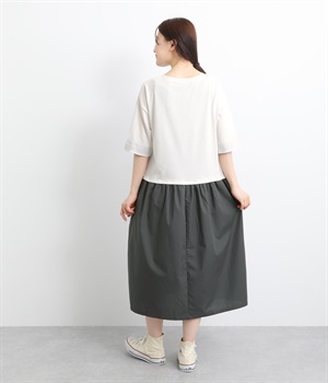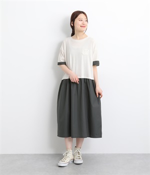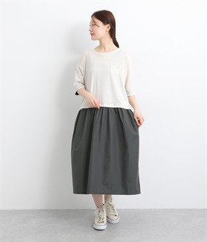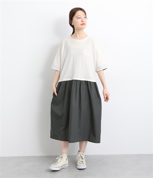 トップス部分はやわらかな綿混カットソーを、スカート部分は軽やかでシャリ感のある布帛生地を組み合わせました。動きの多い上部分は伸びのいい生地を配して着心地も◎。