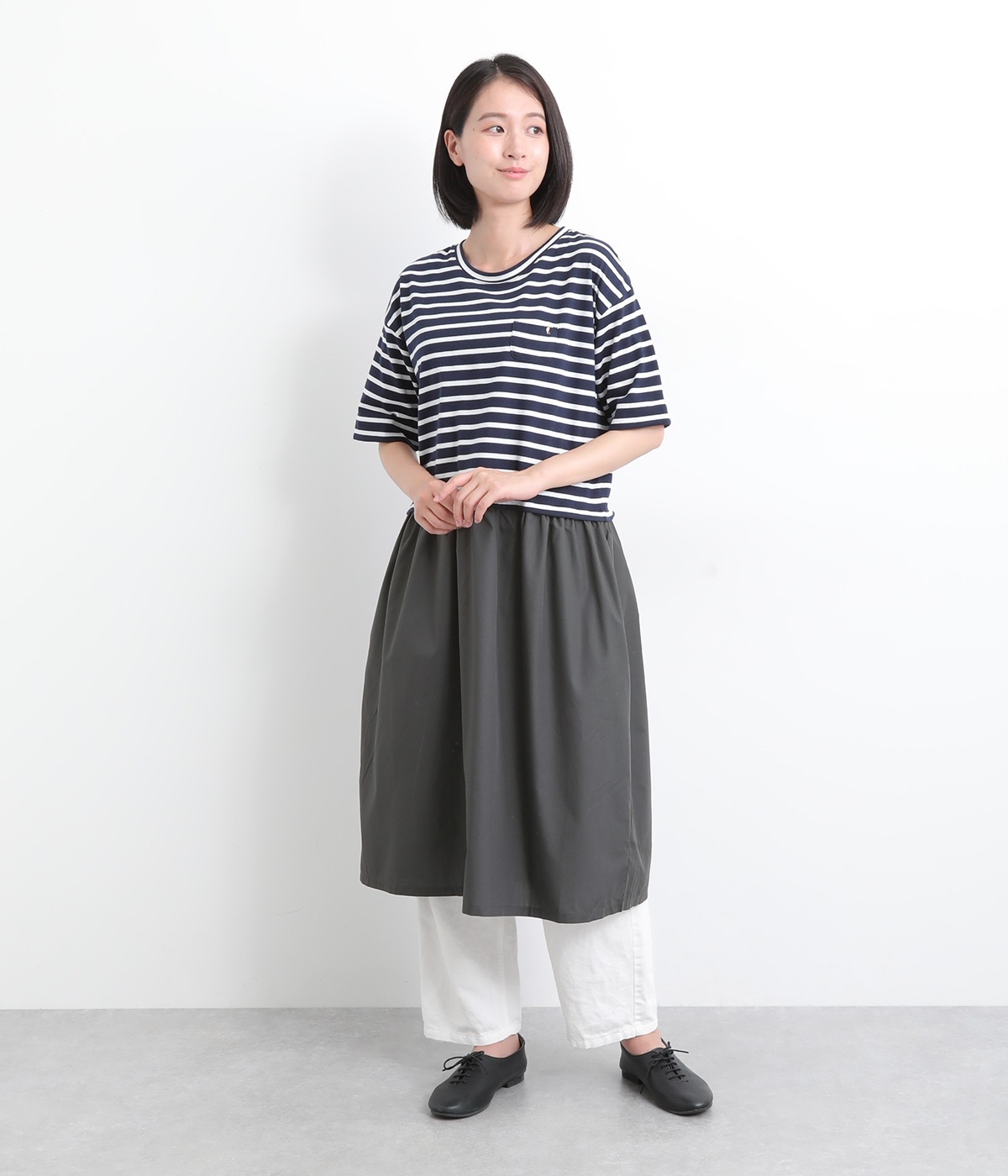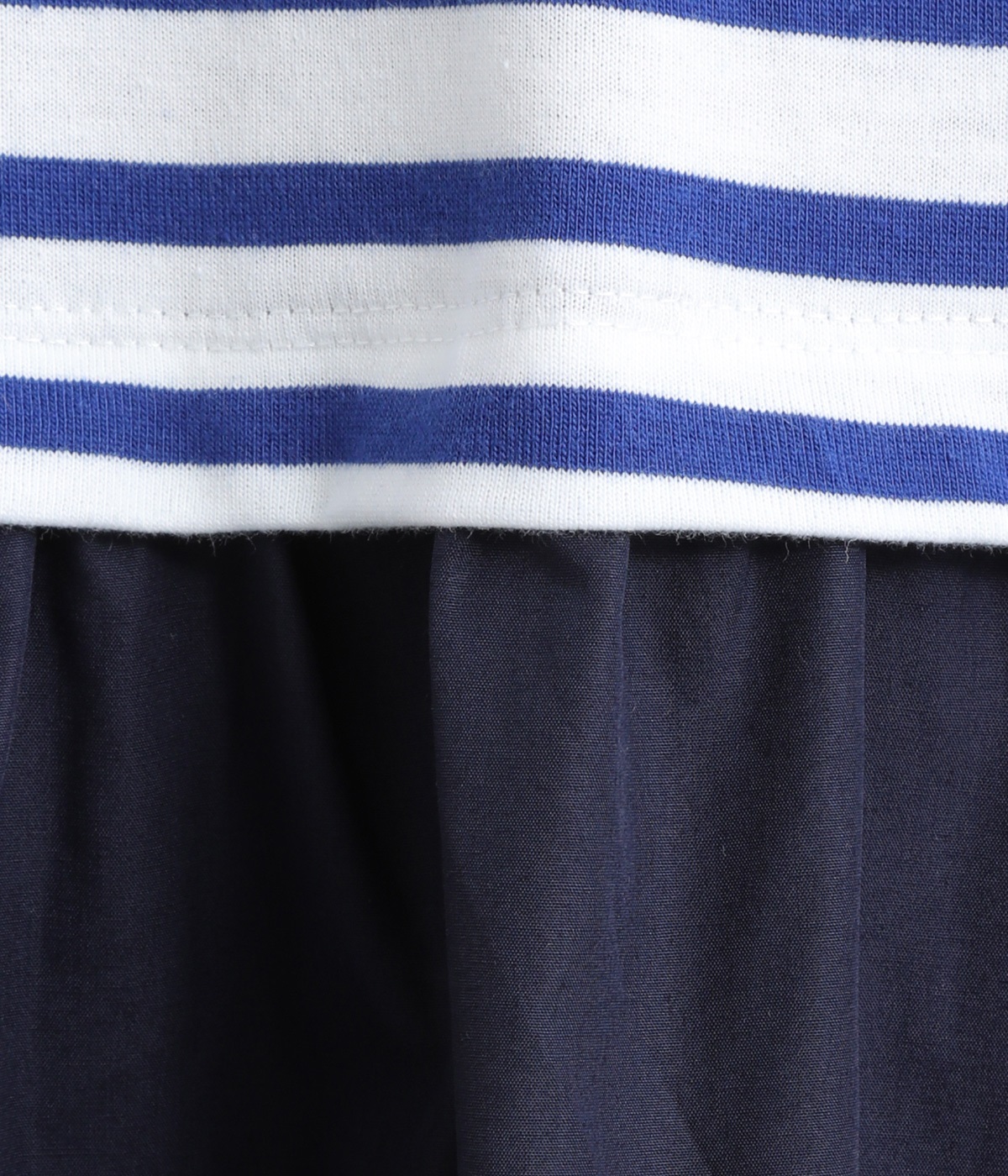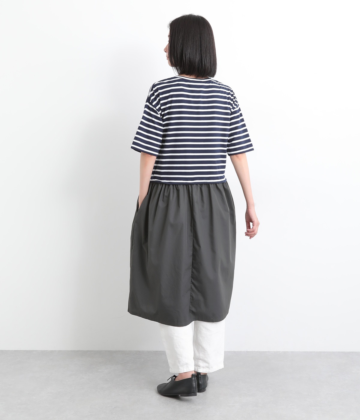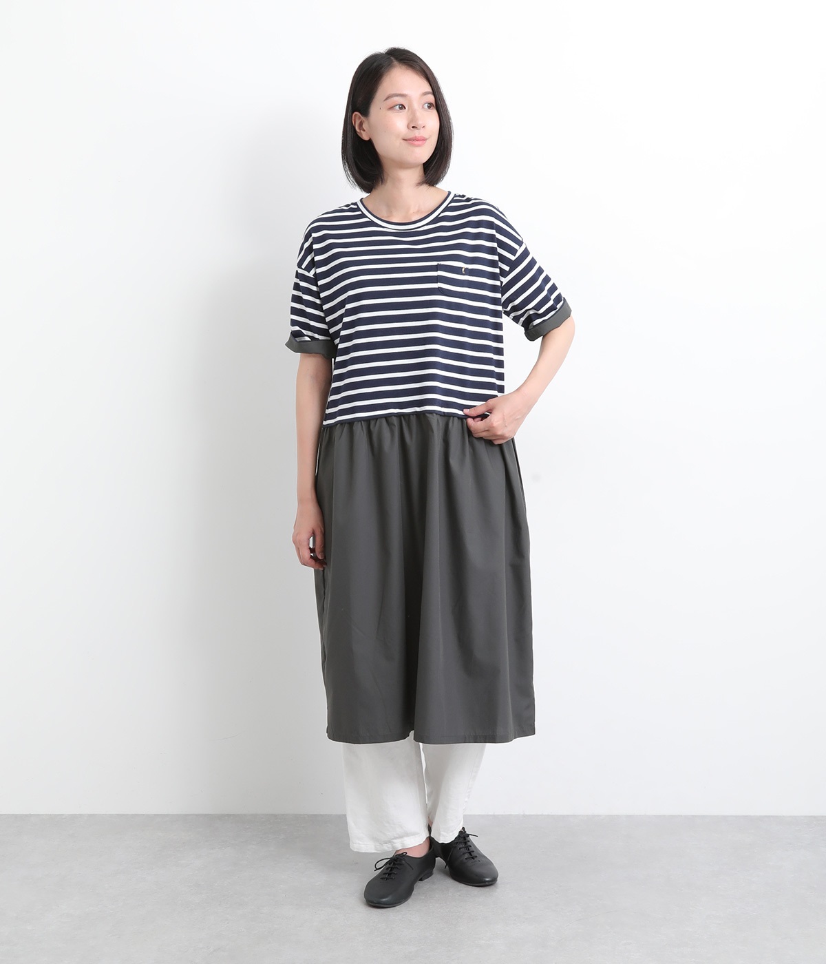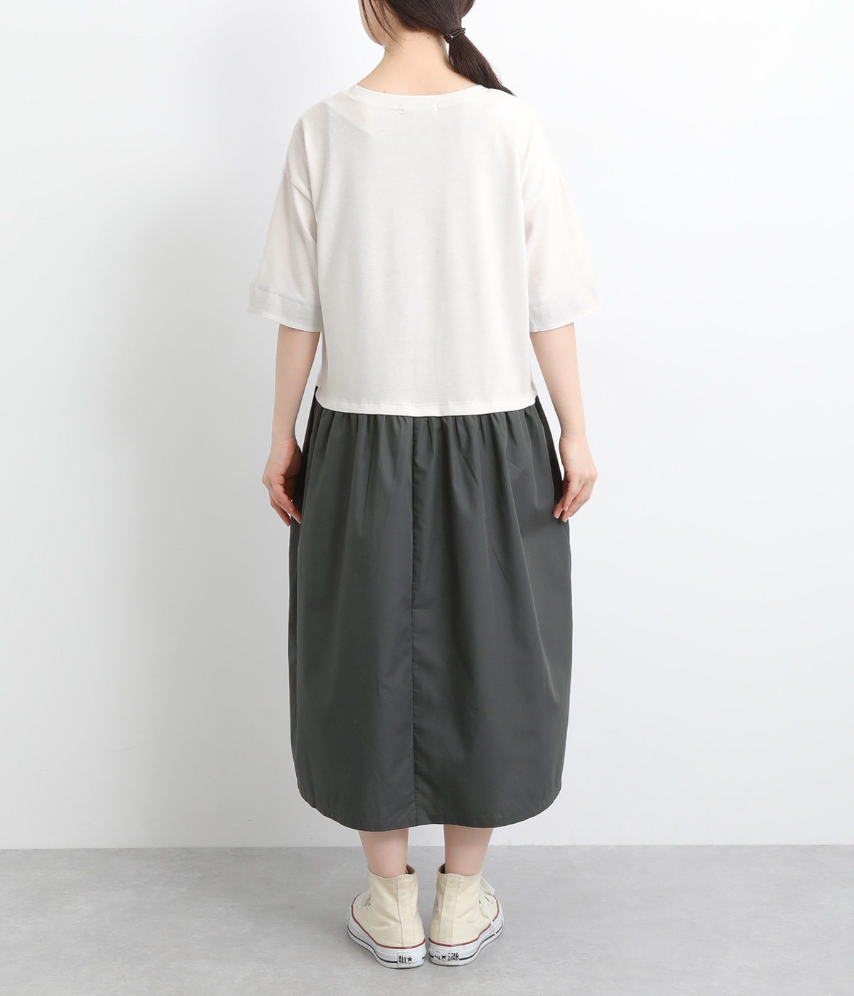 トップス部分はやわらかな綿混カットソーを、スカート部分は軽やかでシャリ感のある布帛生地を組み合わせました。動きの多い上部分は伸びのいい生地を配して着心地も◎。
