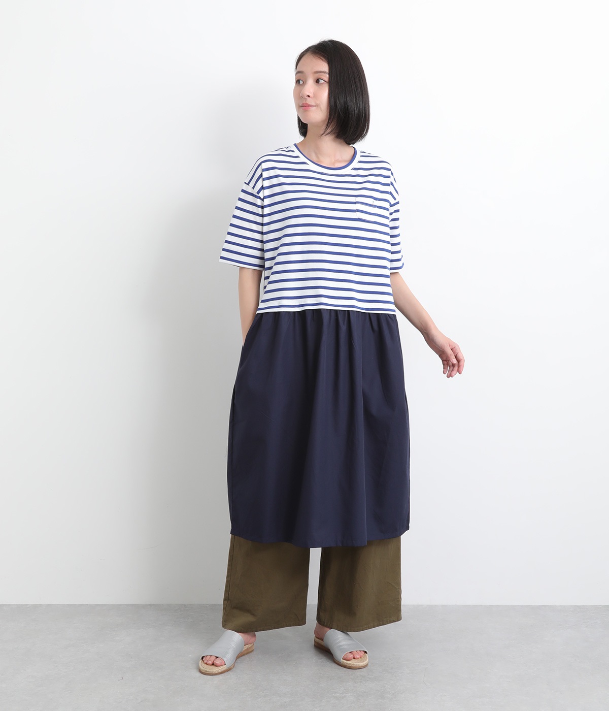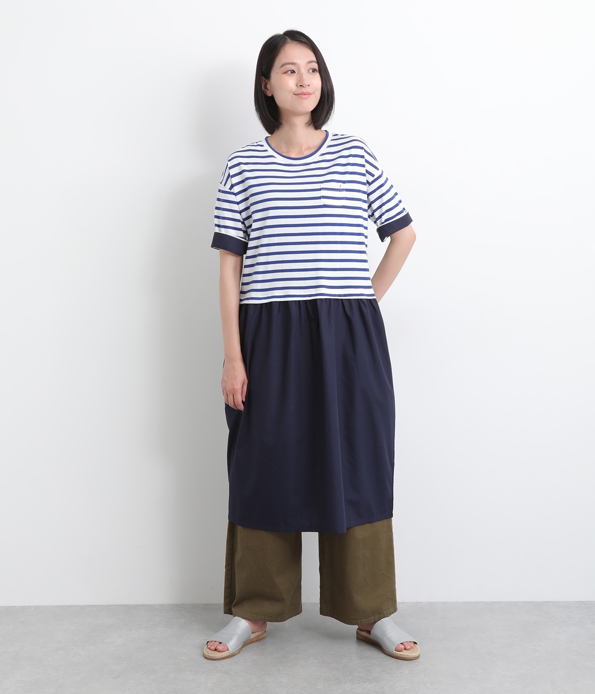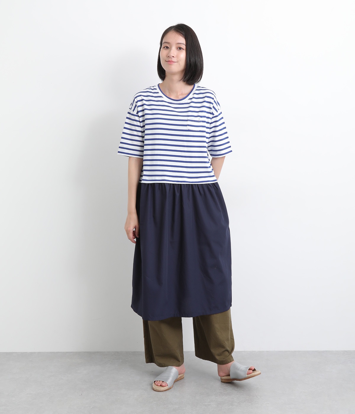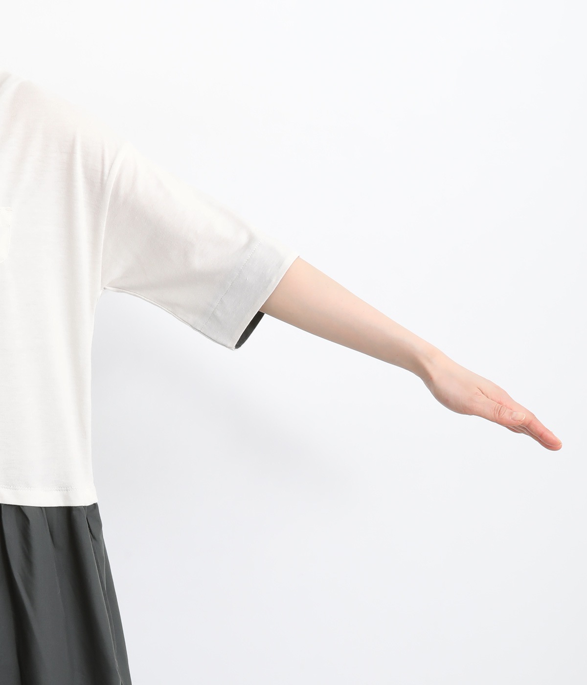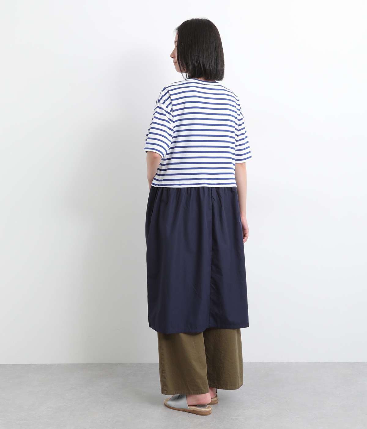 トップス部分はやわらかな綿混カットソーを、スカート部分は軽やかでシャリ感のある布帛生地を組み合わせました。動きの多い上部分は伸びのいい生地を配して着心地も◎。
