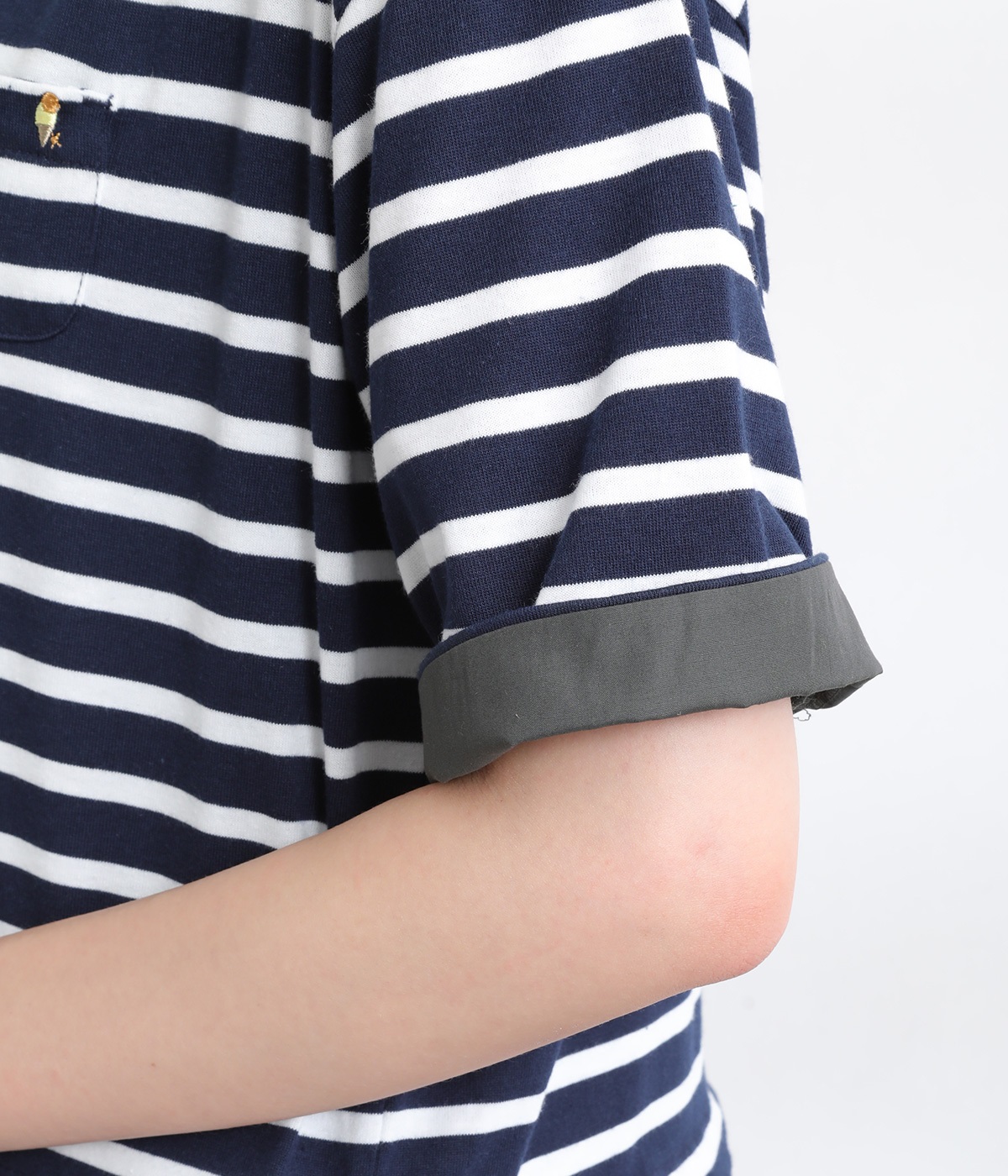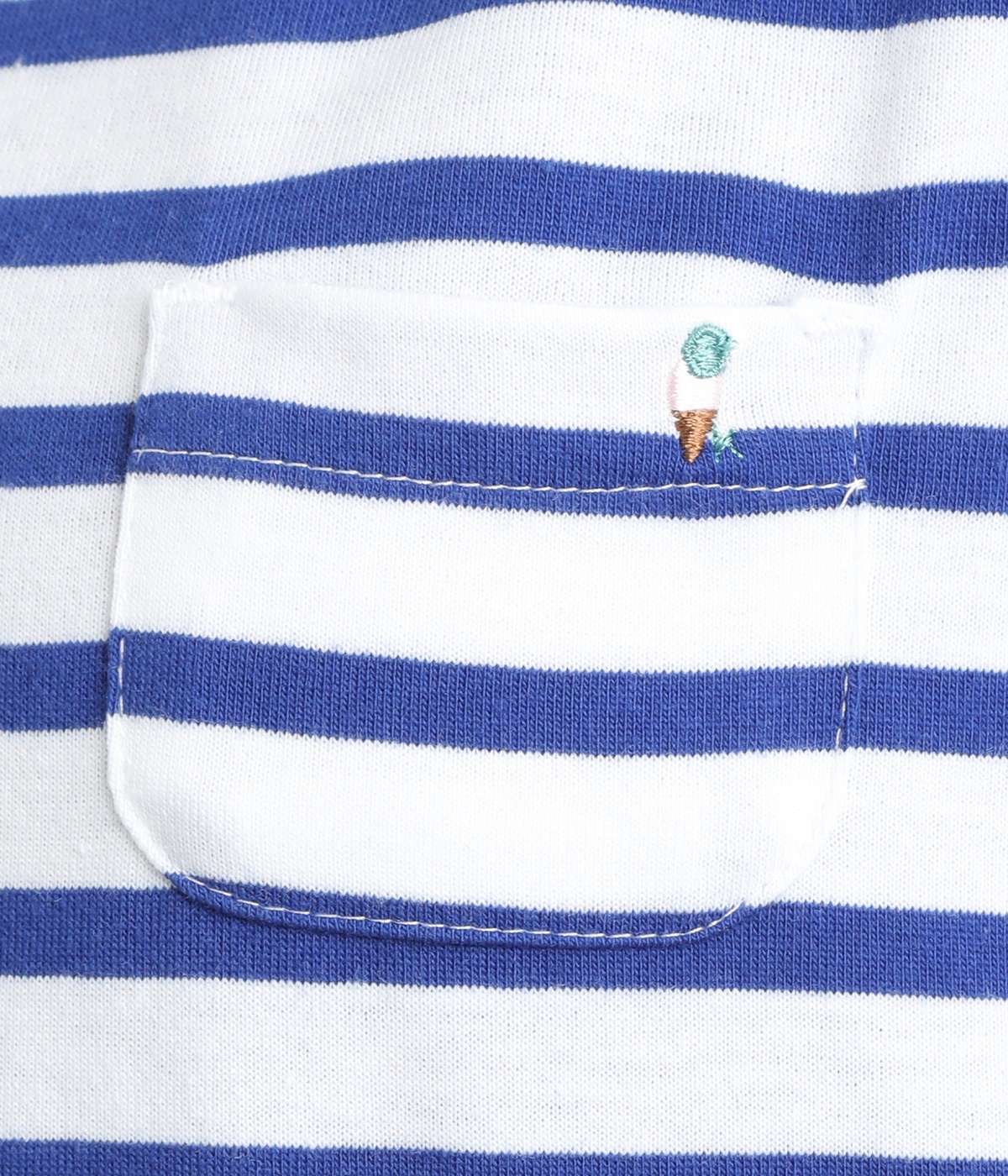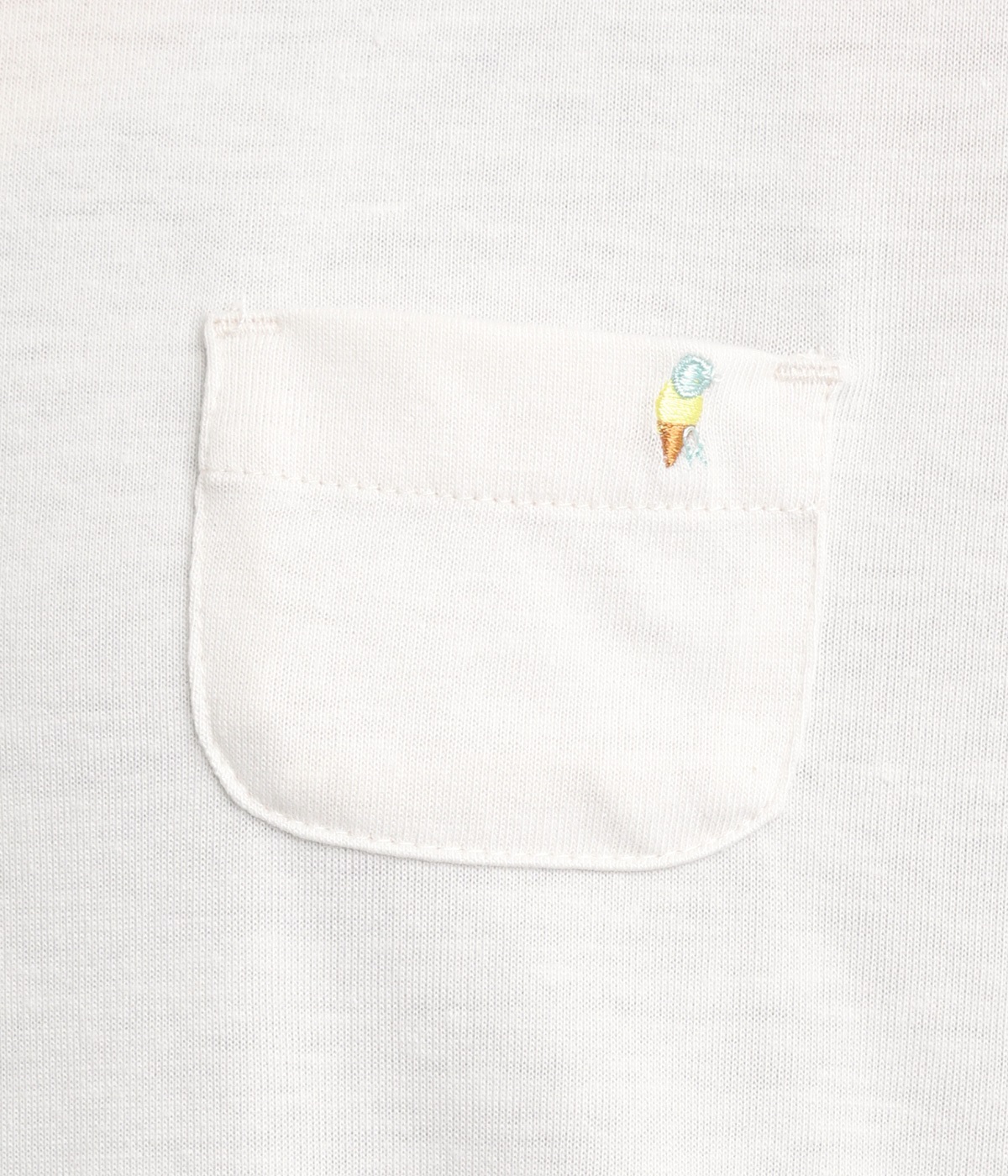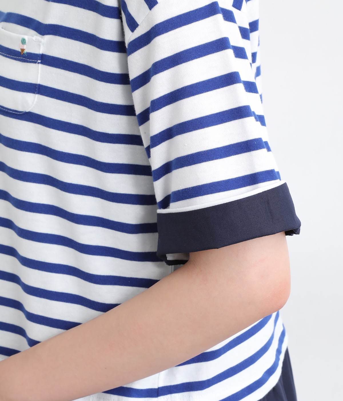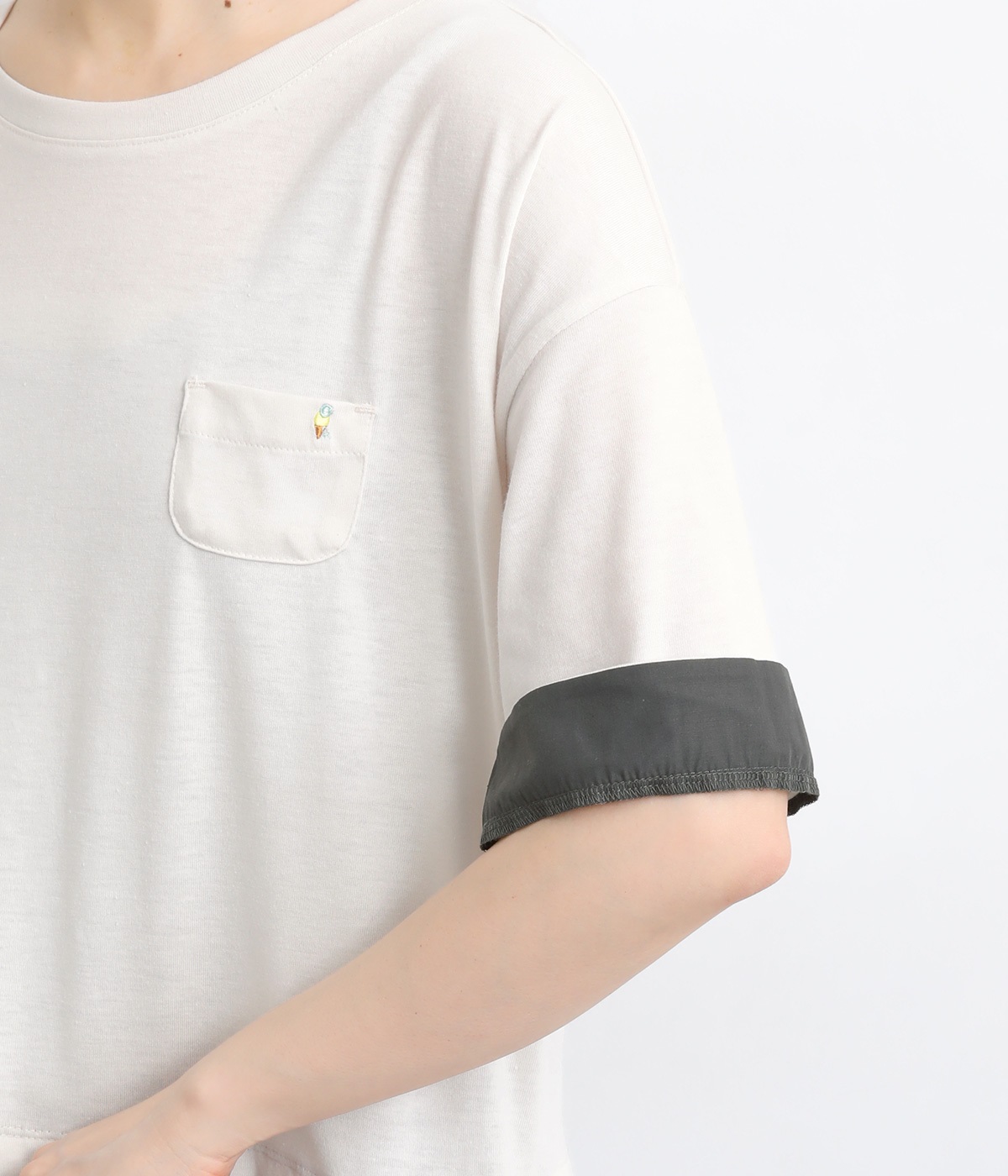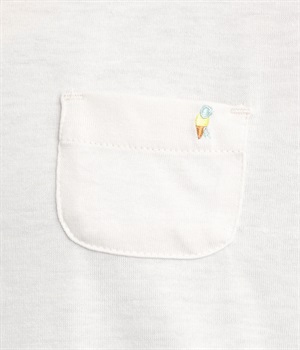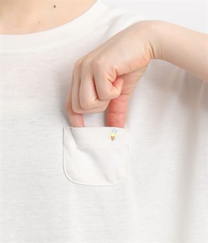 一枚でコーディネートが決まるドッキングデザインのワンピースです。胸ポケットにほどこしたアイスクリームの刺しゅうがかわいらしいワンポイントに。折り返した袖口にはスカートと同じ生地をあてて配色をきかせています。