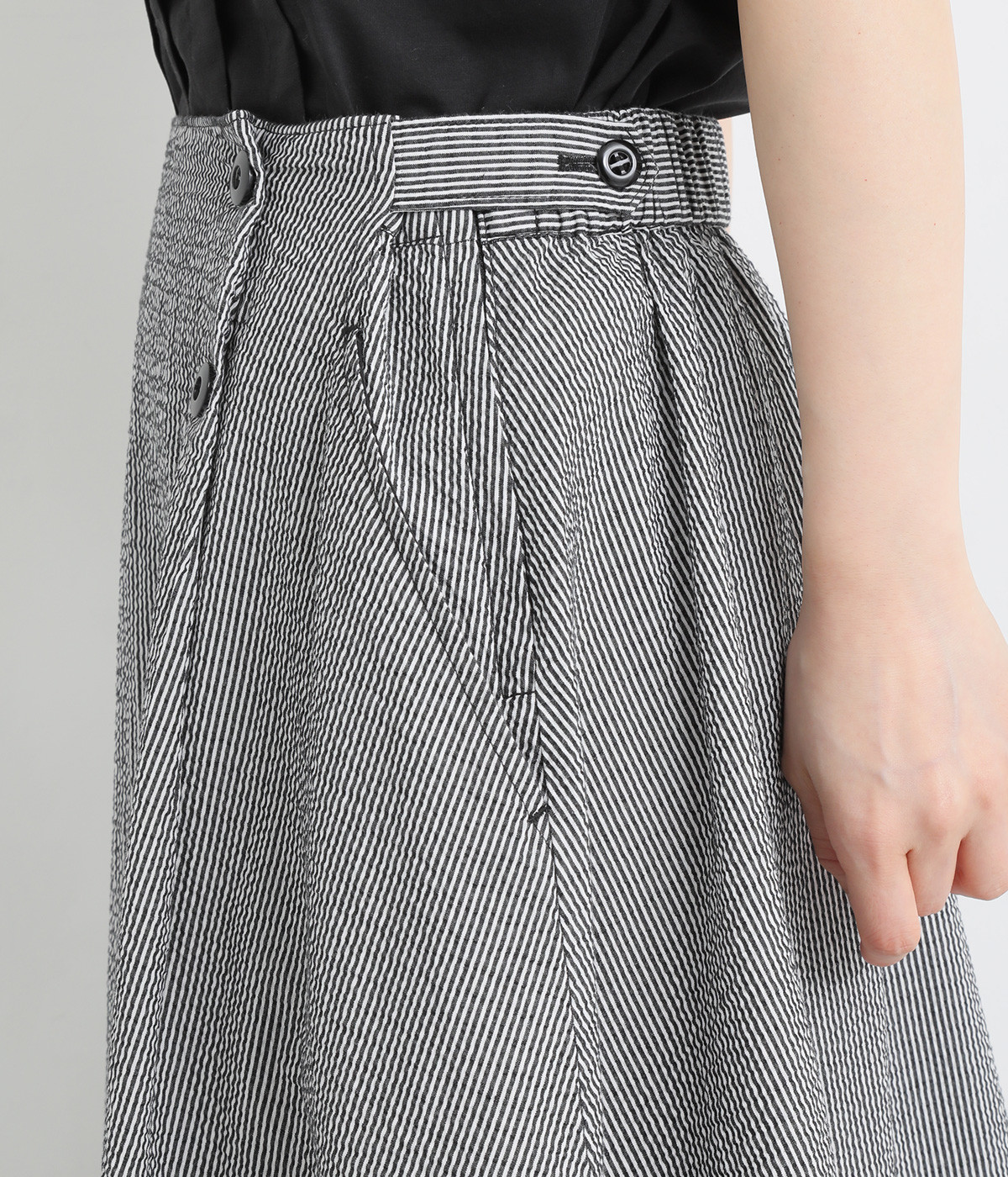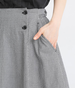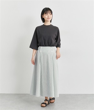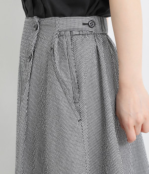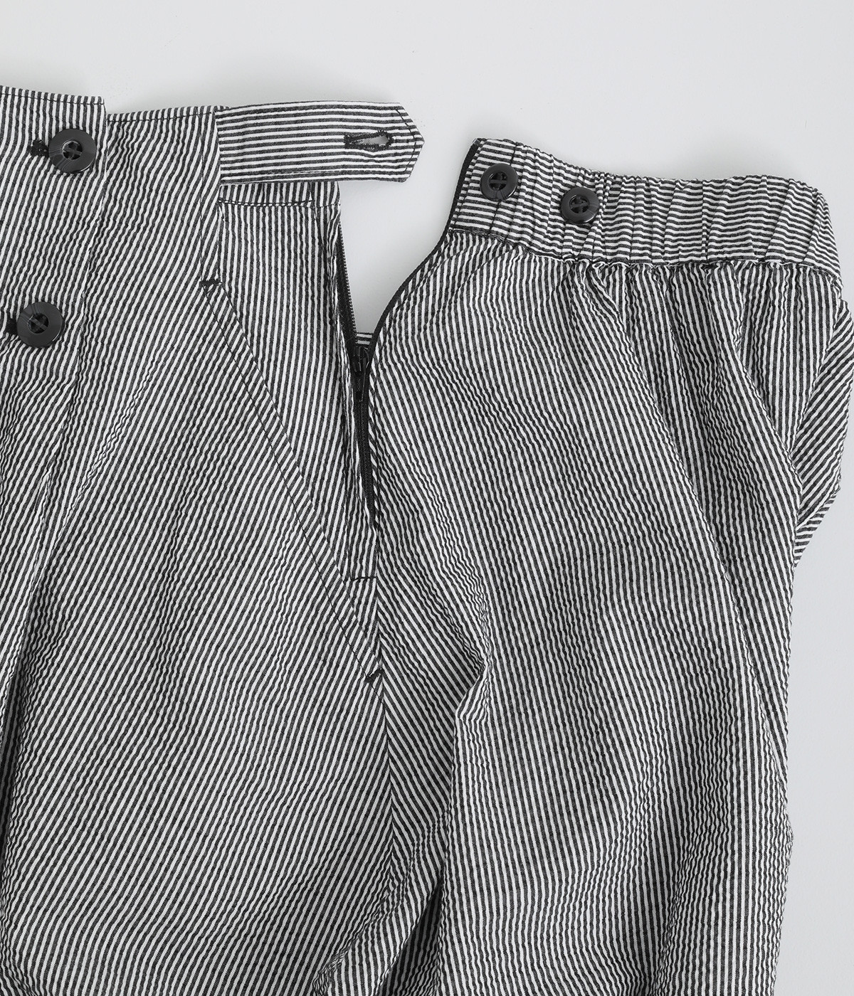マリンパンツを思わせるフロントボタンがポイント。ウエストの両サイドにはハーフベルトをあしらってアクセントをプラスしました。それぞれ2段階のウエスト調整が可能になっています。バックウエストはギャザーゴム仕立てでフィット感よく。