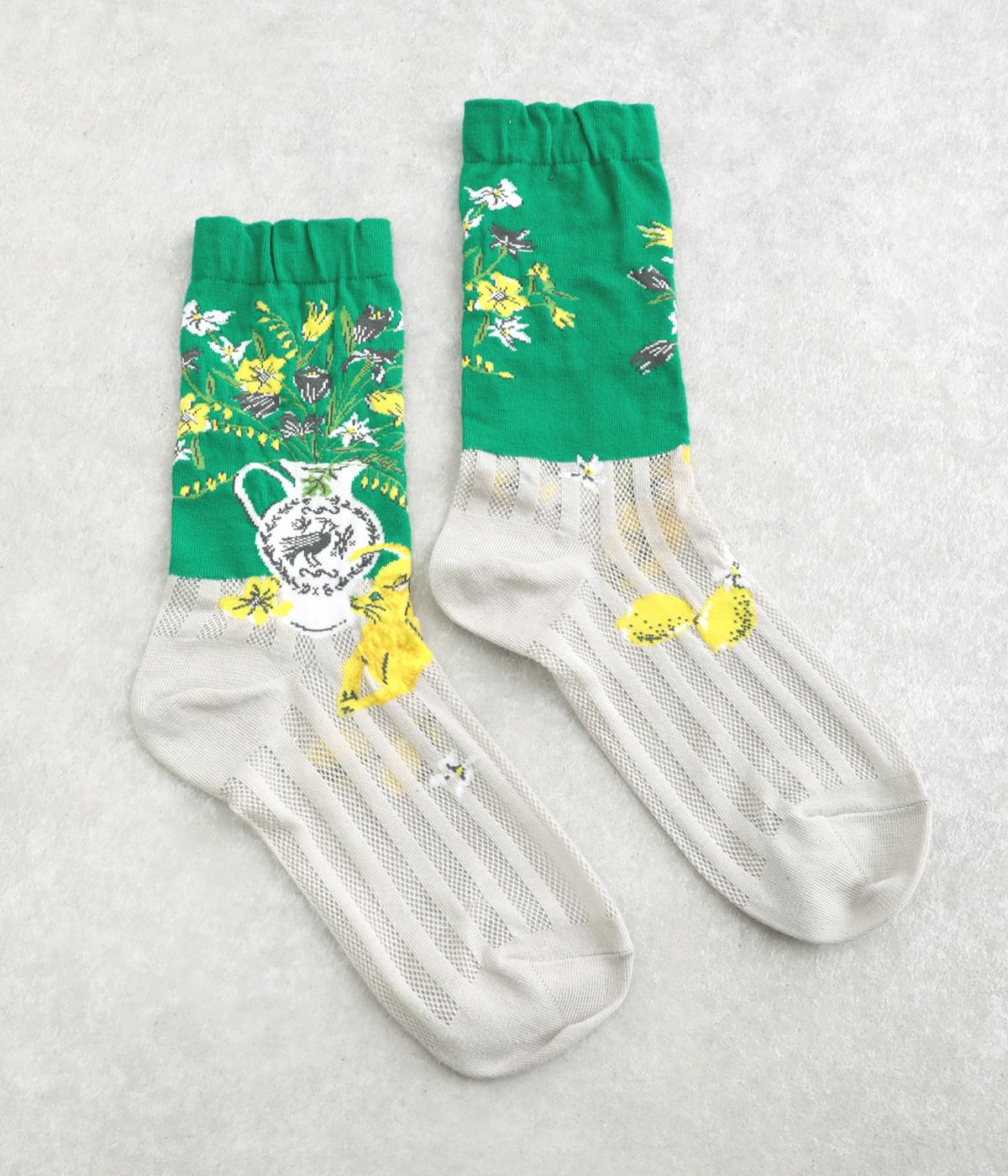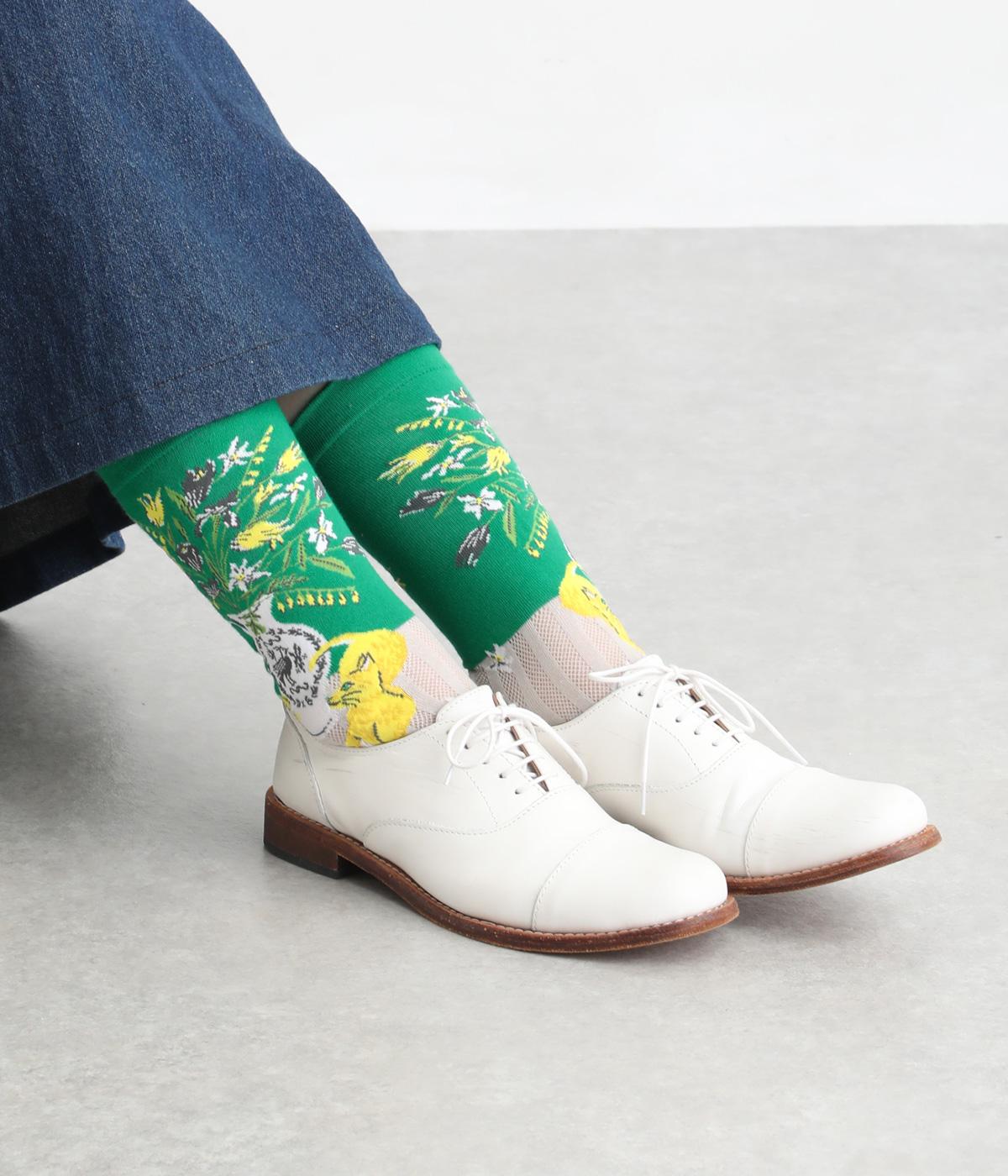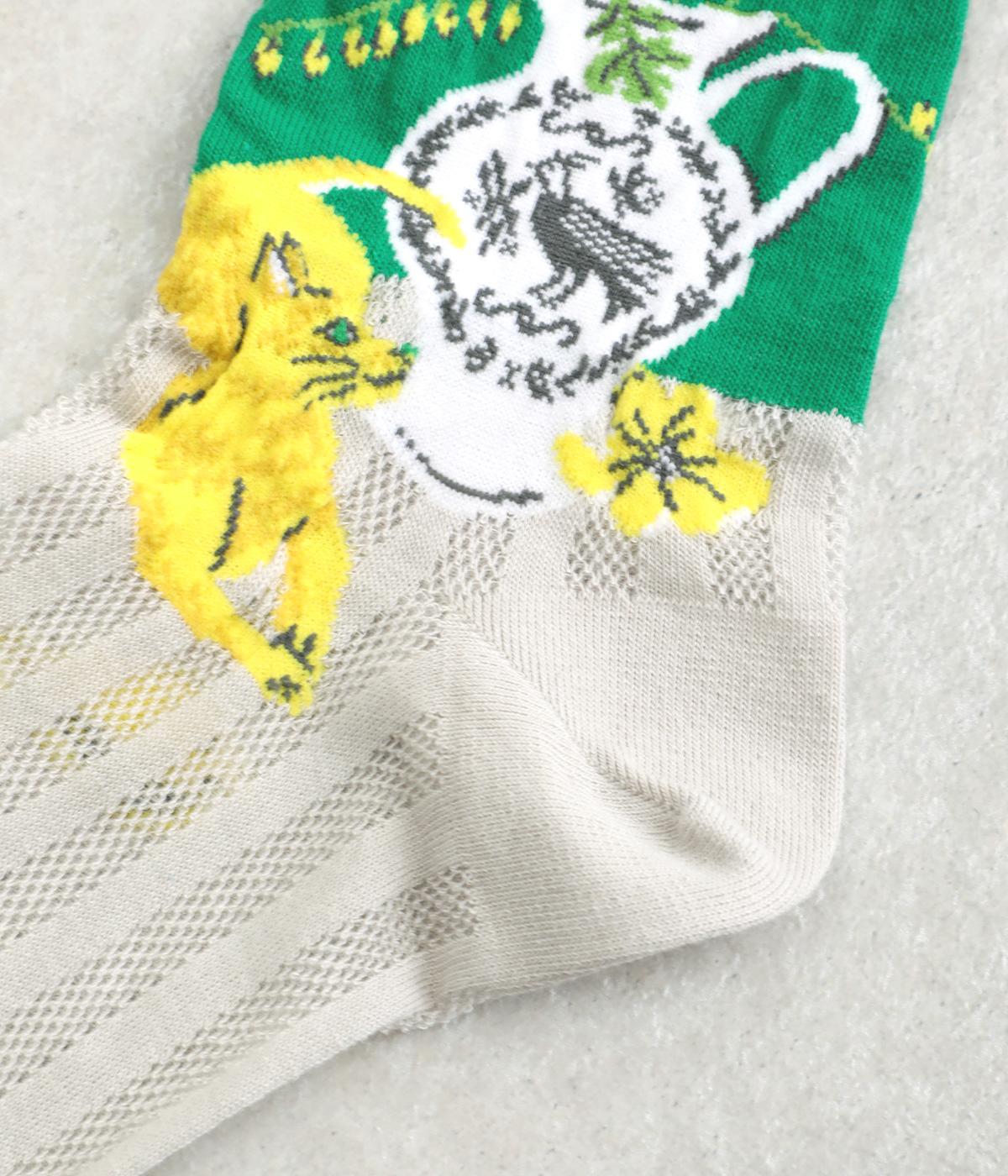 素敵な花瓶に入った美しく繊細なお花と、かわいらしいネコが描かれたソックス。とても華やかなデザインながらも、派手すぎず大人らしい配色が魅力です。足の甲と裏部分はシアー感があり、ムレにくく快適なはき心地を叶えてくれます。