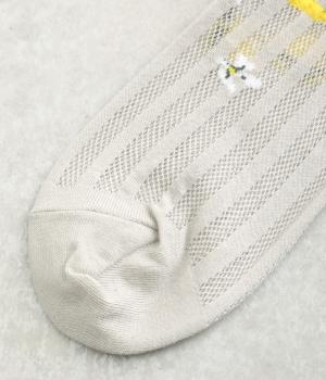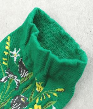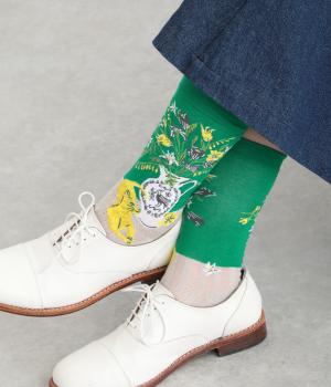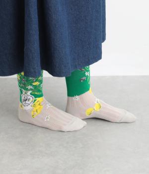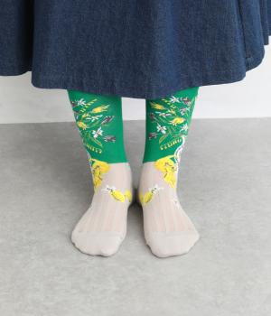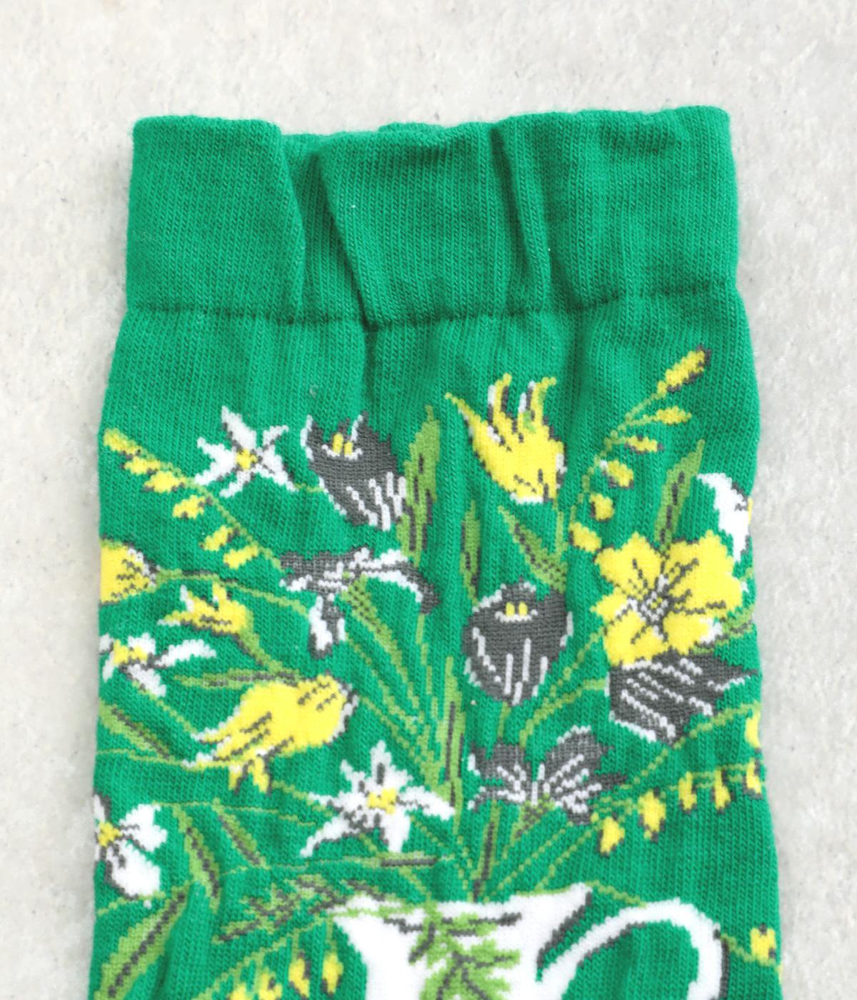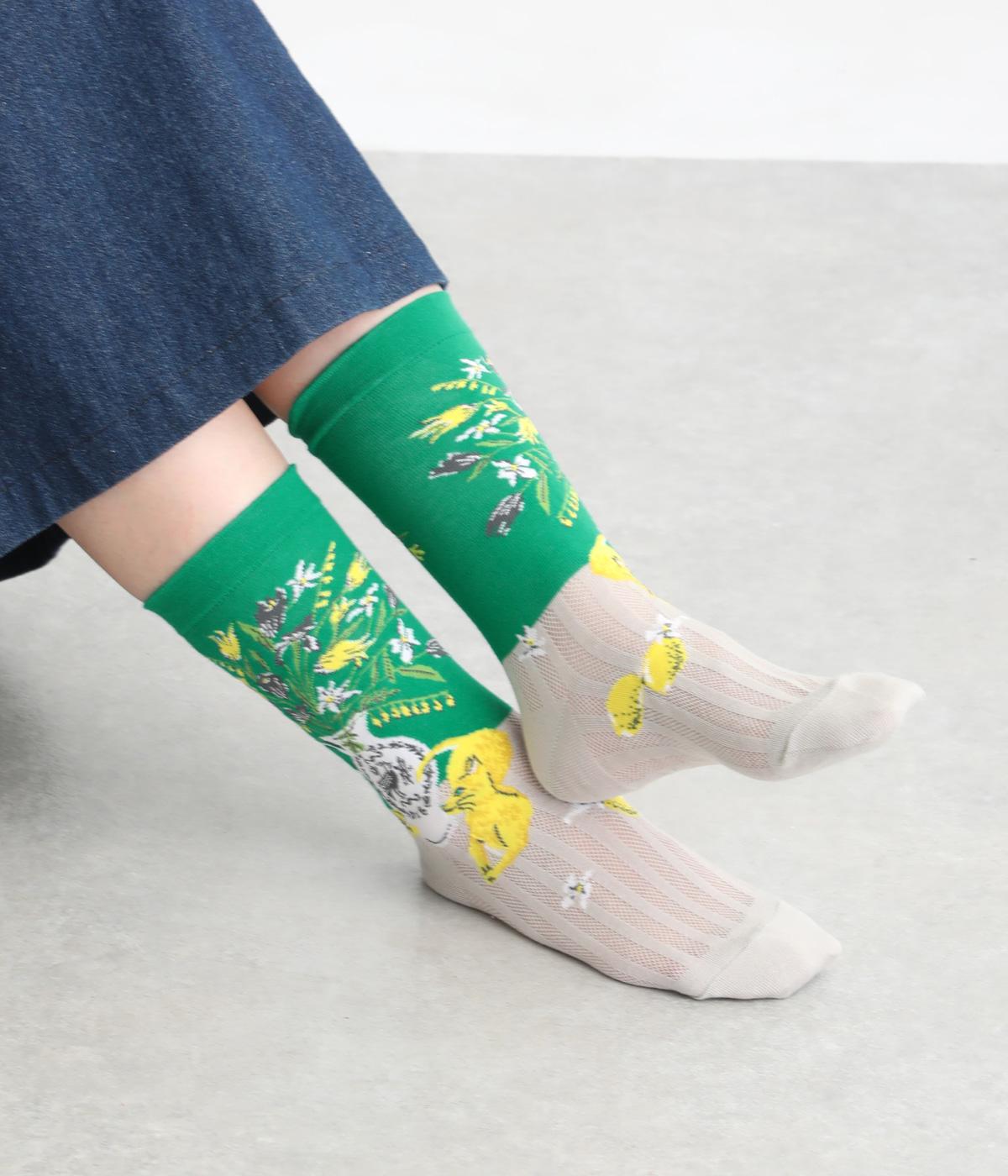 素敵な花瓶に入った美しく繊細なお花と、かわいらしいネコが描かれたソックス。とても華やかなデザインながらも、派手すぎず大人らしい配色が魅力です。足の甲と裏部分はシアー感があり、ムレにくく快適なはき心地を叶えてくれます。