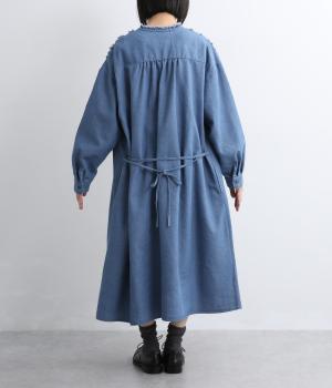 切りっぱなしのフリルを首元からあしらい、甘さとカジュアルさをバランスよく融合しました。顔まわりを明るく見せつつ、縦のラインを強調することで全体をすっきりと見せてくれます。ウエストにはブラウジングできる紐つきで、シルエットの調整も自在。一枚で着るのはもちろん、前をあけて羽織りとしても活躍します。