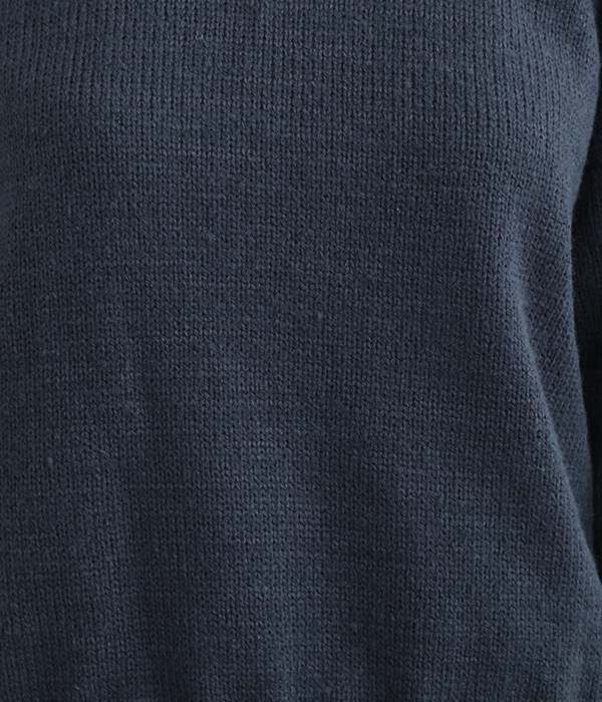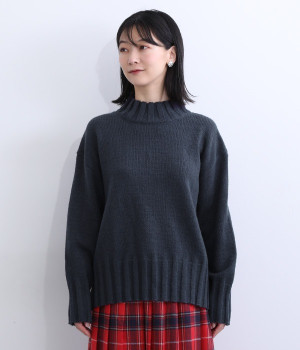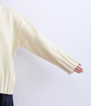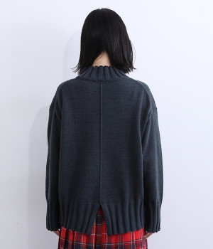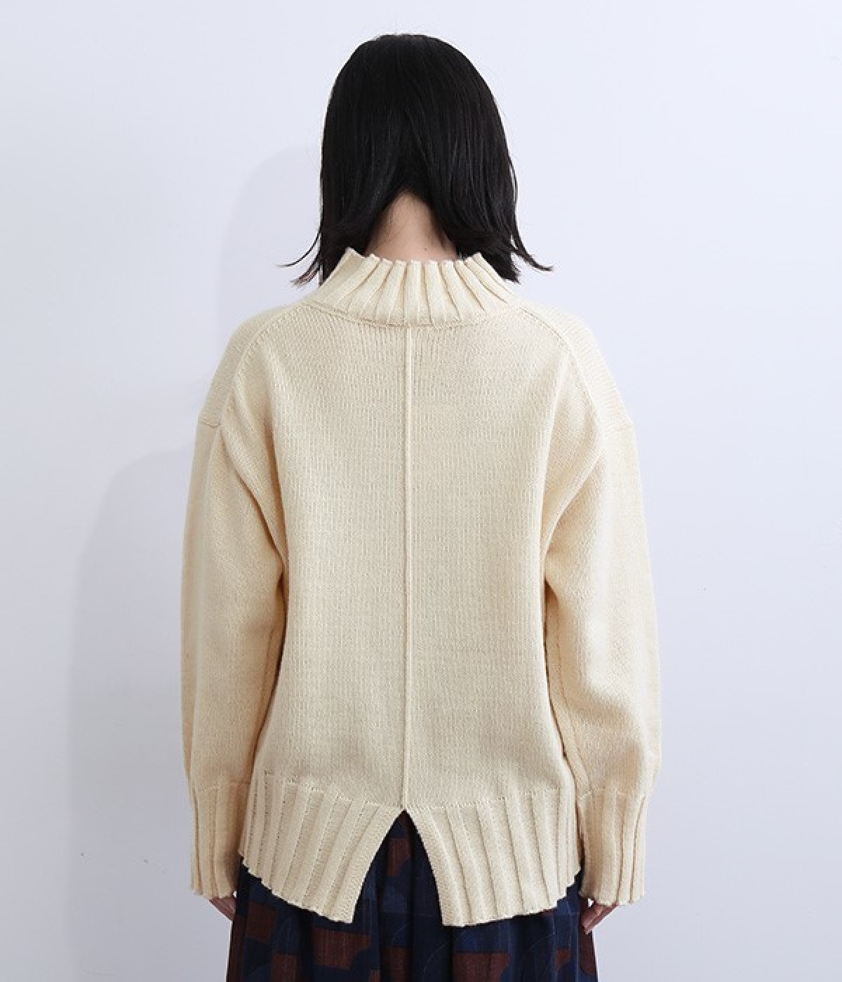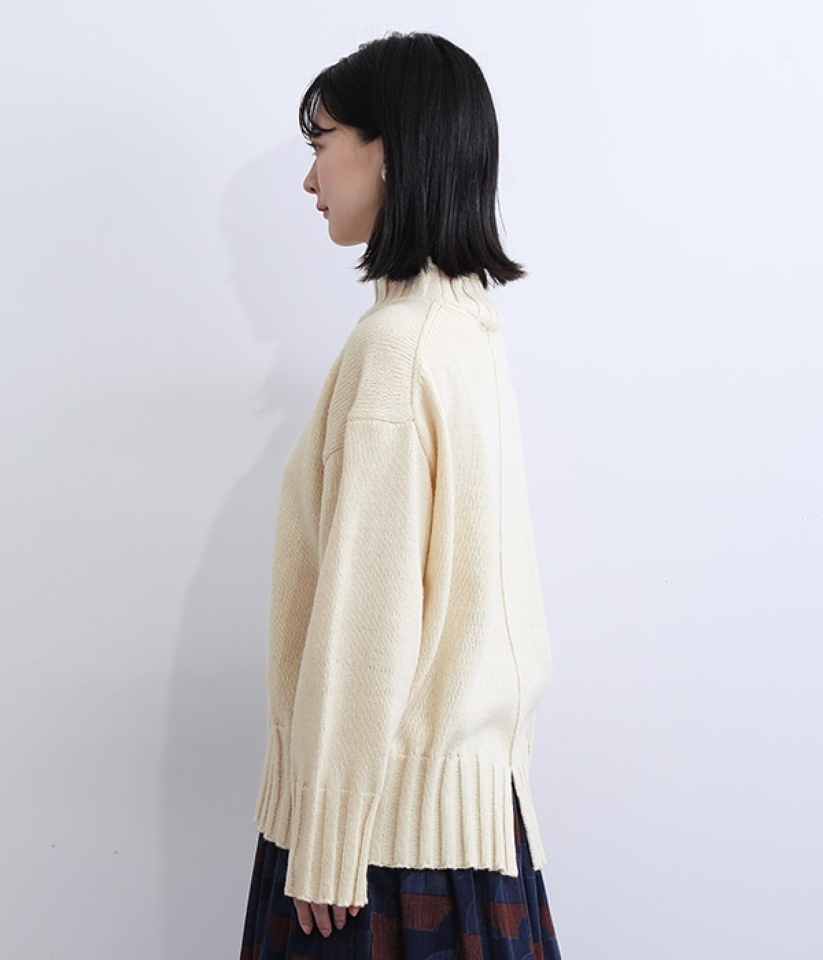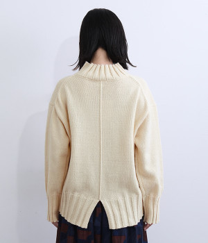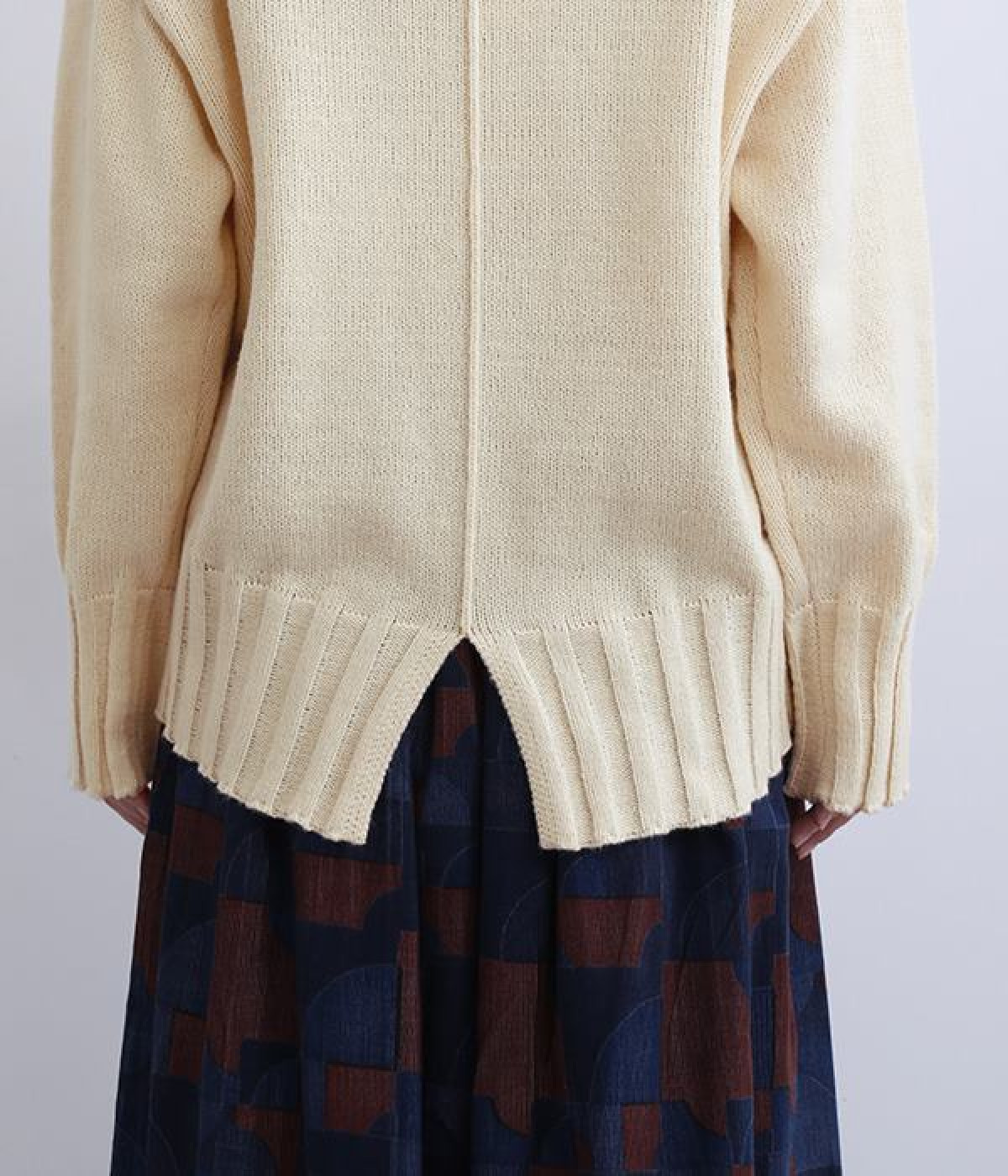 各パーツに入った幅広リブが抜群の存在感を放つプルオーバー。保温性に優れたバルキーアクリル×やわらかなピーチヤーンを組み合わせることで強度が増し、型崩れしにくい仕立てです。中肉厚でさほど厚みを感じないため、コートインのしやすさも◎。バックにはぱっくりとスリットを入れて、フロントとの見た目に変化をつけました。大きめのシルエットで華奢さが引き立つ工夫もしています。