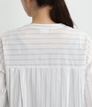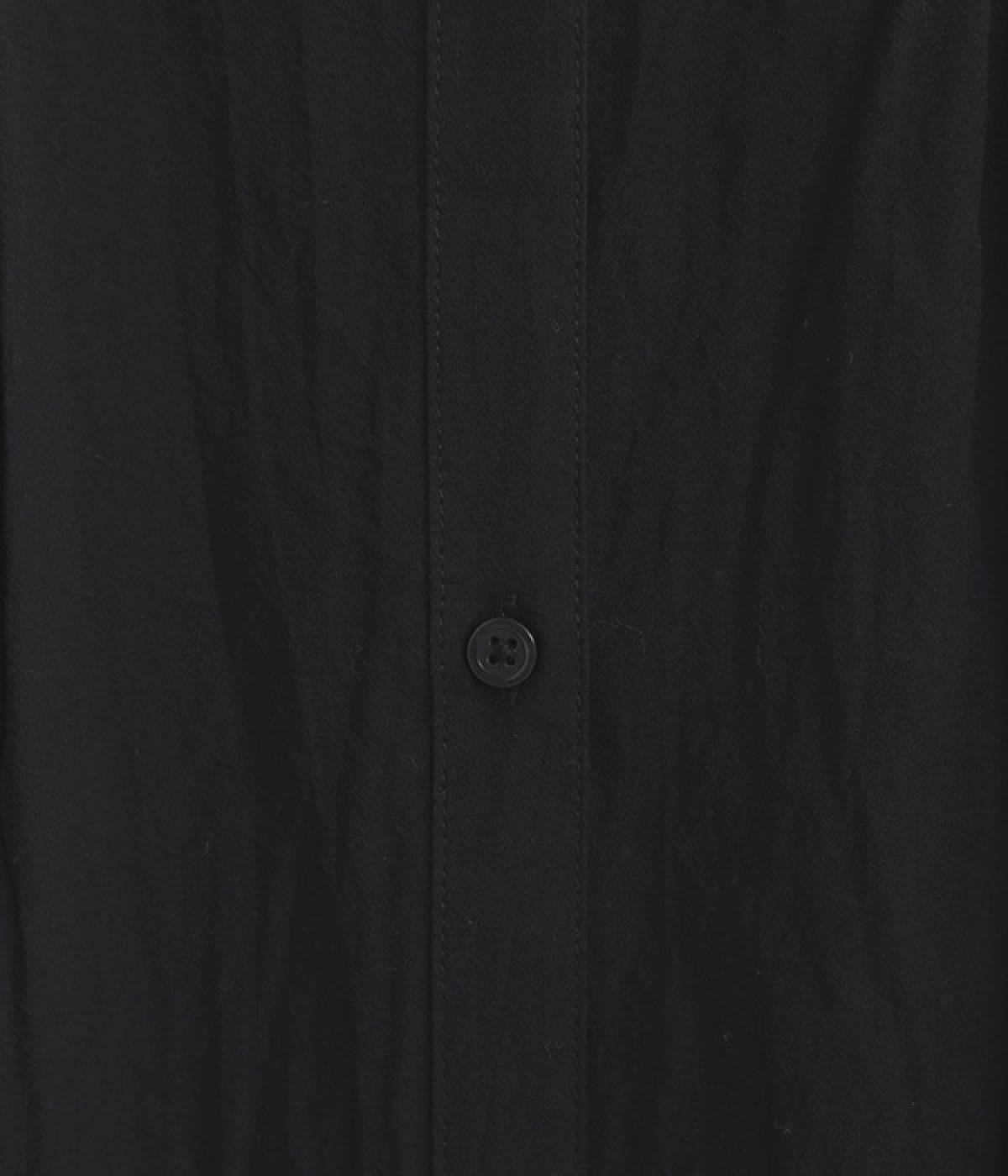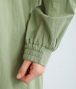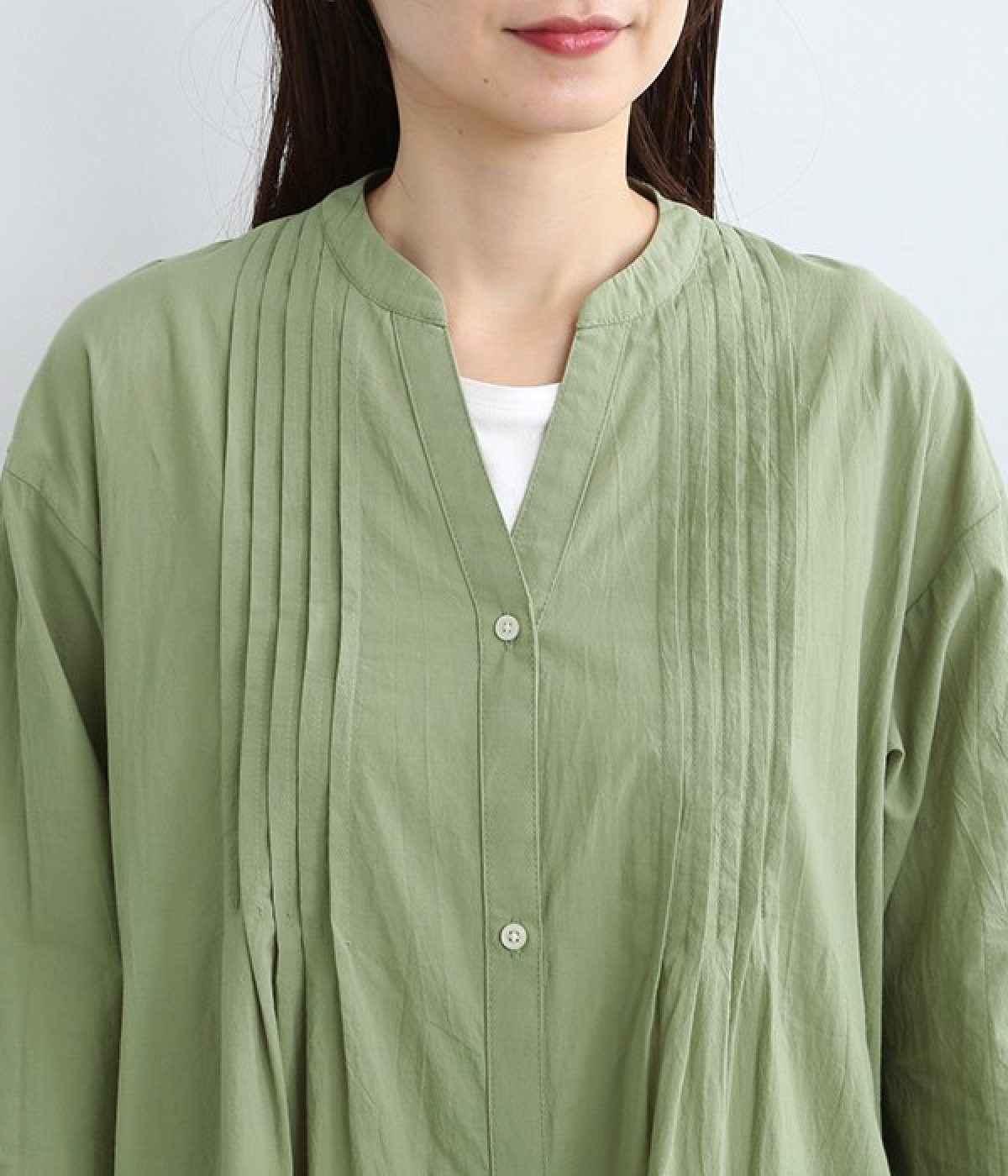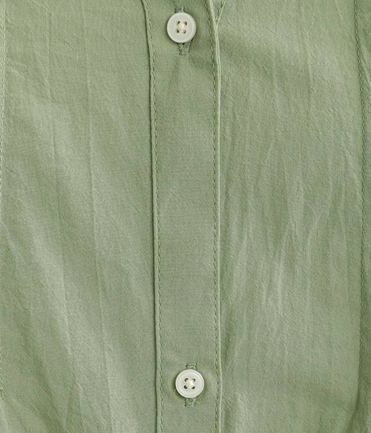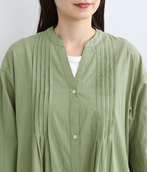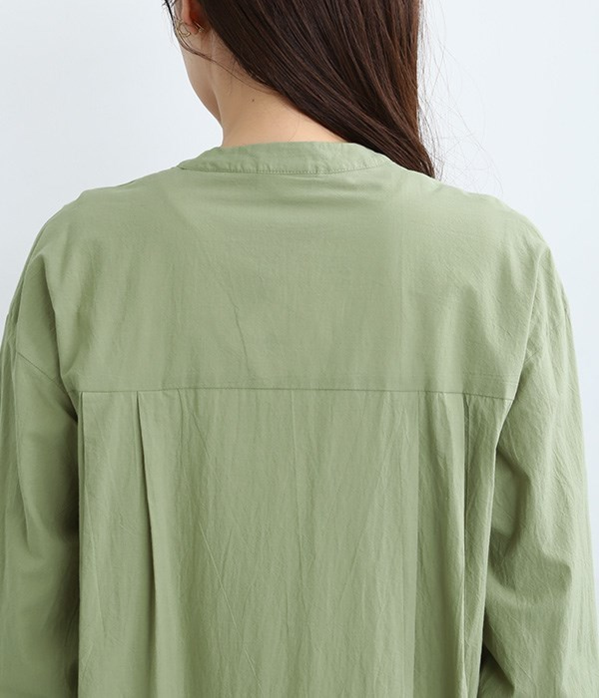 サンドウォッシュ加工という特殊な洗い加工を施した、細やかな凹凸のあるコットン生地を使用。やわらかくナチュラルな素材の表情が、ニュアンスたっぷりの着こなしに仕上げてくれます。ネックの開きとタック使いが大人っぽく、抜け感のある印象に。袖口には部分的にゴムを入れているので、たくし上げたアレンジも楽しめます。ゆったりとしたシルエットで着心地がよく、羽織りものとしても着まわすことができます。