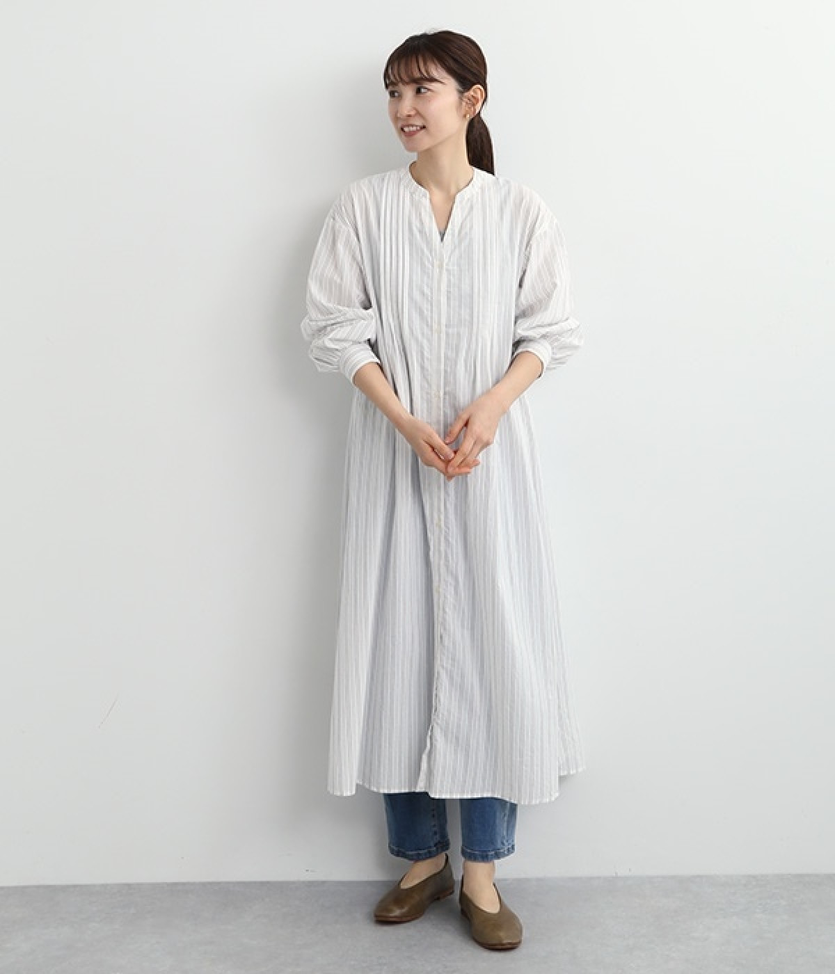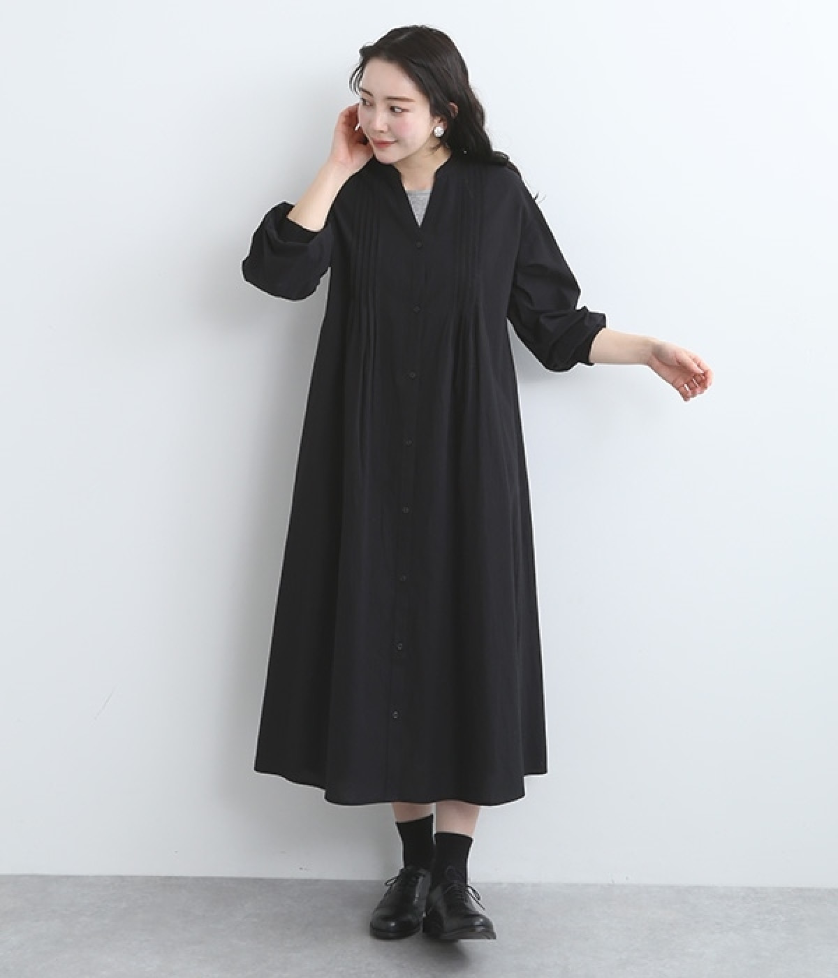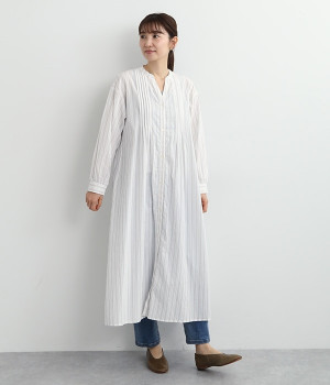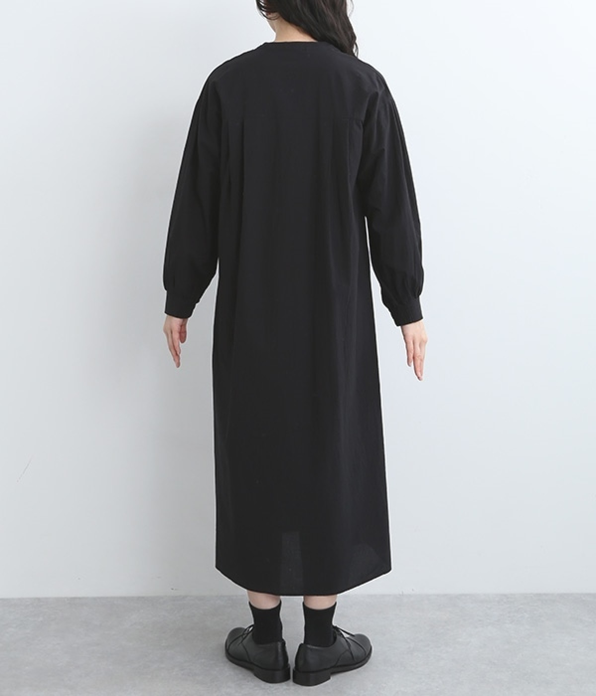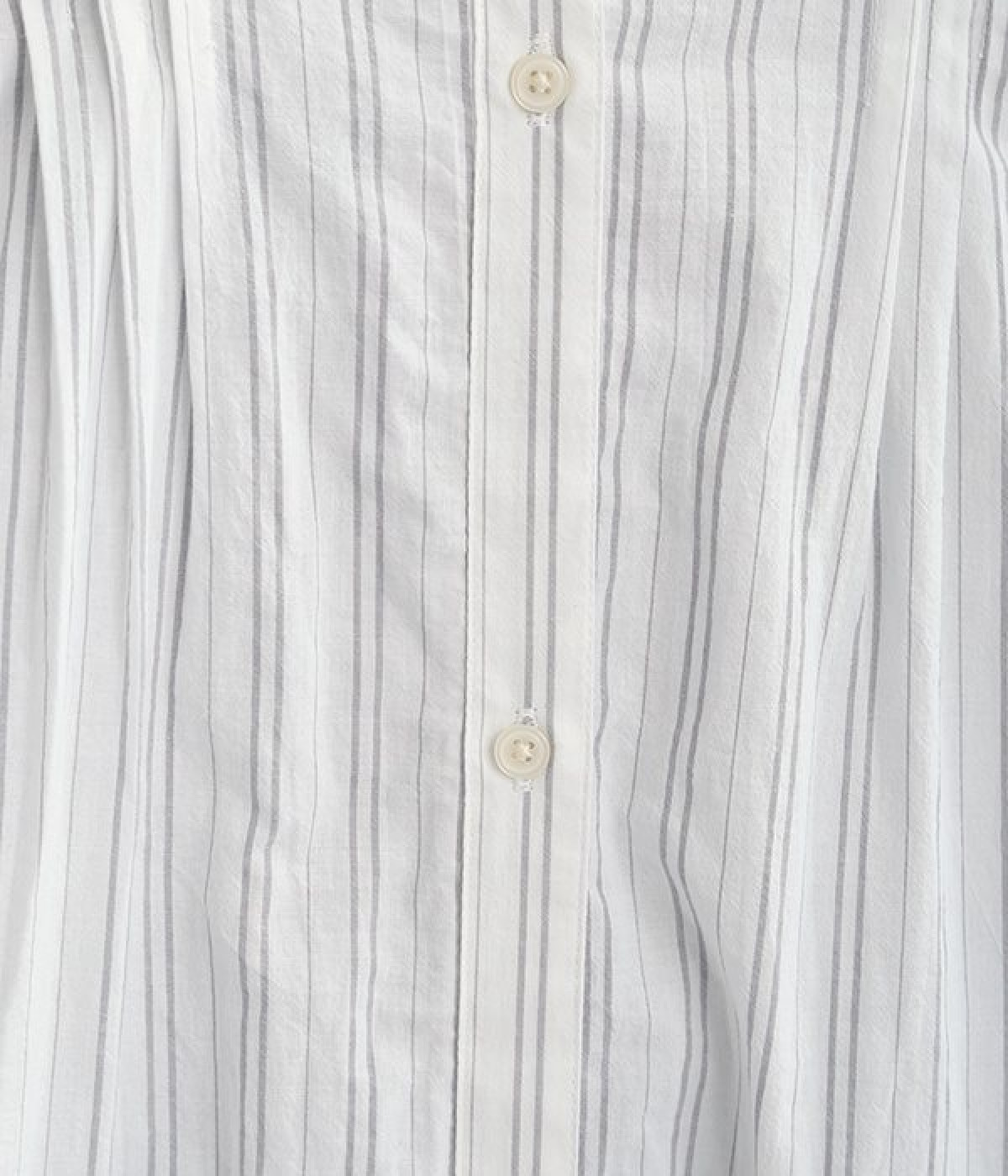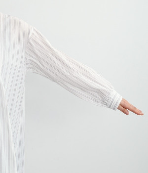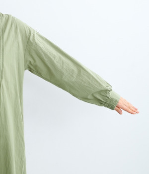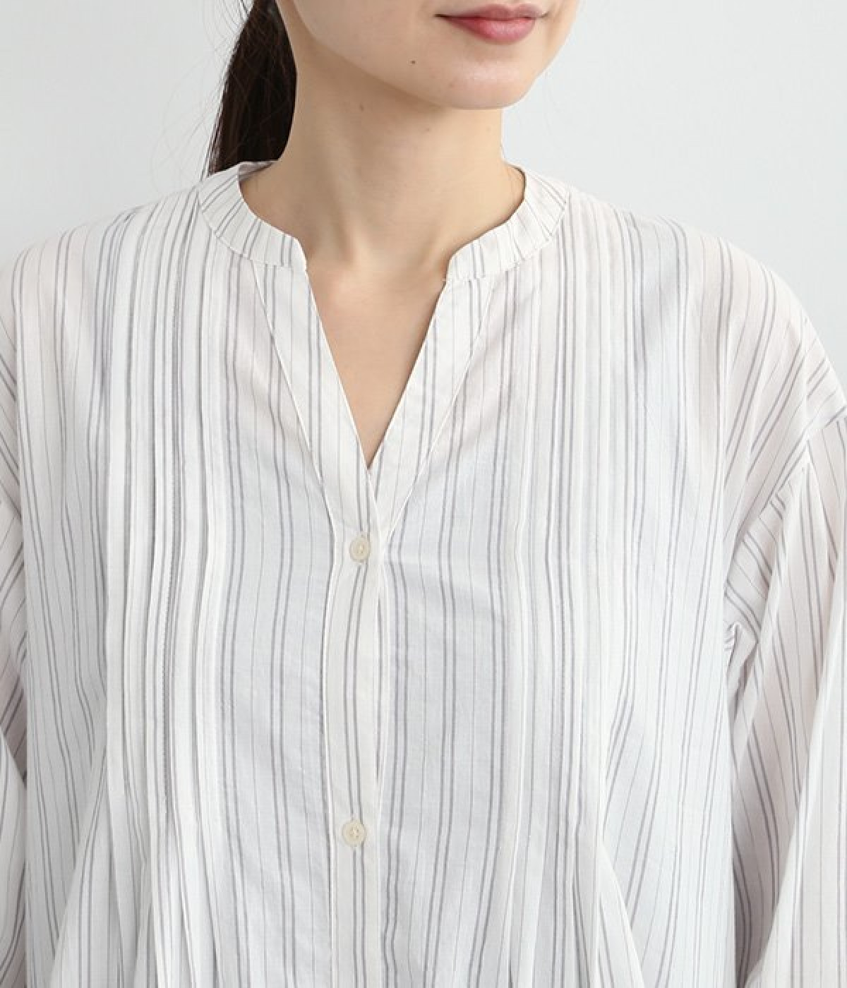 サンドウォッシュ加工という特殊な洗い加工を施した、細やかな凹凸のあるコットン生地を使用。やわらかくナチュラルな素材の表情が、ニュアンスたっぷりの着こなしに仕上げてくれます。ネックの開きとタック使いが大人っぽく、抜け感のある印象に。袖口には部分的にゴムを入れているので、たくし上げたアレンジも楽しめます。ゆったりとしたシルエットで着心地がよく、羽織りものとしても着まわすことができます。