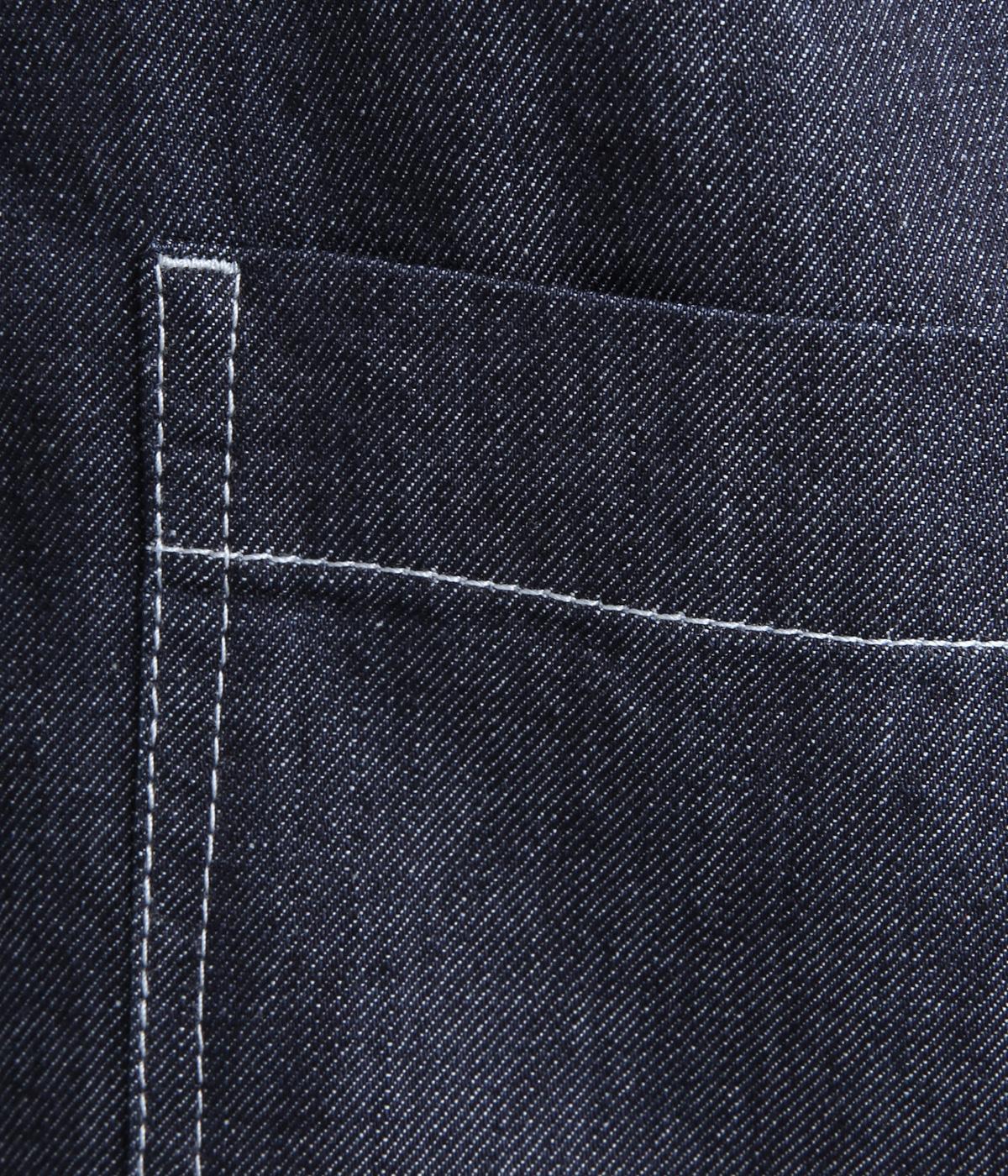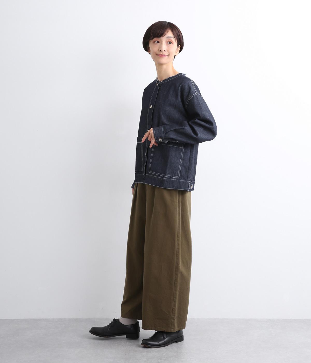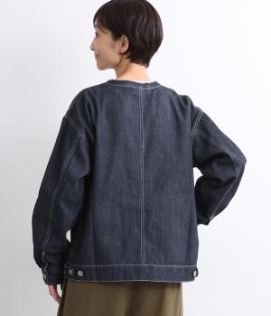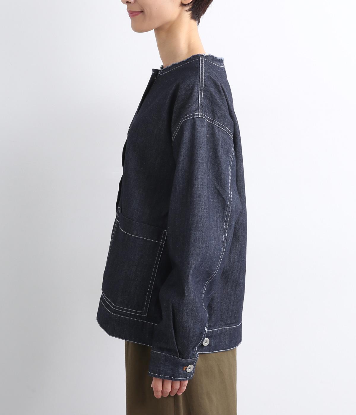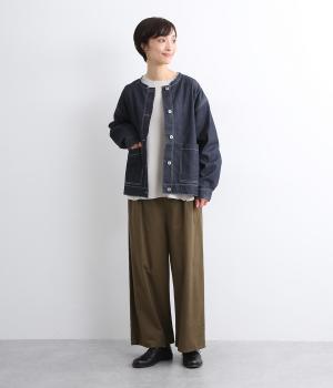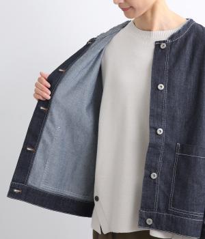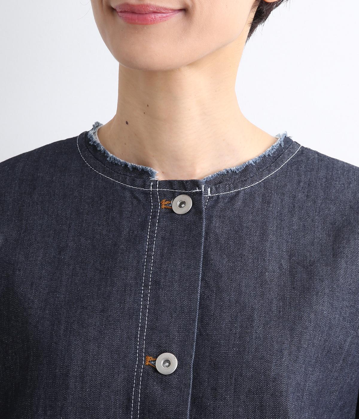 適度なハリと、ドライな肌ざわりが特徴的なコットン混紡デニム生地を使用しました。軽い羽織りものになる中肉厚生地で、ロングシーズン着まわしができます。