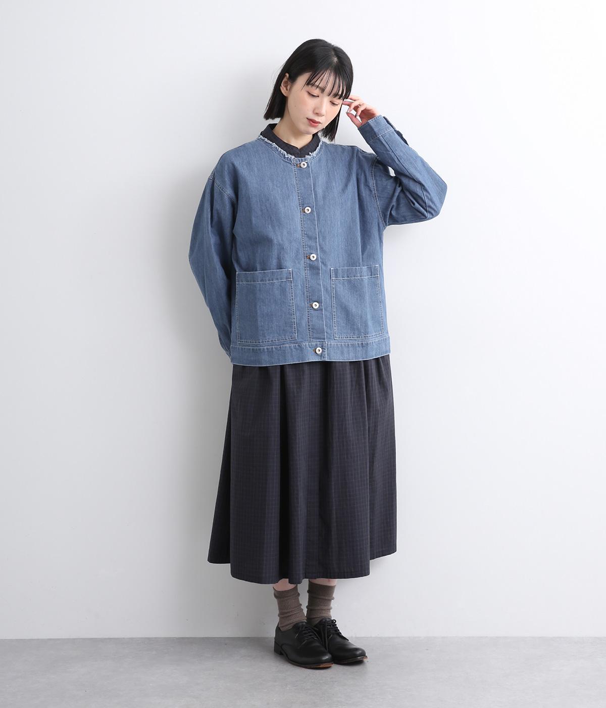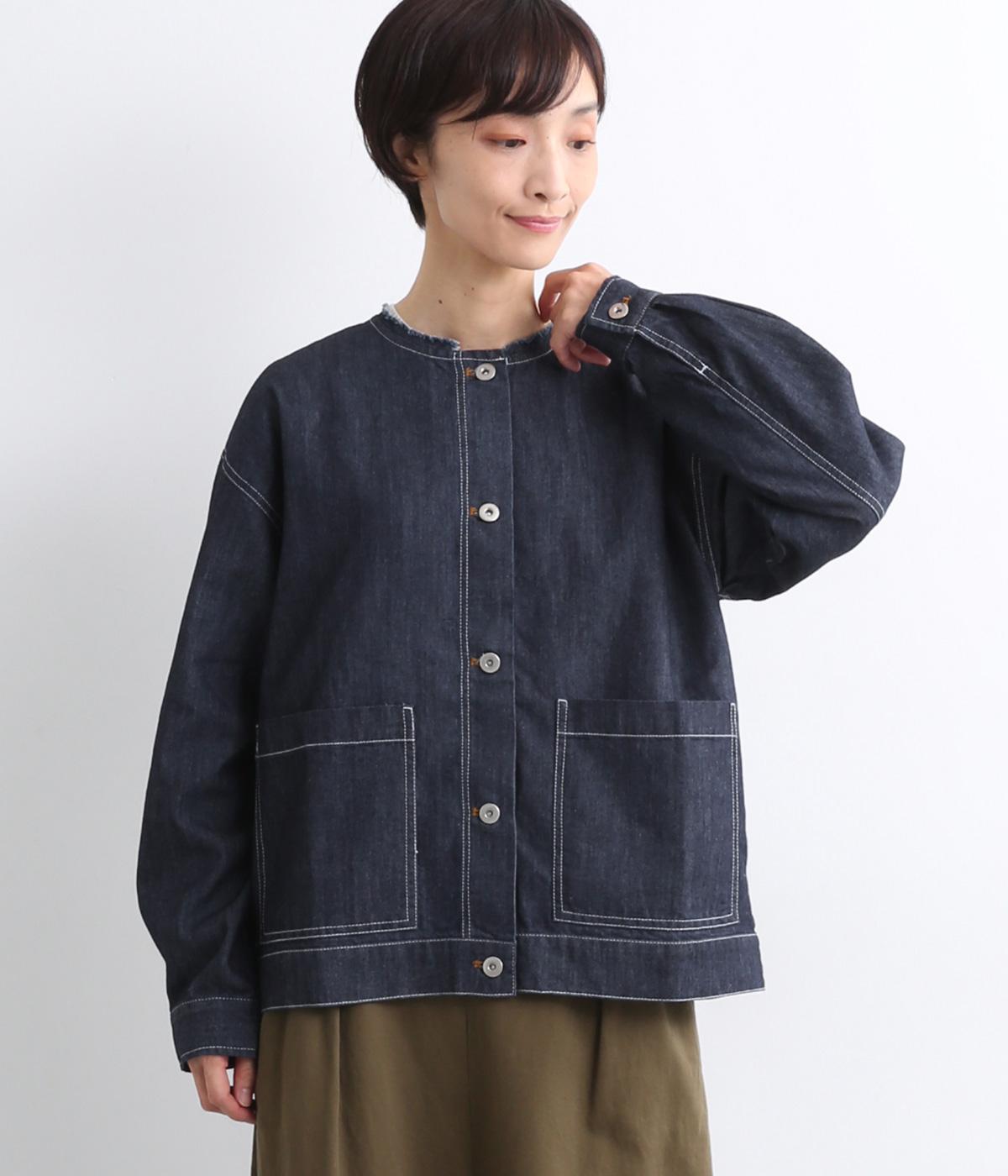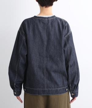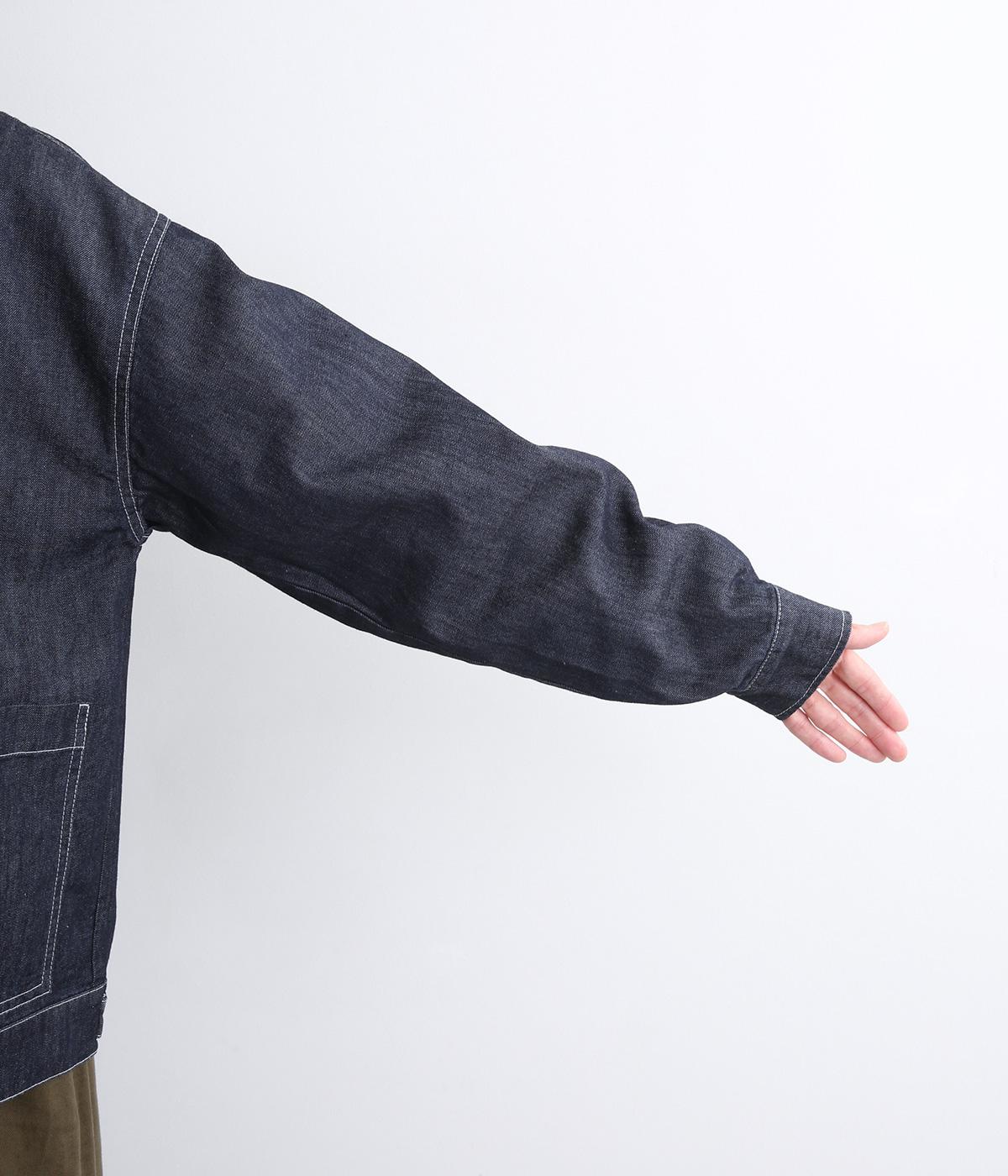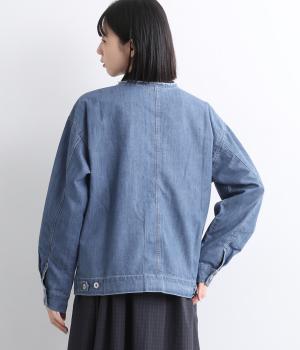 適度なハリと、ドライな肌ざわりが特徴的なコットン混紡デニム生地を使用しました。軽い羽織りものになる中肉厚生地で、ロングシーズン着まわしができます。