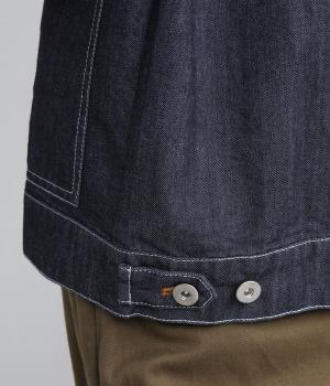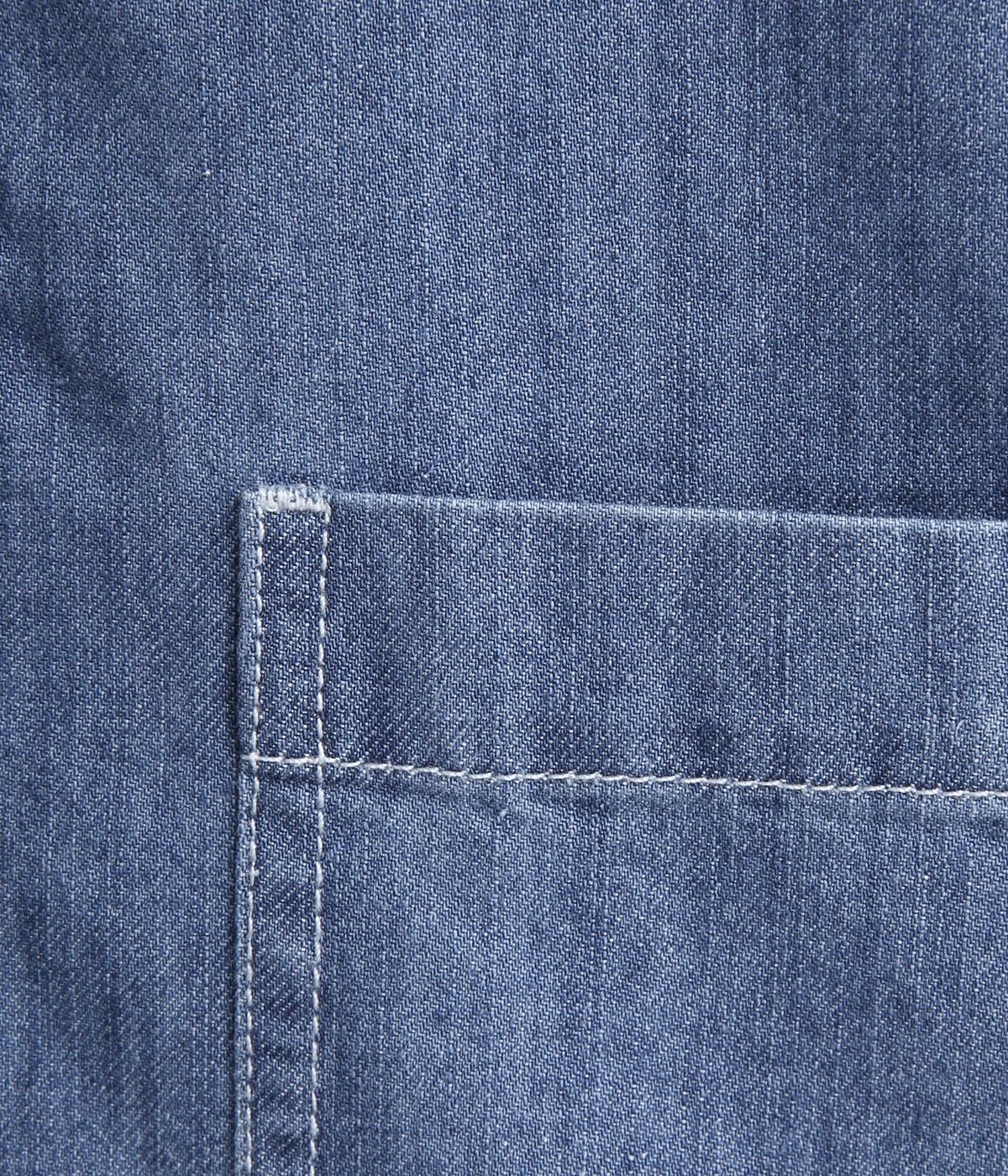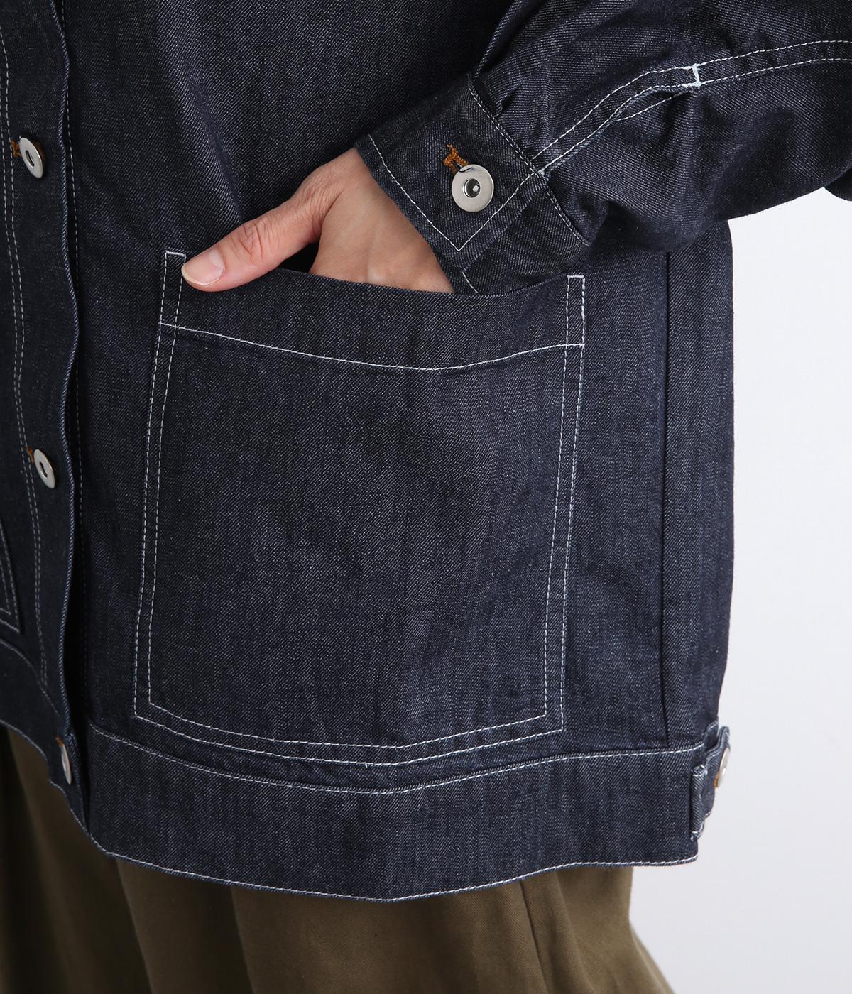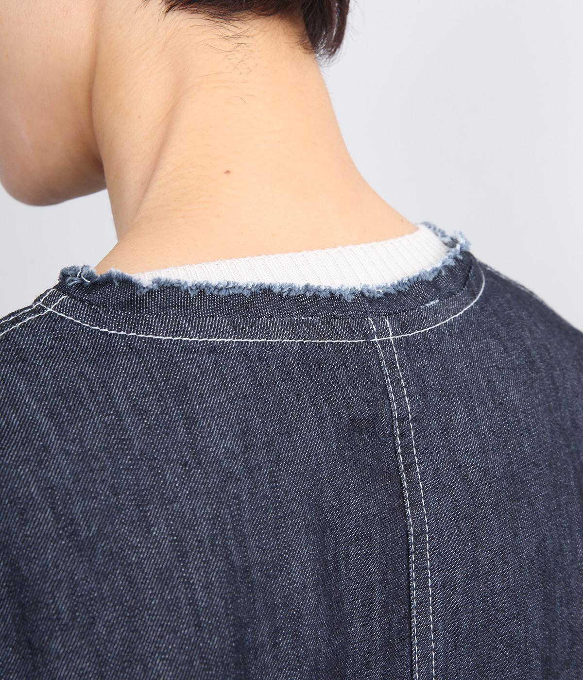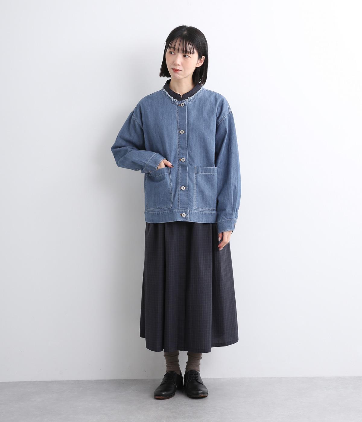 適度なハリと、ドライな肌ざわりが特徴的なコットン混紡デニム生地を使用しました。軽い羽織りものになる中肉厚生地で、ロングシーズン着まわしができます。
