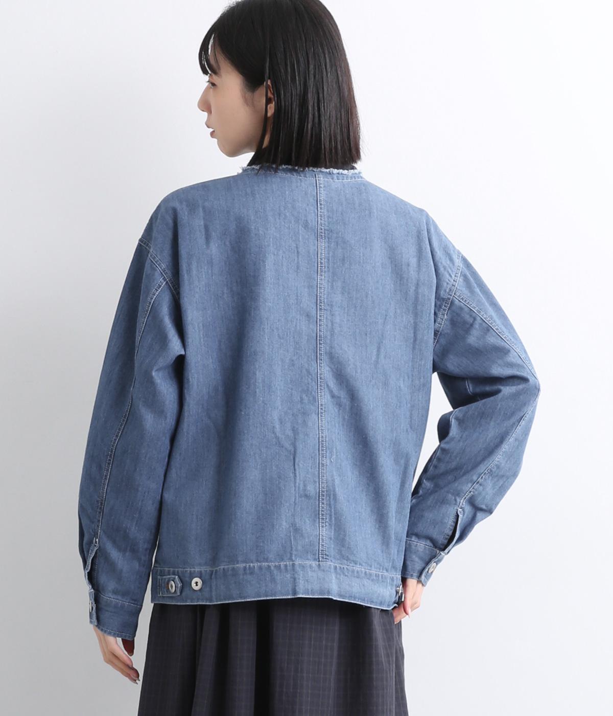 ステッチをきかせデニム生地の良さをいかしたジャケットです。程よくゆったりしたサイズでありつつも、ルーズになり過ぎないシルエット。フロントの大きなポケットや裁ち切り仕様の首元がポイントに。